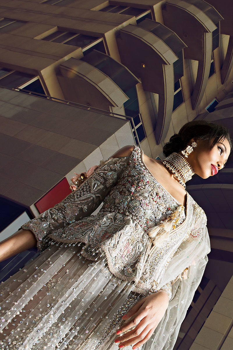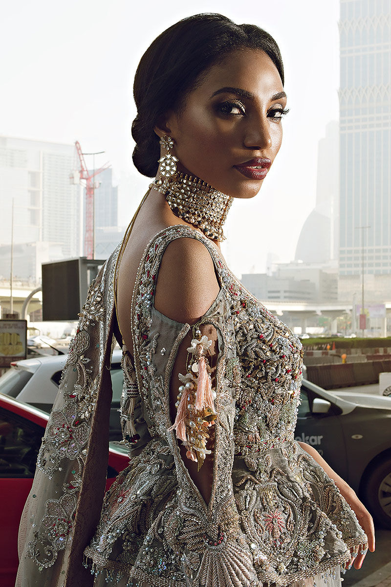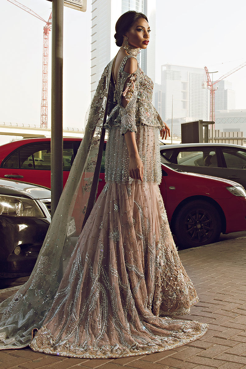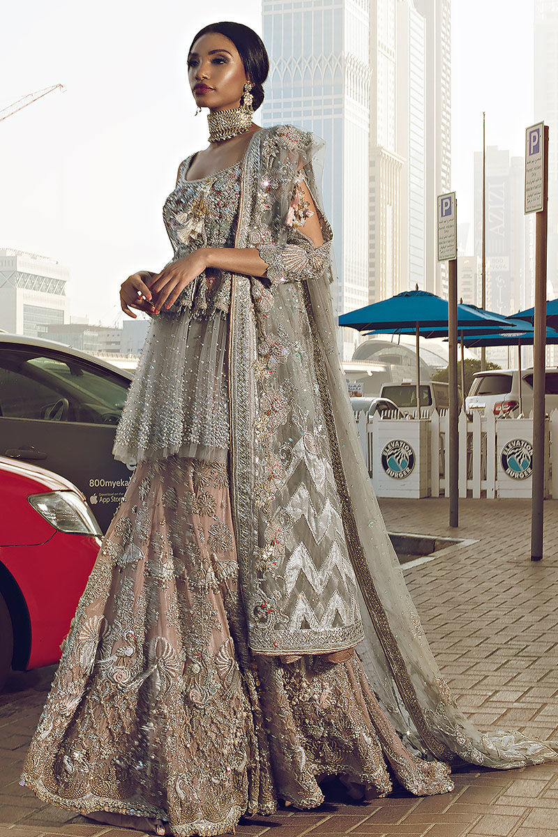 Shimmer grey hand worked peplum paired with dusty pink hand workedlehnga and grey hand worked dupatta.