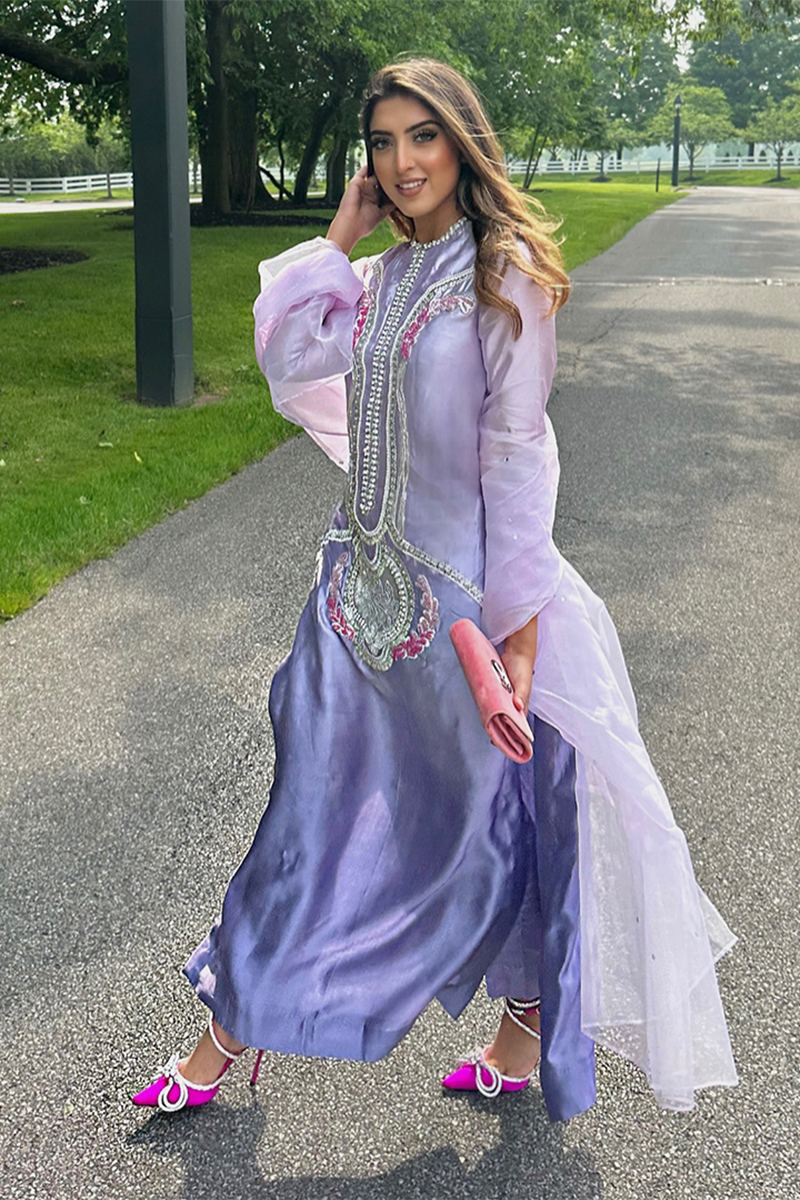 Experience the exquisite charm of Violet Mist, an incredible outfit that brims with sophistication and fascination. The long shirt and cigarette trousers in this gorgeous combination were diligently made from the finest tissue silk and luxurious  Thai silk. The gorgeous lavender ombre hue flows from delicate hues to deeper tones, casting an astonishing effect. The outfit is embellished with dazzling pearls, sparkling crystals, and Swarovski stones and has a brilliant fusion of machine stitching and hand ornamentation. The long shirt's high slits give it a contemporary edge while maintaining its classic grace.