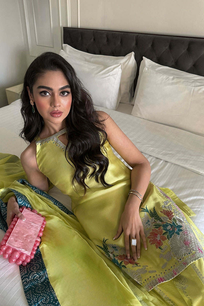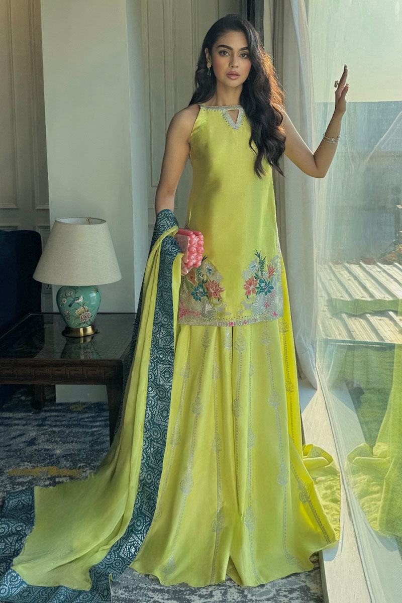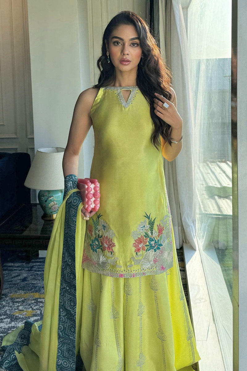 Adorned in the resplendent hues of lime yellow, 'Finch' epitomizes sartorial elegance. The sleeveless cut of the embroidered short tissue silk shirt harmonizes with the opulence of flared panelled trousers, meticulously crafted from Thai silk, featuring a mesmerizing metallic silver block printing design. Completing this ethereal ensemble is a silk dupatta, adorned with teal-colored block-printed borders, invoking an aura of regal sophistication.