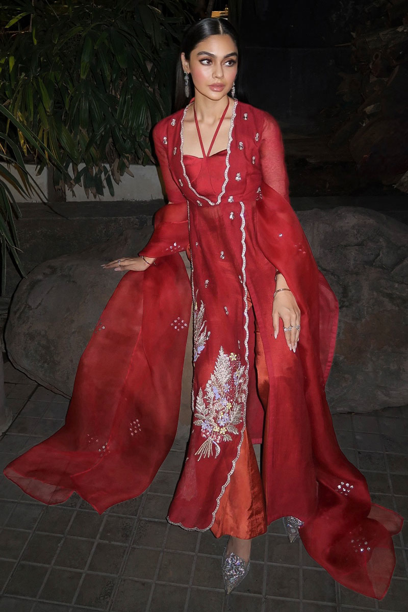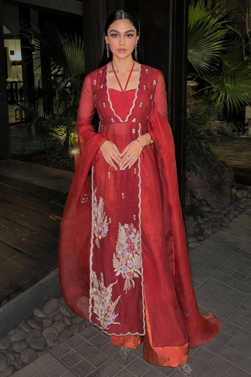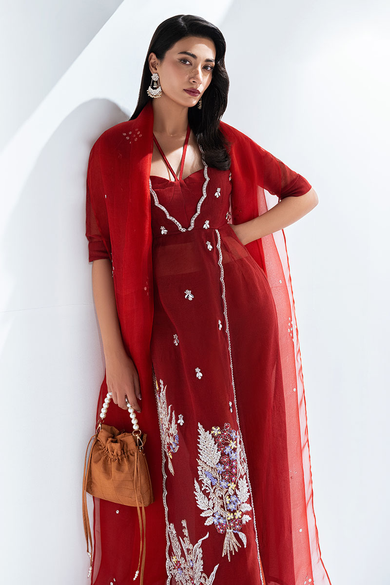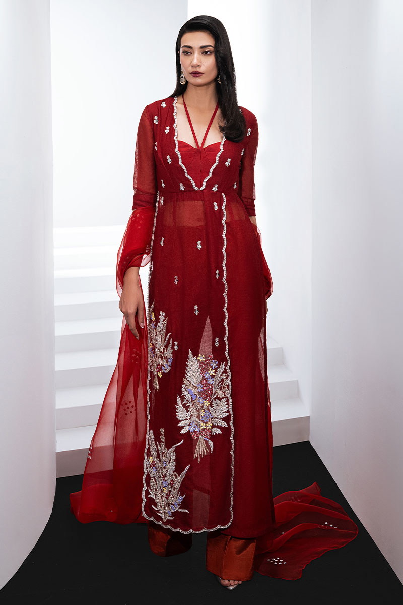 Make an unforgettable entrance in "Flower Bunch". A V-neck panelled dress with scalloped front and side slits, adorned with intricate hand embroidery and paired with a boot cut trouser in luxurious Thai silk. Complete with an embellished organza dupatta, this ensemble epitomizes sophistication and charm in every stitch.