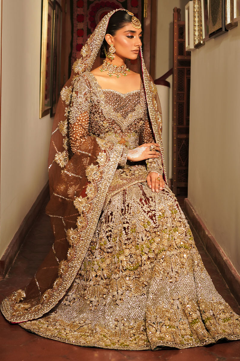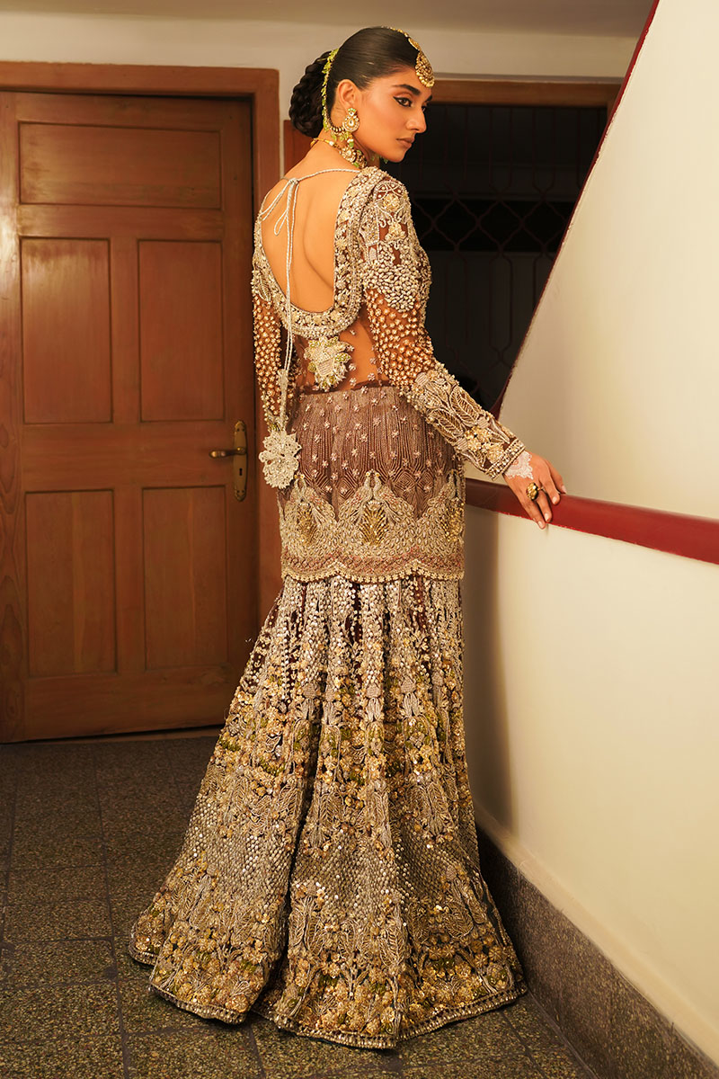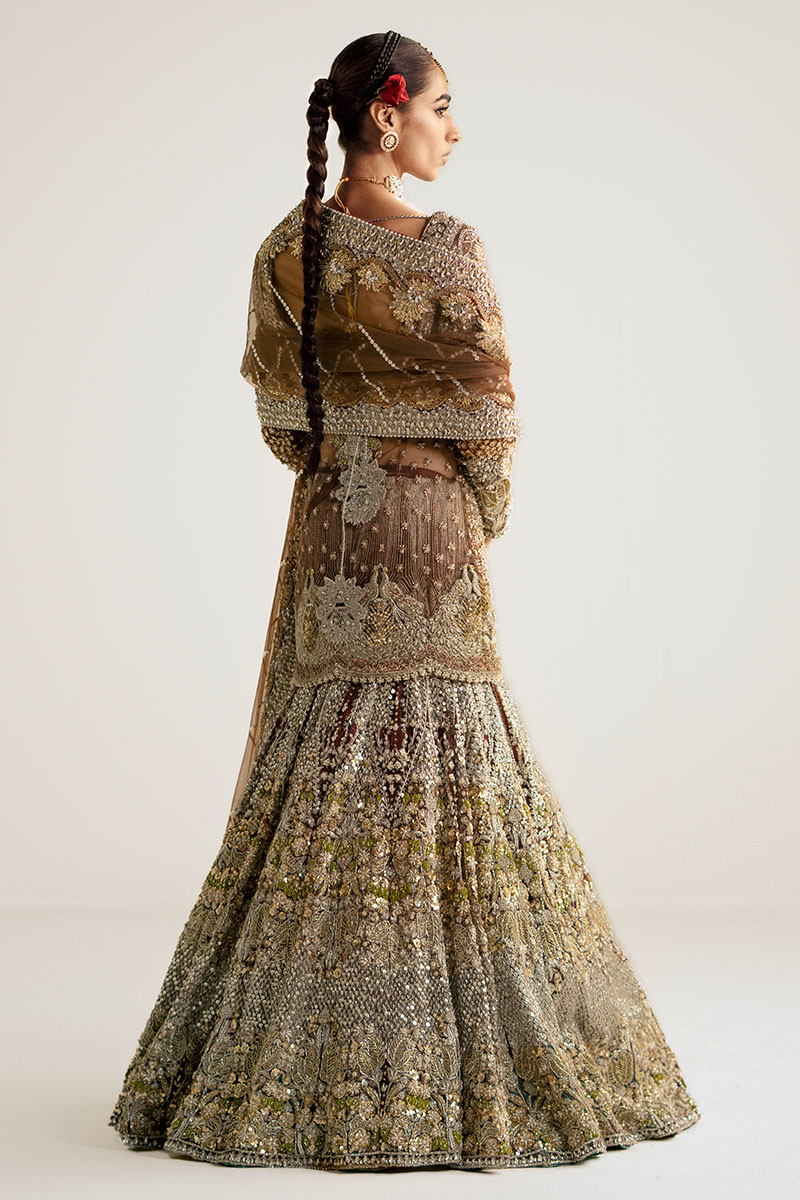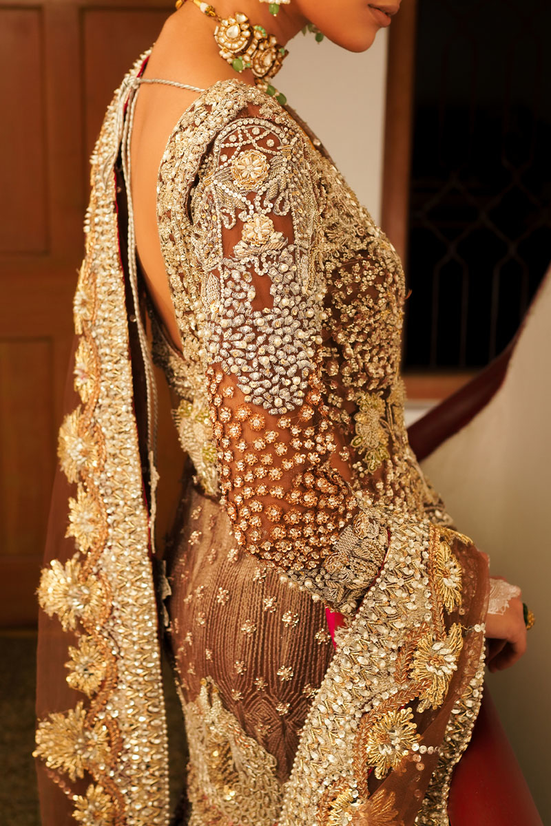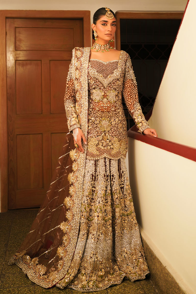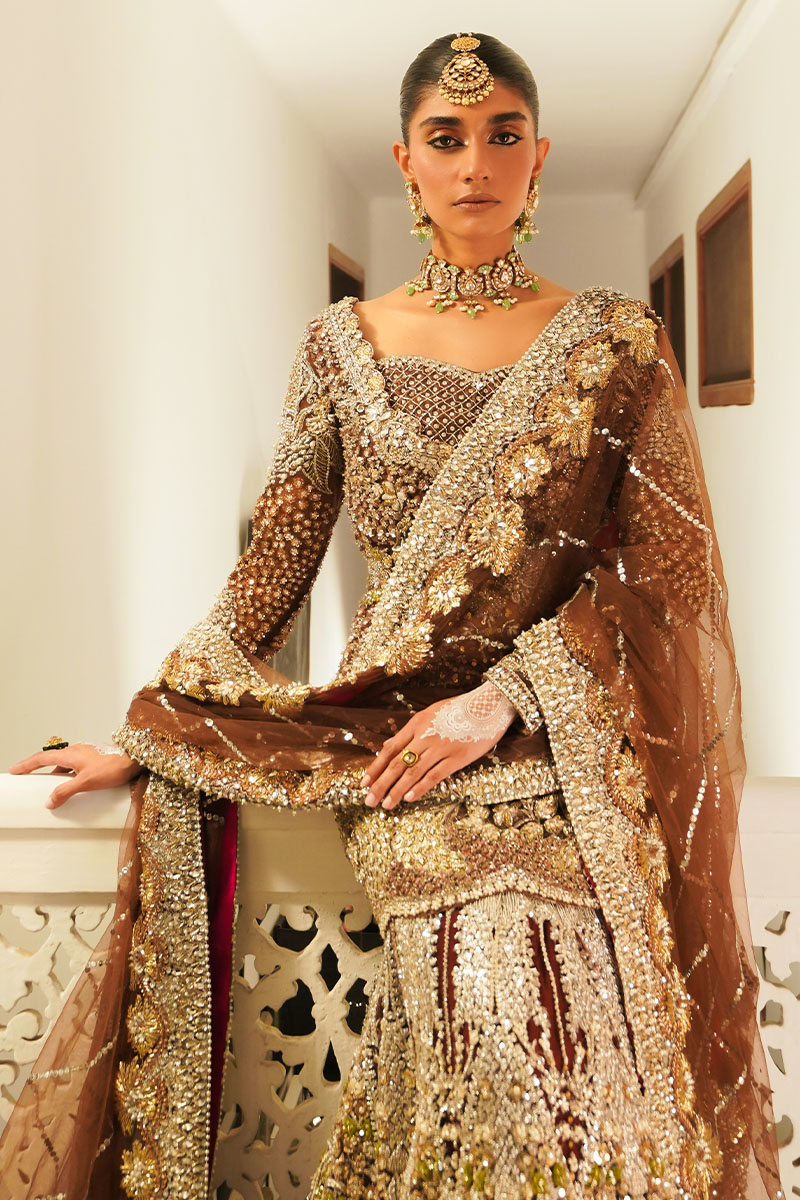 A dazzling showstopper deep brown colored ensemble is a masterpiece of intricate hand embellishment. The fully hand-embellished shirt, mermaid cut lehnga, and four-sided border dupatta adorned with nakshi dabka, sequins, crystals, and stones exude elegance and modern charm. The fitted shirt features a sweetheart embellished neckline and fitted full sleeves, while the back boasts a deep embellished round neck. Ideal for brides seeking a blend of timeless elegance and contemporary style.