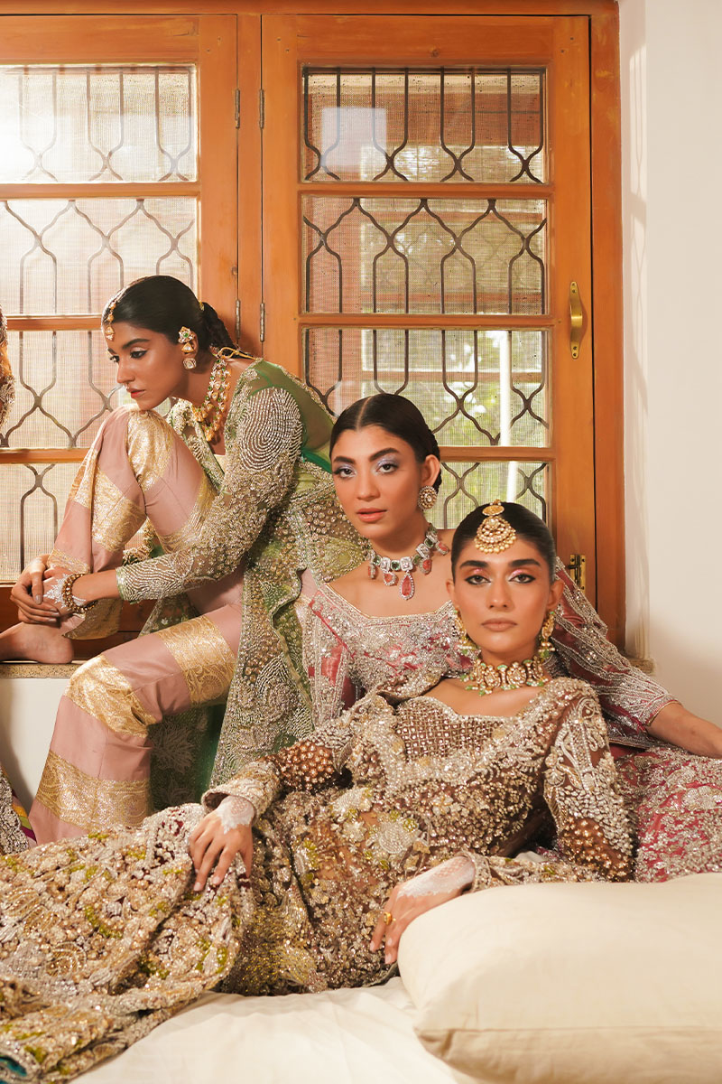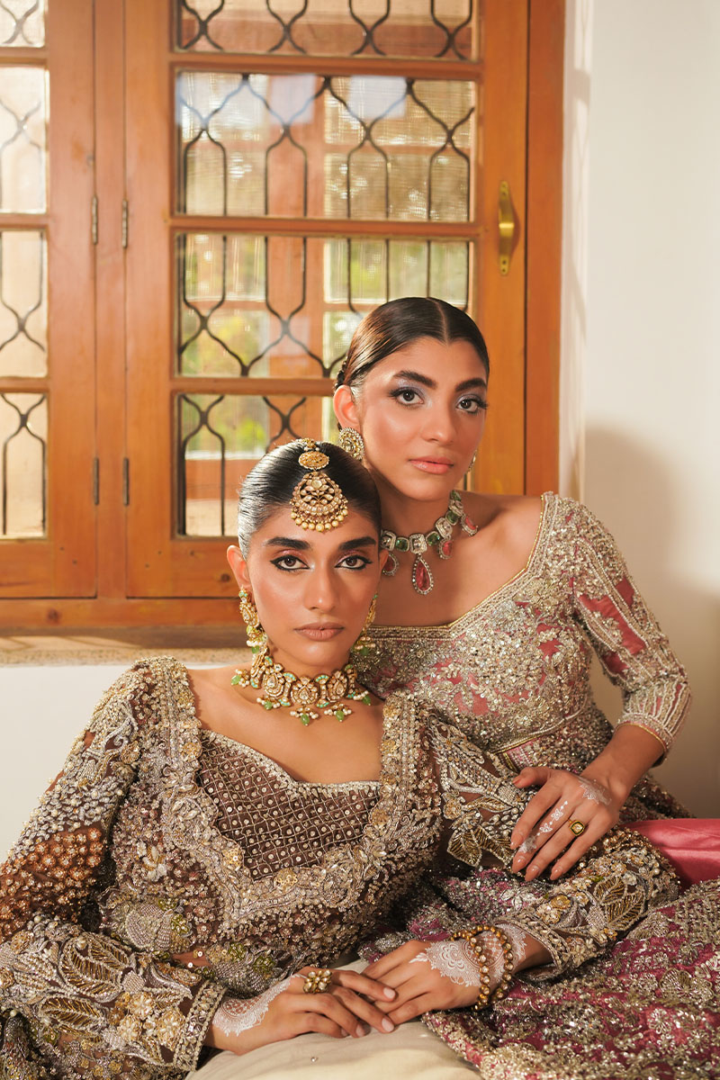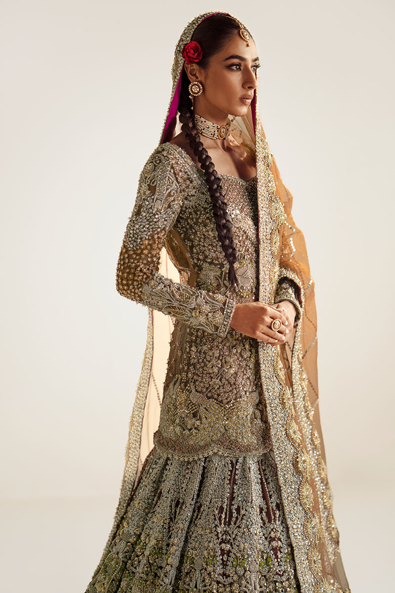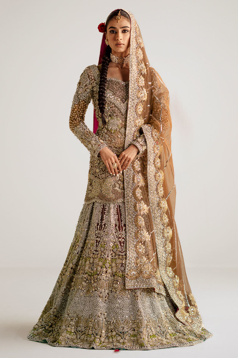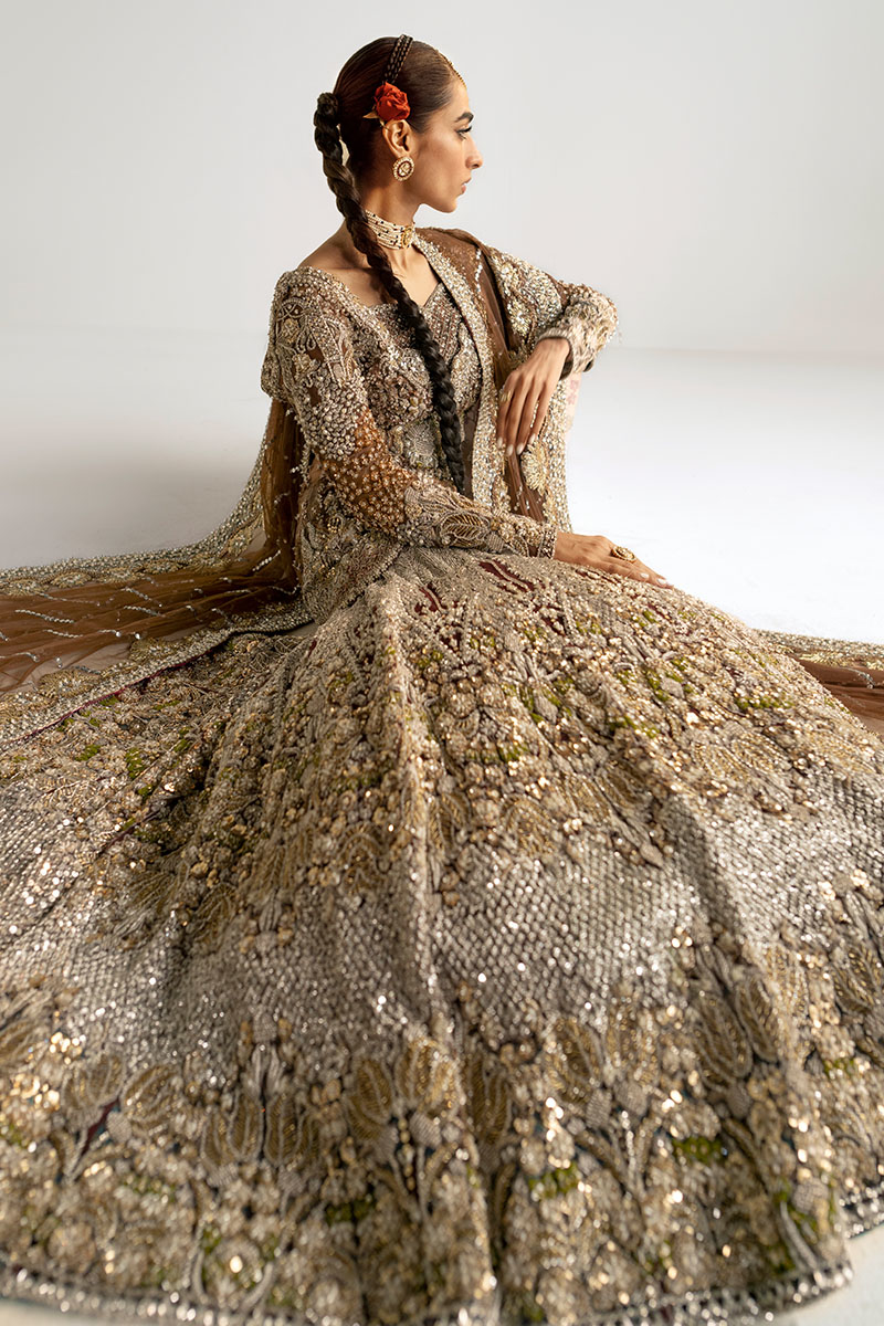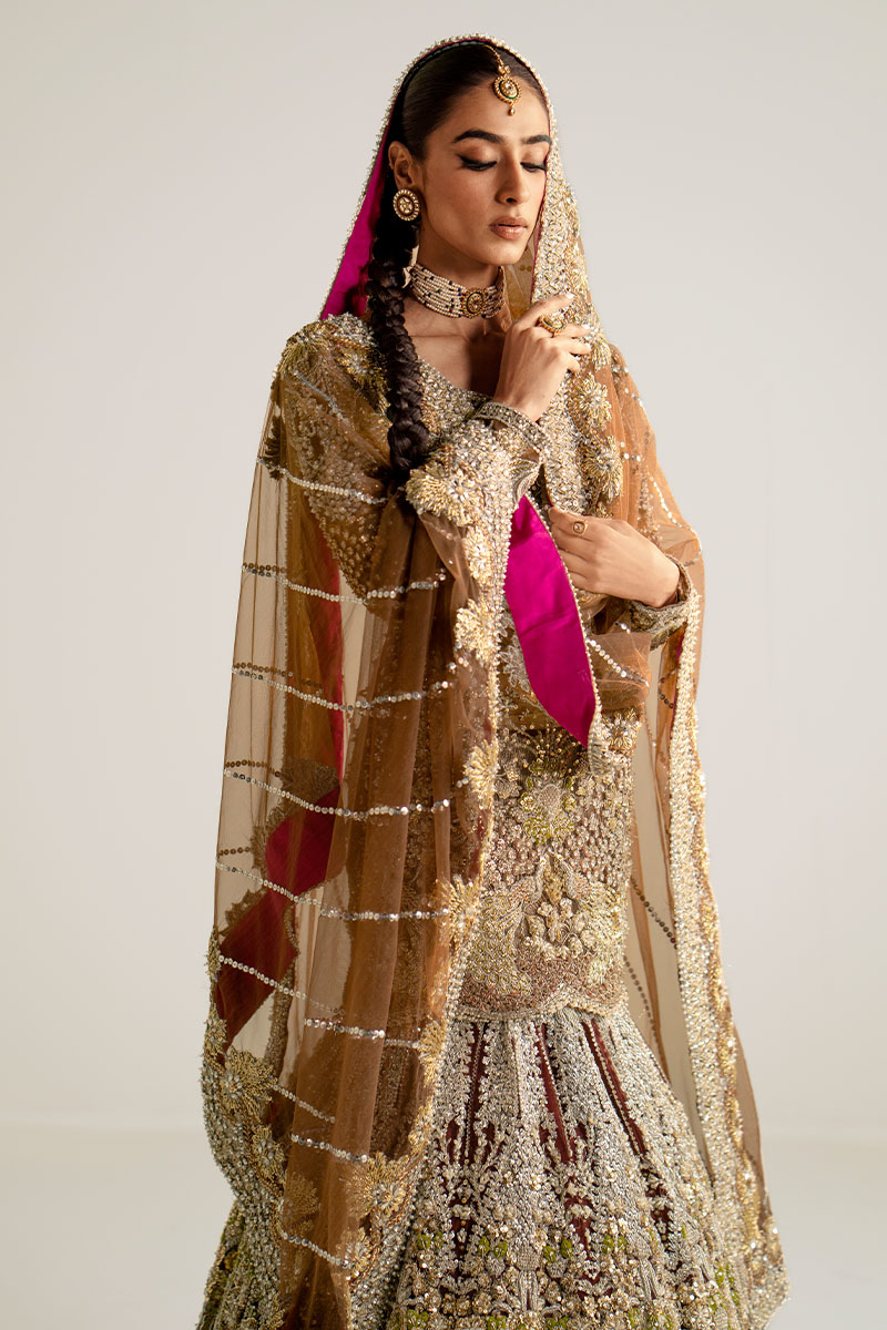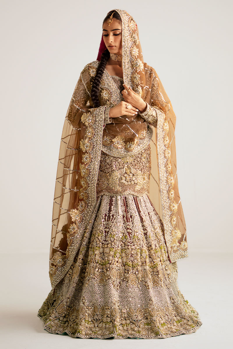 A dazzling showstopper deep brown colored ensemble is a masterpiece of intricate hand embellishment. The fully hand-embellished shirt, mermaid cut lehnga, and four-sided border dupatta adorned with nakshi dabka, sequins, crystals, and stones exude elegance and modern charm. The fitted shirt features a sweetheart embellished neckline and fitted full sleeves, while the back boasts a deep embellished round neck. Ideal for brides seeking a blend of timeless elegance and contemporary style.