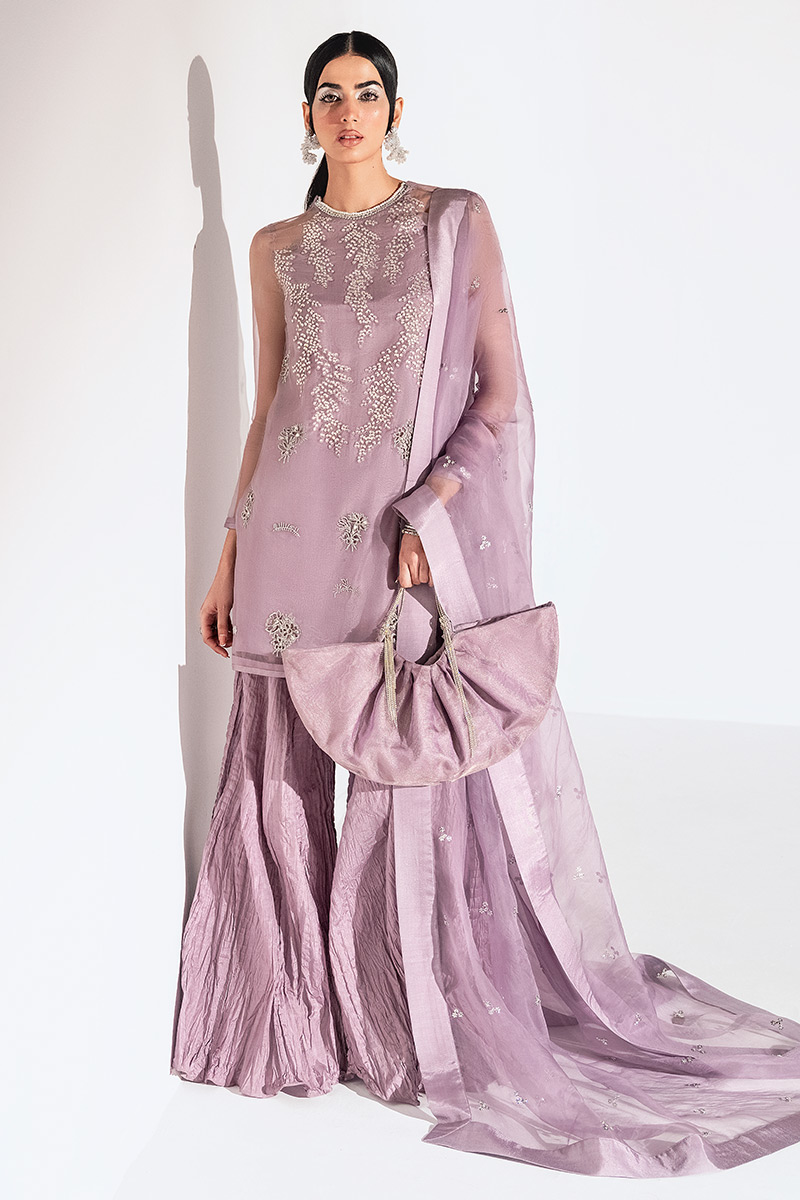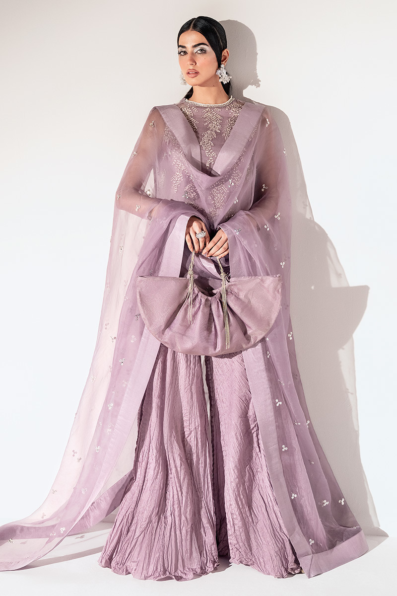 Elegant cool lilac mid-length shirt in organza paired with Thai silk crushed trousers. Made from high-quality fabric. It has fitted sleeves in organza, this ensemble is designed to make you look graceful and stylish. The Heavily embellished neckline with Swarovski stones adds a touch of sophistication and grace. Paired with a finely stitched and embellished organza dupatta with contemporary sequins spray all over and finished with a fabric border.