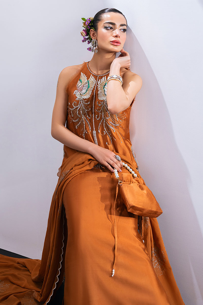 A vision in rust. Revel in the intricate hand embellishments of our Halter Neck Kaftan Dress, featuring captivating frayed organza edging and side pockets. The sequin motifs add a mesmerizing sparkle to this ensemble. It is complemented by a Chiffon Block Print Dupatta with scalloped edging that exudes effortless charm.