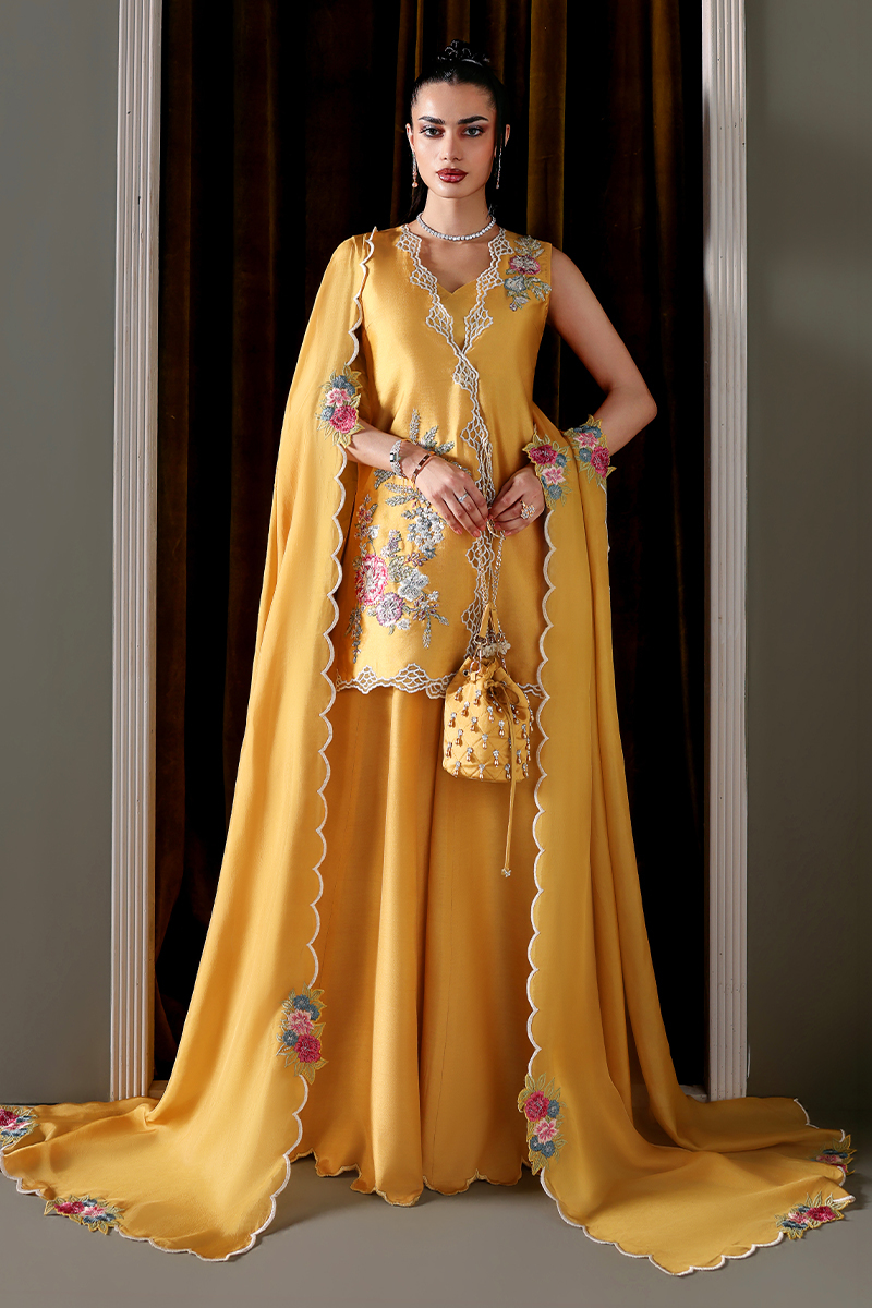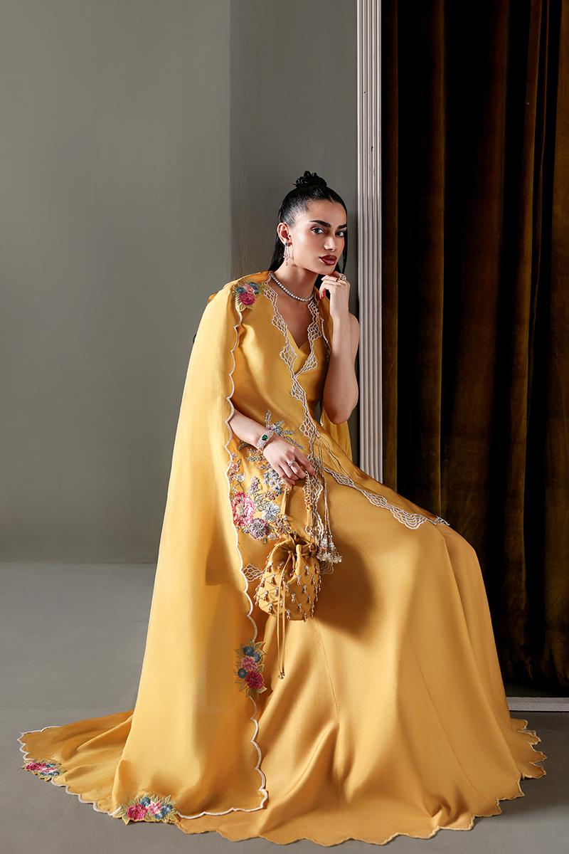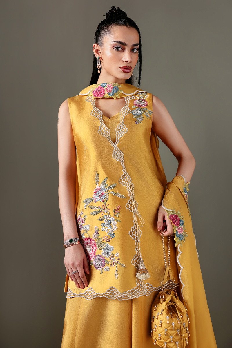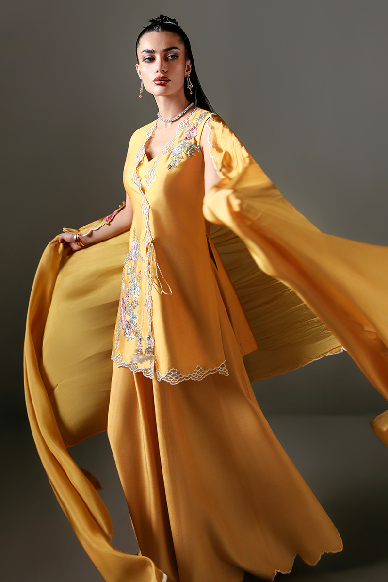 It includes shirt and sharara. A short angrakha-style shirt with asymmetrical hand and machine embroidery.Accented with delicate organza edging for a refined finish.Paired with a panelled flared sharara and a silk dupatta with multicoloured floral embroidery and scallops.