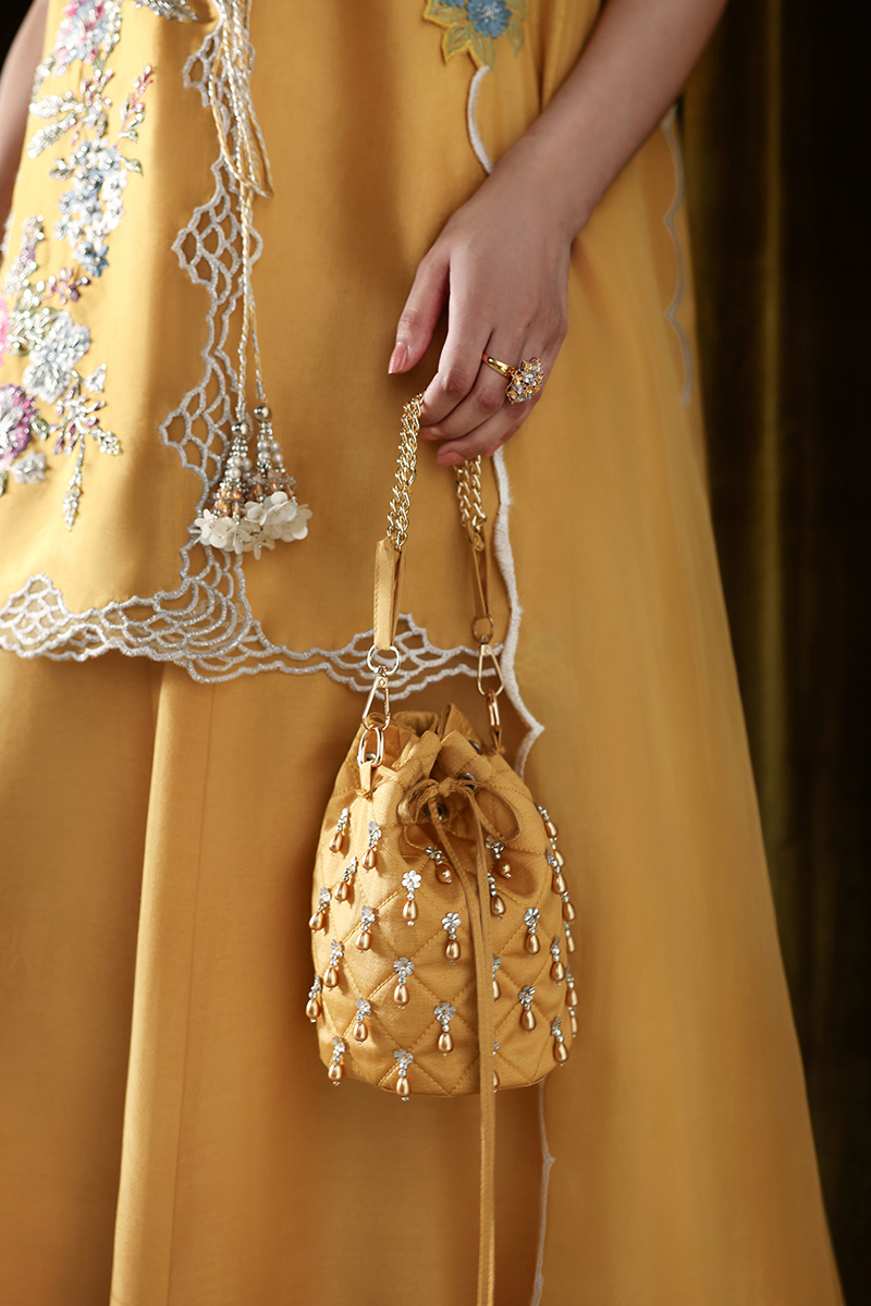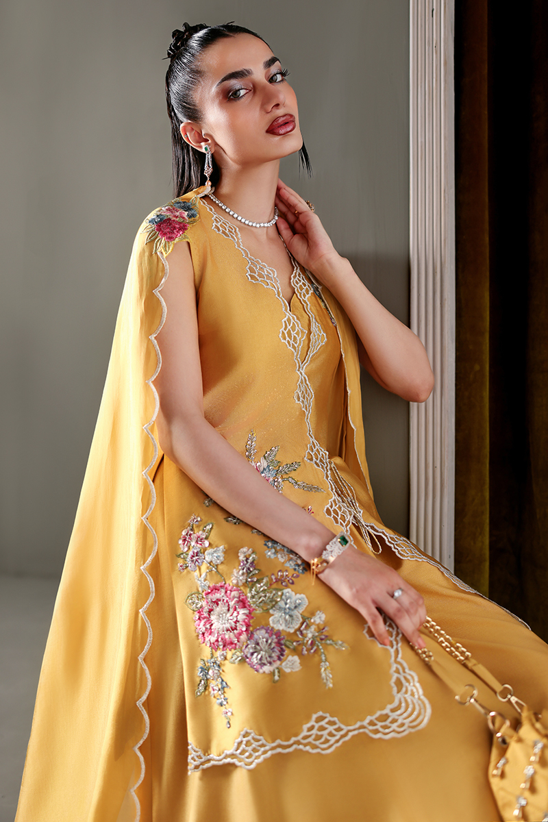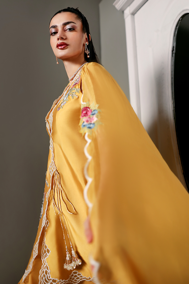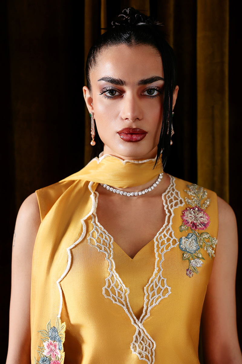 It includes shirt and sharara. A short angrakha-style shirt with asymmetrical hand and machine embroidery.Accented with delicate organza edging for a refined finish.Paired with a panelled flared sharara and a silk dupatta with multicoloured floral embroidery and scallops.