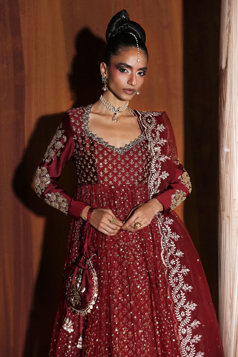 A stunning red ensemble featuring a peshwas paired with a medium silk lehnga and a pure organza dupatta. The peshwas, crafted from tissue silk and net, showcase delicate embellishments like naqshi, dabka, pearls, and intricate sleeve motifs. The flare is adorned with a shimmering sequin spray and finished with a lace border for a graceful look. The medium silk lehenga features soft gathers at the waist, highlighted by a lappa border. Completing the look is a pure organza dupatta, accented with an embroidered border and intricate embellishments, adding a timeless charm to the overall design.
