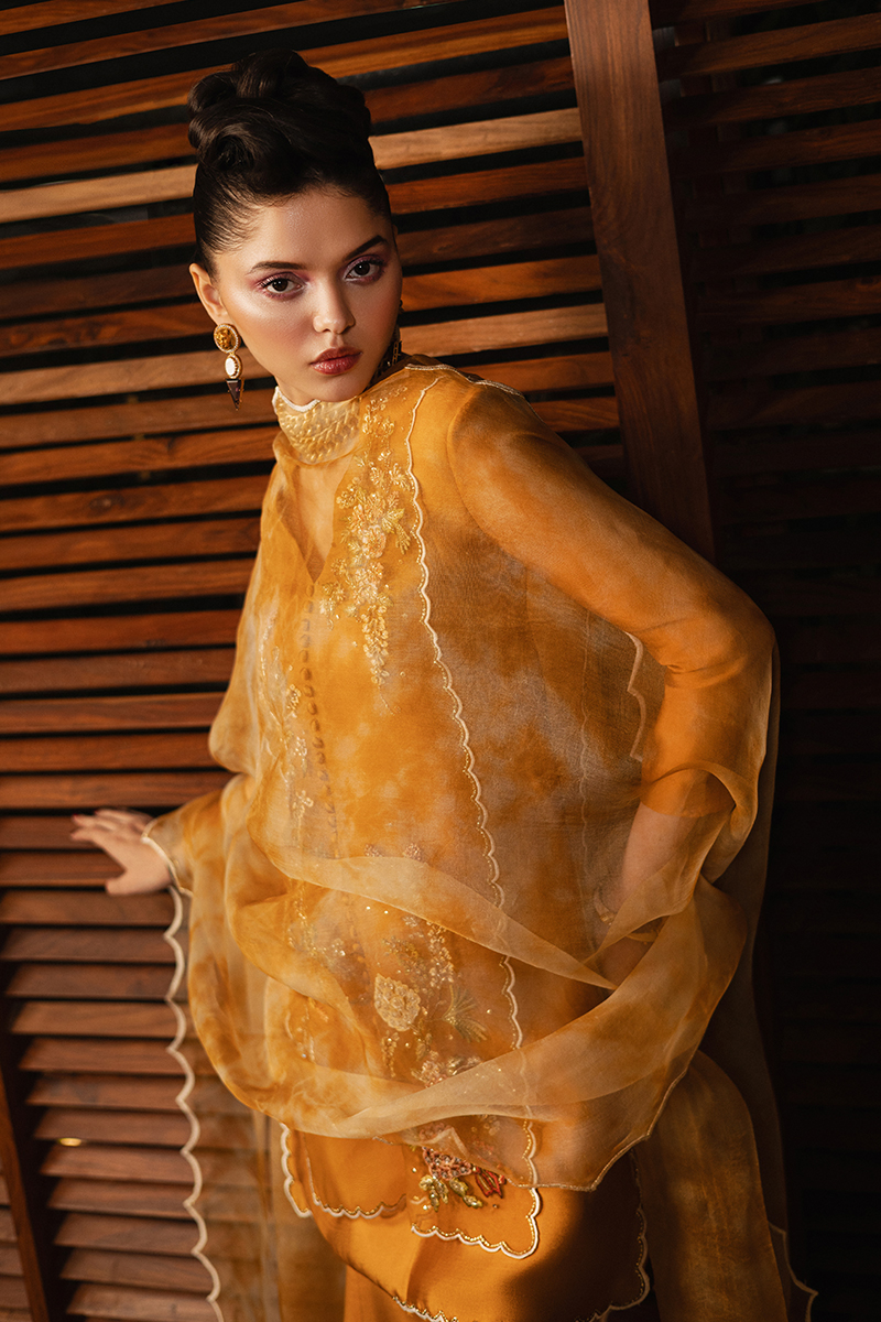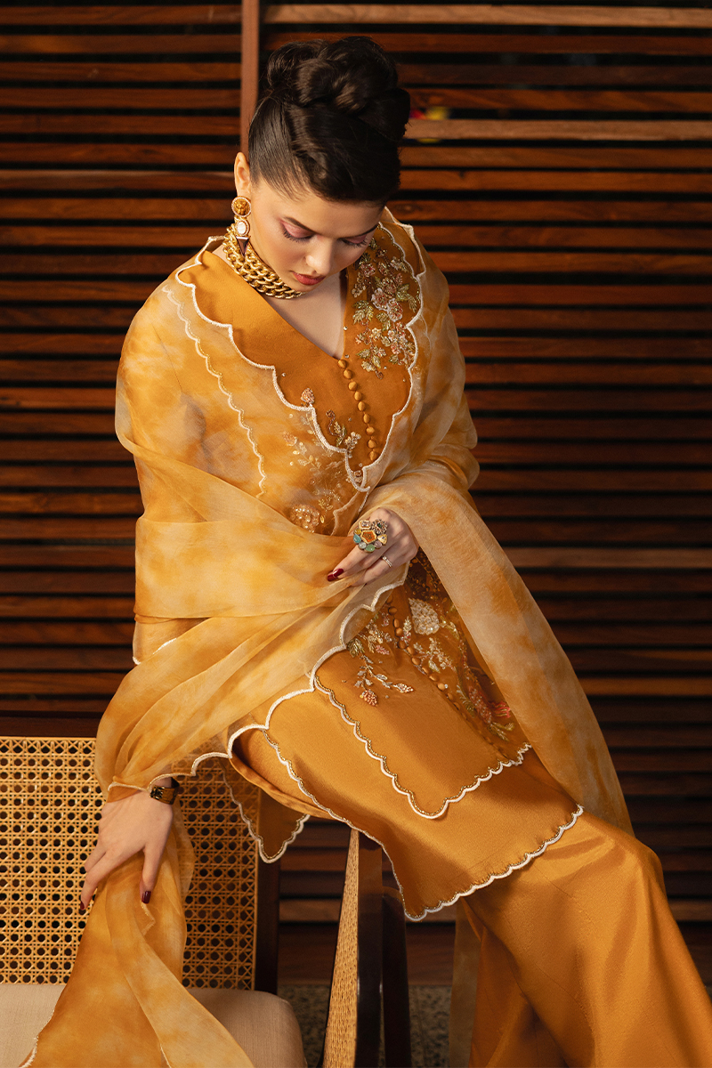 Cali Bling, a standout ensemble that blends modern flair with intricate craftsmanship. The V-neck, mid-thigh shirt is paired with a flared boot-cut trouser, creating a sleek silhouette that balances style and comfort. Exquisite embroidery and embellishments adorn the front organza panels, elevated by loop button details for a refined touch. The shirt also features waist-high slits with scalloped edge details and three-quarter sleeves, adding elegance and movement to your look. The panelled boot-cut trousers are beautifully complemented with three-dimensional embroidered florals, enhancing the overall design. Completing this chic outfit is a tie-dye organza dupatta, featuring inverted embroidered scallops that bring a fresh, artistic twist to the ensemble. Cali Bling is the perfect choice for those who crave both timeless elegance and contemporary glamour