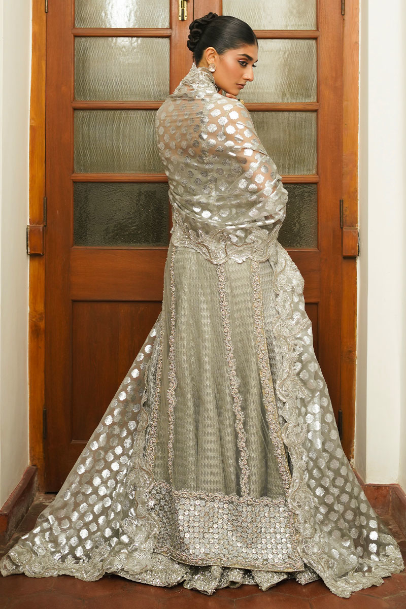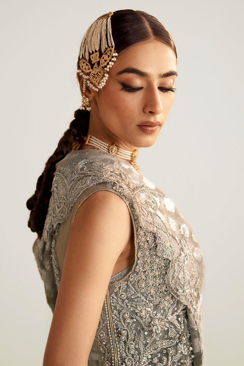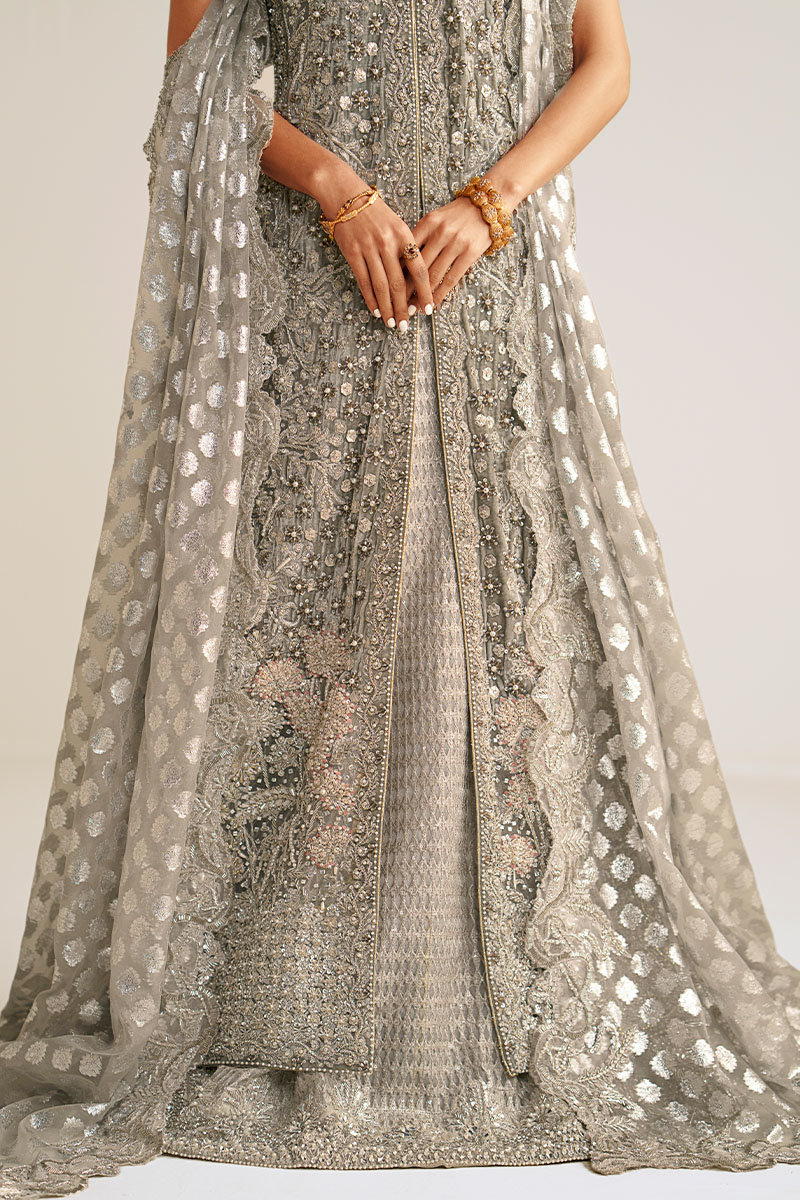 Unveiling "Chaandi," a voyage through the world of bridal opulence. In a mesmerizing silver-gray hue, this bridal outfit combines a heavily embellished long front open shirt, fusing velvet and net with traditional handwork techniques. The rich textures of velvet and net in the shirt exude regal charm, while the textured organza lehnga features an intricate hand-embellished border. Completing the look is a zari organza dupatta with four-sided handwork. "Chaandi" is more than attire; it's a heartfelt connection to the dreams, anticipation, and joy of a bride's special day, encapsulating timeless beauty and unforgettable memories.