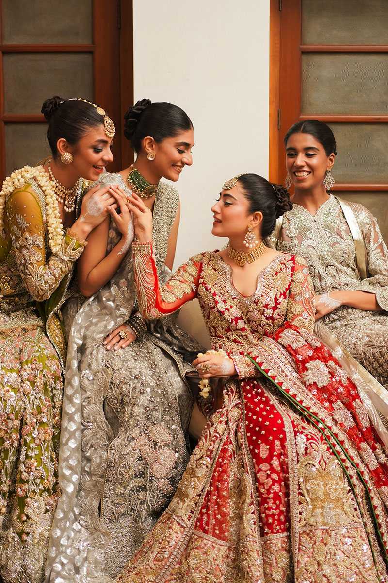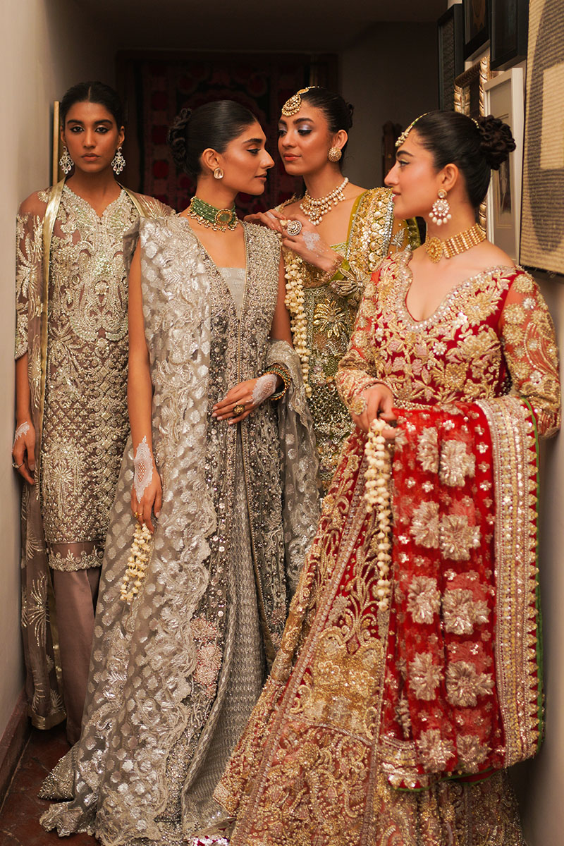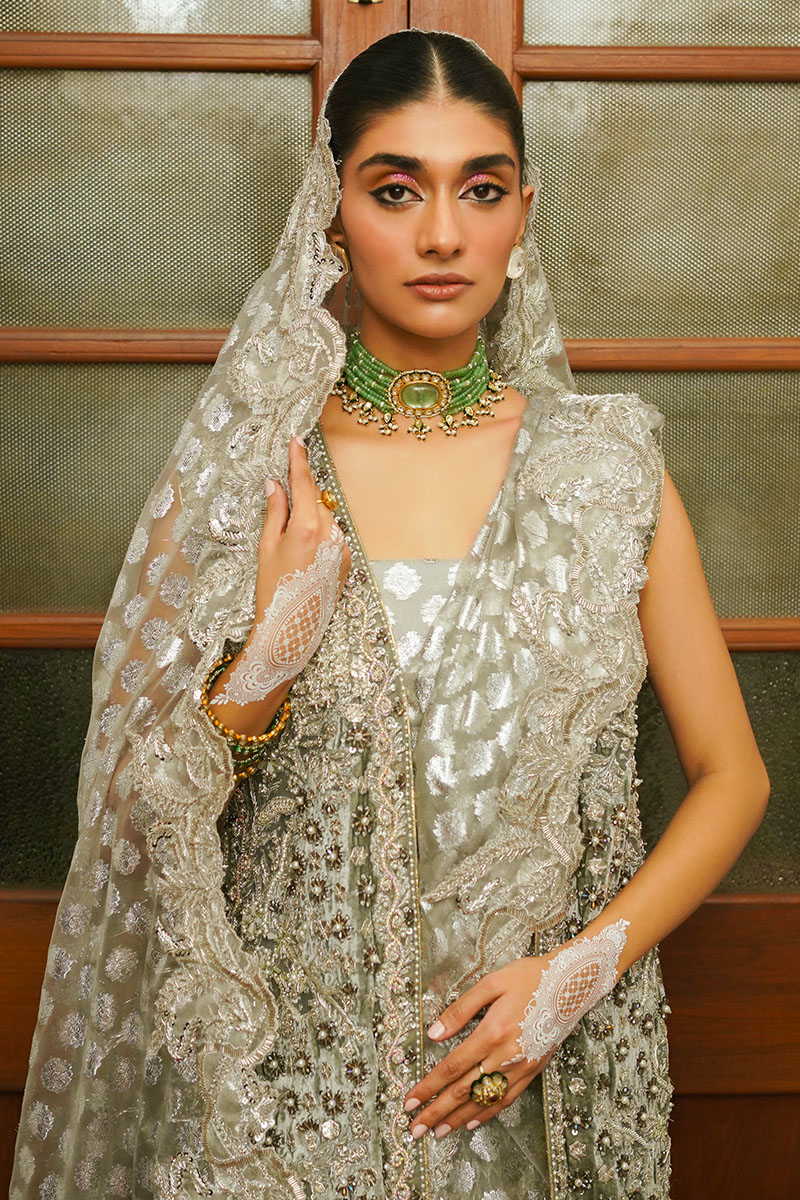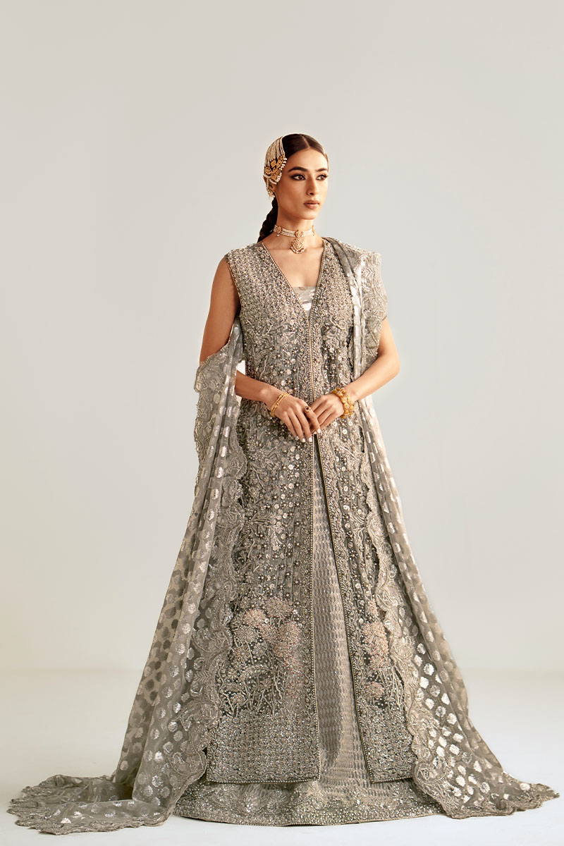 Unveiling "Chaandi," a voyage through the world of bridal opulence. In a mesmerizing silver-gray hue, this bridal outfit combines a heavily embellished long front open shirt, fusing velvet and net with traditional handwork techniques. The rich textures of velvet and net in the shirt exude regal charm, while the textured organza lehnga features an intricate hand-embellished border. Completing the look is a zari organza dupatta with four-sided handwork. "Chaandi" is more than attire; it's a heartfelt connection to the dreams, anticipation, and joy of a bride's special day, encapsulating timeless beauty and unforgettable memories.