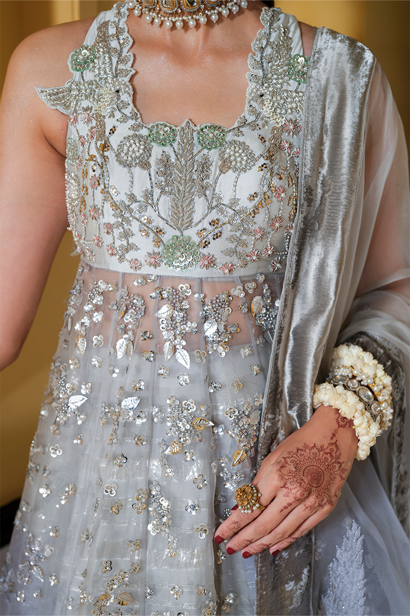 Chaandni Choti - Embodies opulence with a full-length organza pishwas, beautifully layered over tissue silk and paired with a graceful Thai silk lehnga. The fitted halter bodice is enriched with embroidered motifs and a velvet border, setting the tone for timeless elegance. Intricately hand-embellished, the pishwas glimmers with resham work, sequins, Swarovski crystals, and exquisite zardozi craftsmanship, making it a true statement of luxury. Completing the ensemble is a three-yard organza dupatta, adorned with embroidered motifs and finished with a plush velvet border, offering the perfect balance of refinement and regal charm.