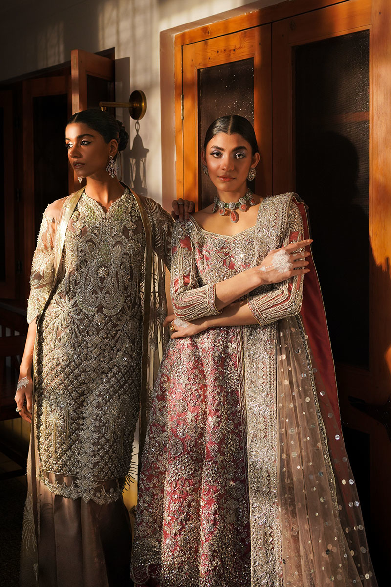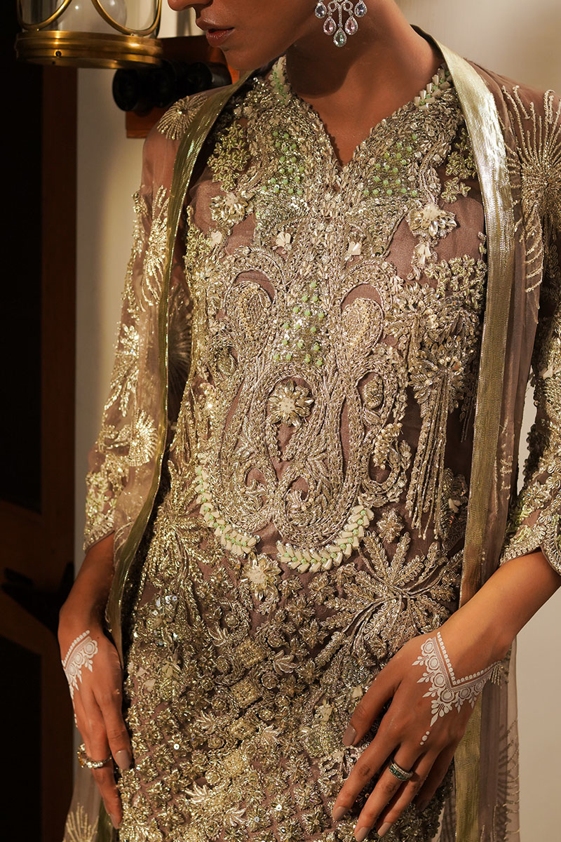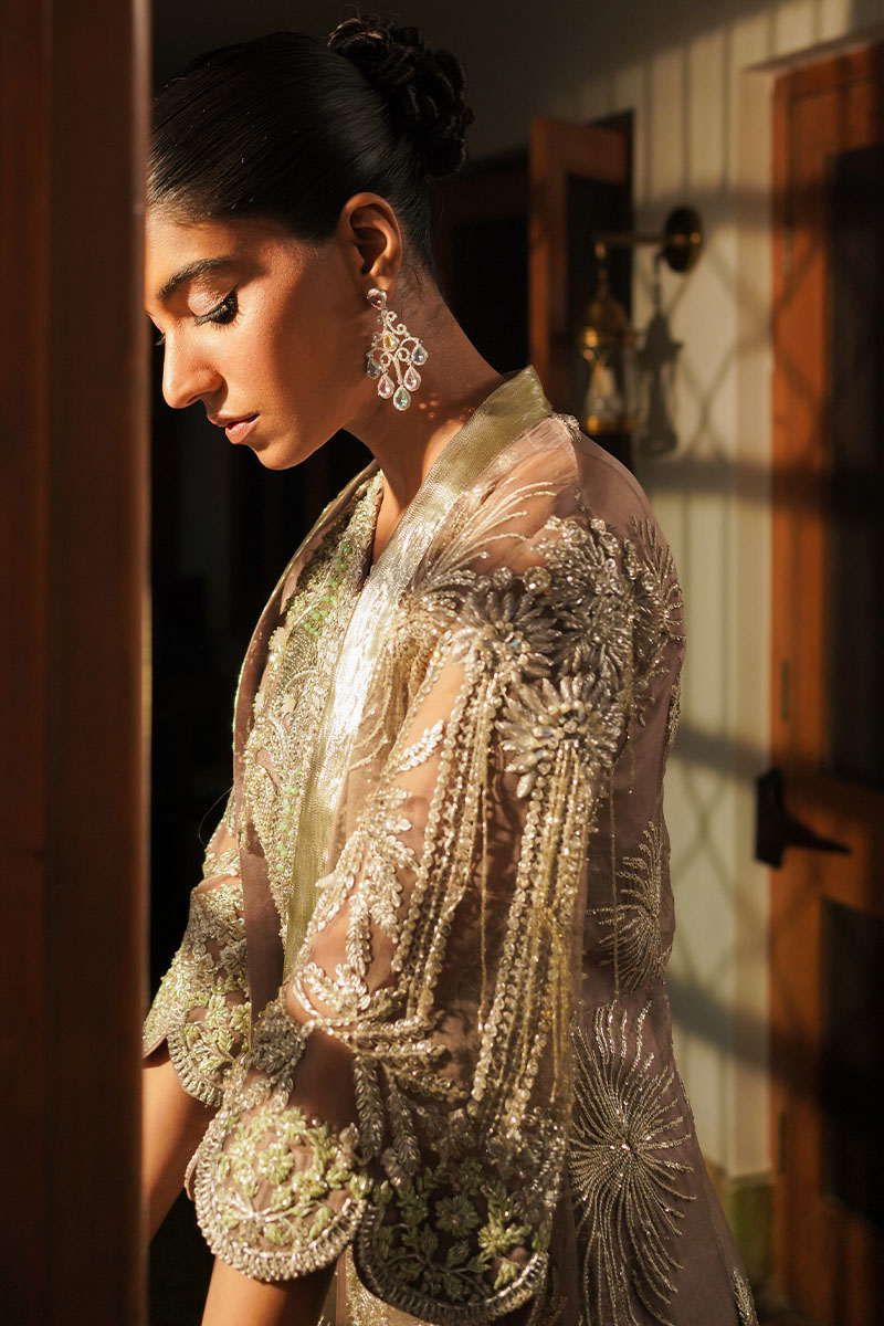Embrace the regal splendour with our "Chaman" donned in the enchanting lilac gray hue. This stunning formal outfit comprises a meticulously hand-embellished shirt, featuring modern materials that include nakshi dabka, adding a contemporary touch to a classic design. The gown, crafted from delicate organza, is adorned with sequins embellishments, casting an ethereal charm. The shirt, made from sheer net, complements the ensemble with its elegant simplicity. Chaman is a perfect choice for those seeking a graceful and modern formal look, blending tradition with contemporary flair in a captivating lilac gray hue.