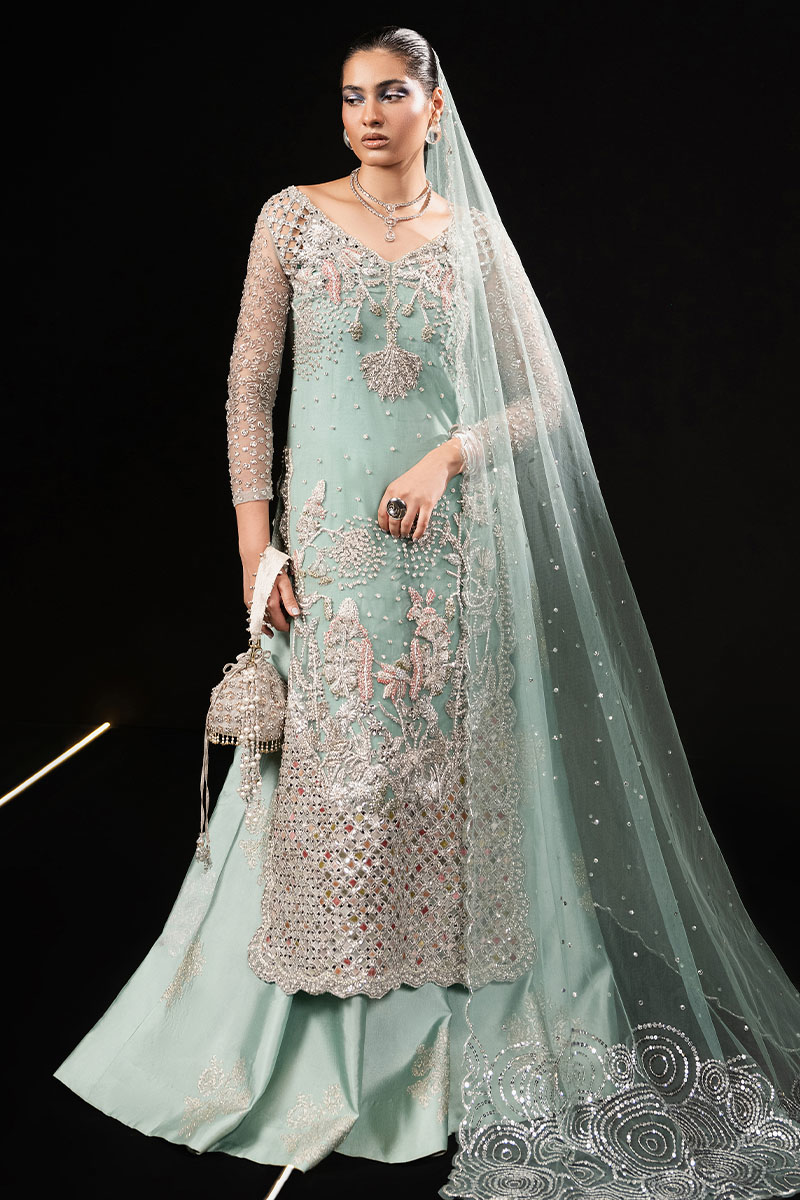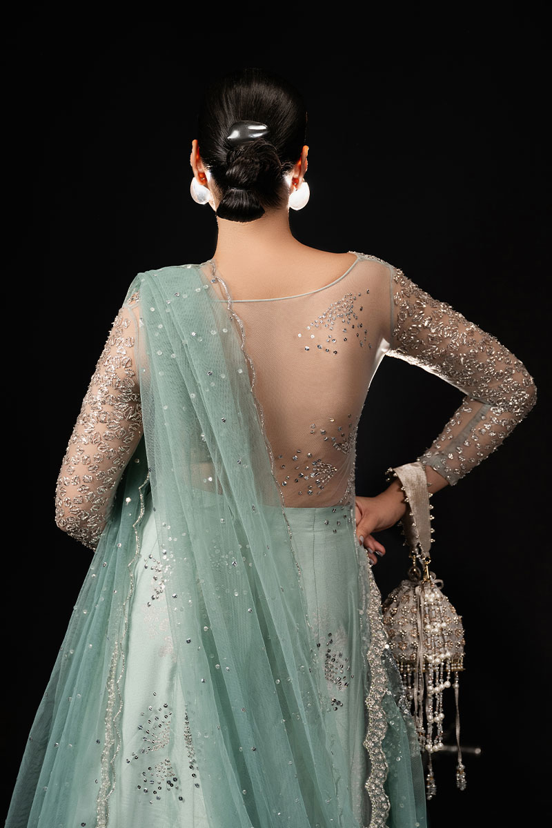 Prepare to be captivated by the exquisite charm of 'Chambeli', a stunning aqua ensemble featuring a V-neck long shirt exquisitely embroidered with gota, dabki, naqshi work, Swarovskis, pearls, sequins, and French knots. The design includes a luxurious velvet patchwork daman with scalloped edging and elegant cutwork on the shoulders, destined to leave an indelible impression. Paired with a block-printed lehnga and a net dupatta adorned with sequin spray and embellished scalloped borders, which radiates sophistication and glamour.