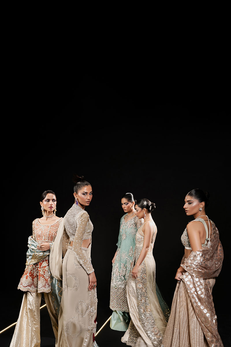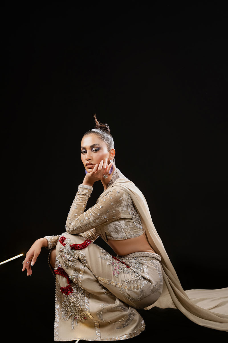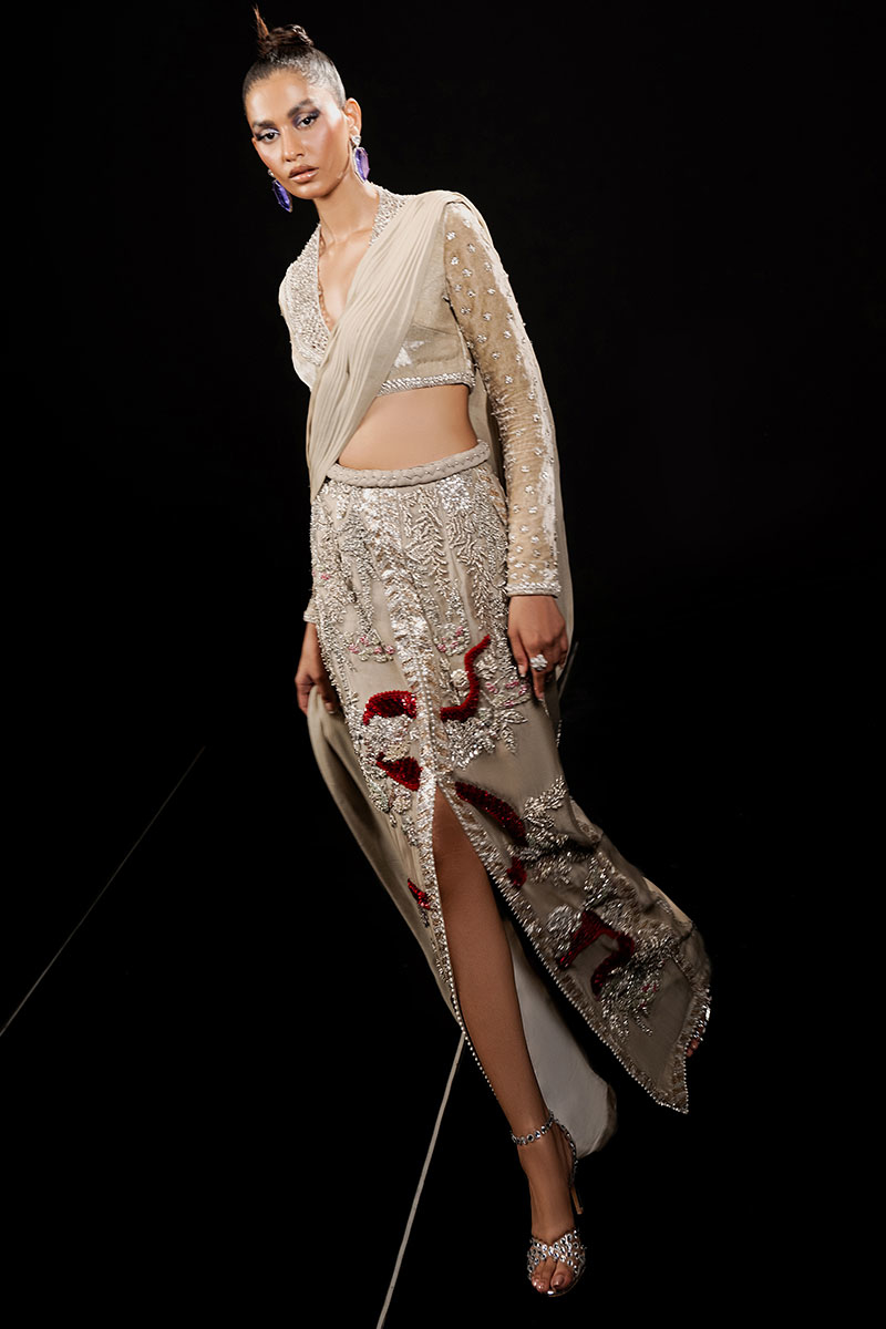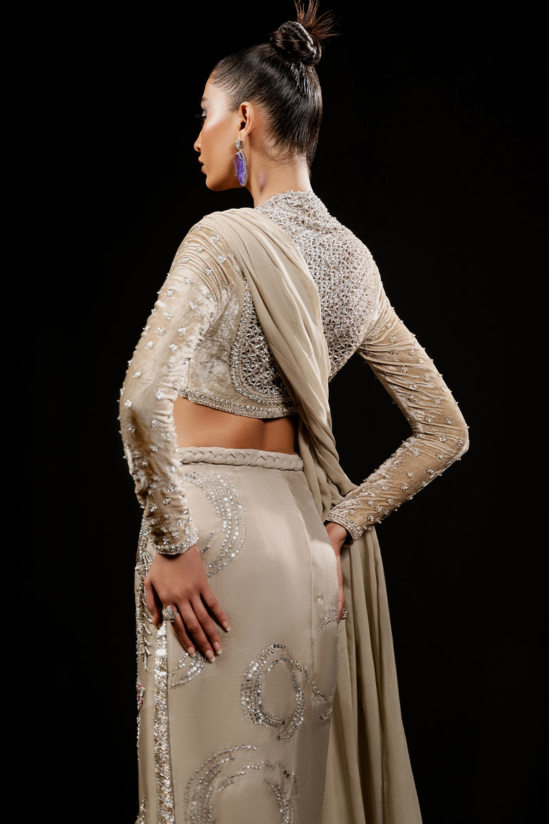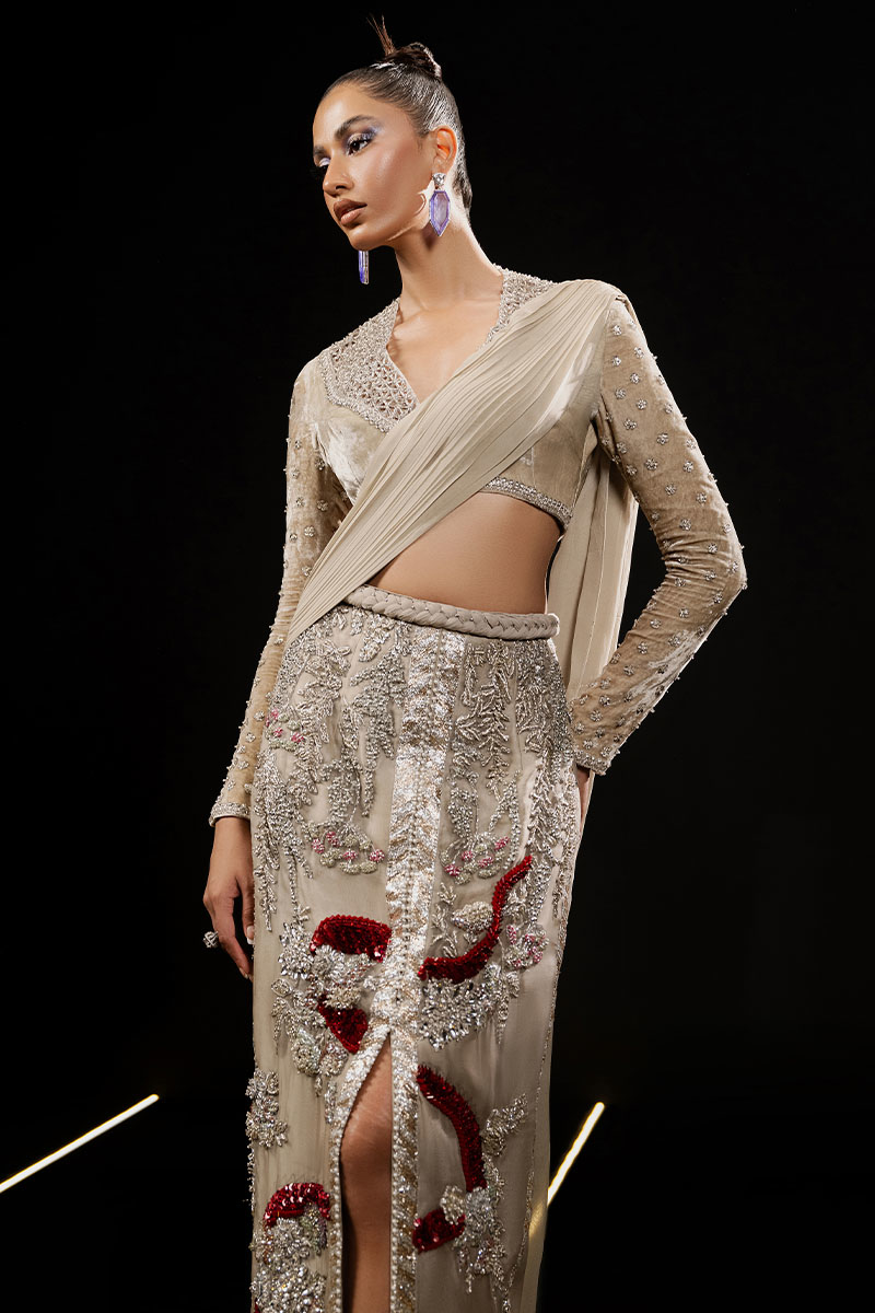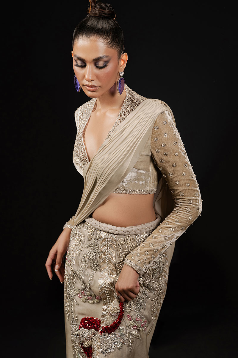 Exuding an aura of exclusive luxury, 'Classic Madame' is an ivory ensemble featuring a V-neck French velvet blouse with full sleeves, exquisitely embroidered and hand embellished with cut work and detailed borders. The organza skirt, adorned with a chiffon sari drape, showcases intricate floral embroidery enhanced with dabka naqshi work, Swarovskis, pearls, gota, and sequins. This masterpiece celebrates unparalleled craftsmanship, ensuring a statement of refined elegance and timeless allure.