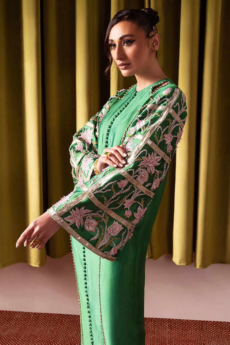 Make a striking entrance in our captivating "Daisy" ensemble, tailored from luxurious Tissue Silk in a vivid green shade. The long shirt features front buttons, a slit, and intricate panel gold stud detailing, while the A-Line sleeves shimmer with sequins. Complete with an Organza sequins spray dupatta and cigarette trousers, the Daisy ensemble exudes sophistication and allure, ensuring you shine with grace.