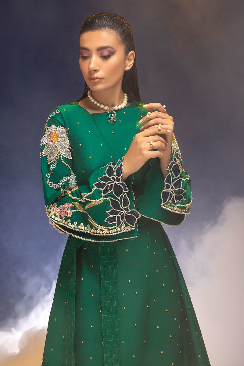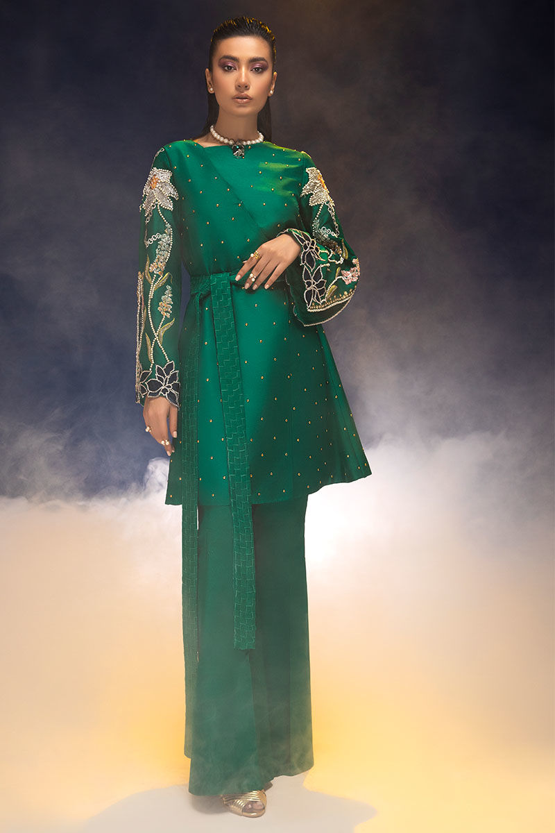 Front open asymmetric jacket knotted with long woven belt with flared embellished sleeves. Paired with extra bootcut pant. Hand work on intricate embroidery.
