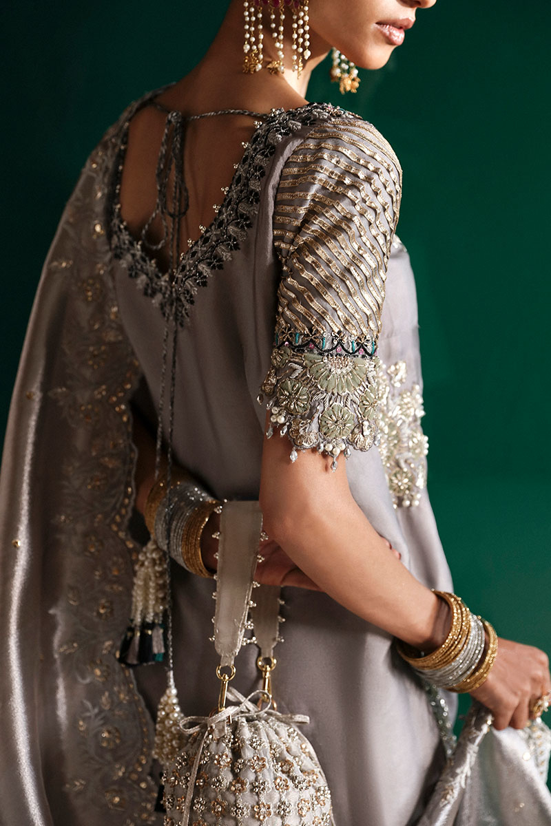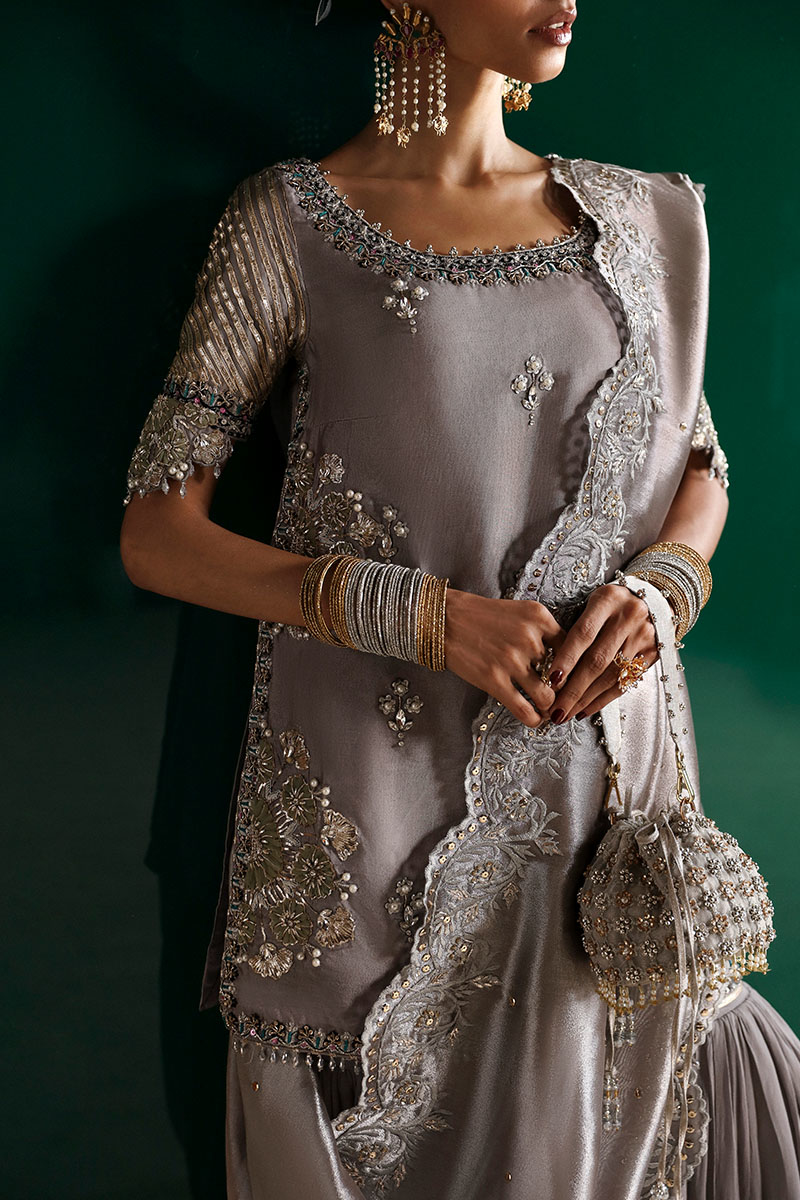 A luxurious grey shirt and gharara featuring a hand-embellished tissue silk shirt with intricate dabka, nakshi, swarovski's, pearls, and resham thread work. The sleeves showcase an embroidered, embellished border with gota patti details, while the chiffon gharara is finished with a delicate embroidered border and lappa. Paired with a pure tissue dupatta, meticulously embroidered and hand-embellished to complement the richness of the outfit. A timeless statement crafted for the bride or her closest circle.