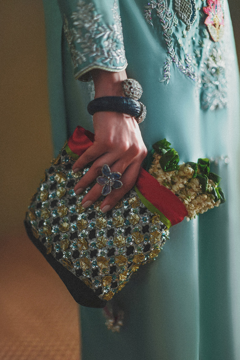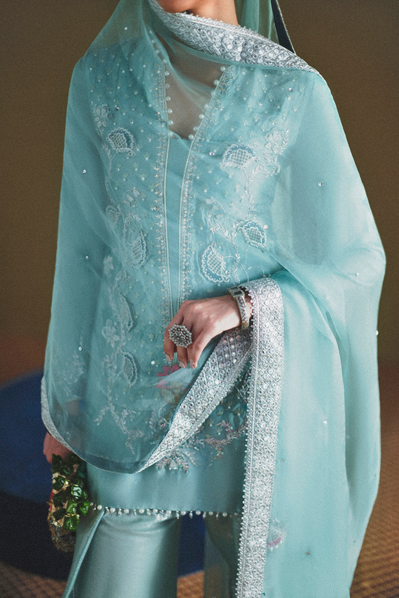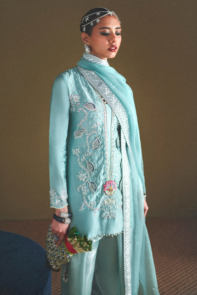 Dilruba - An ode to timeless grace, Dilruba showcases a V-neck shirt intricately hand-embroidered in a delicate jaal pattern, adorned with dabka, nakshi, sequins, pearls, crystals, and refined French knots. The design is elevated with three-dimensional motifs, embroidered scallops, and a detailed border on the sleeves. Tassel accents at the neckline and hem add playful movement, while the look is grounded with a beautifully tailored farshi shalwar. The organza dupatta, softly dusted with sequins and finished with a dainty border, completes this ethereal ensemble designed for unforgettable moments.