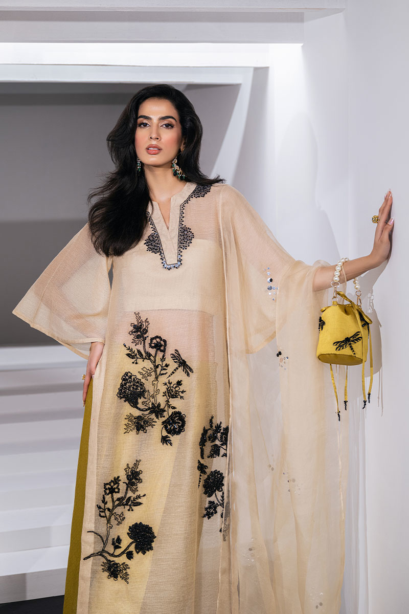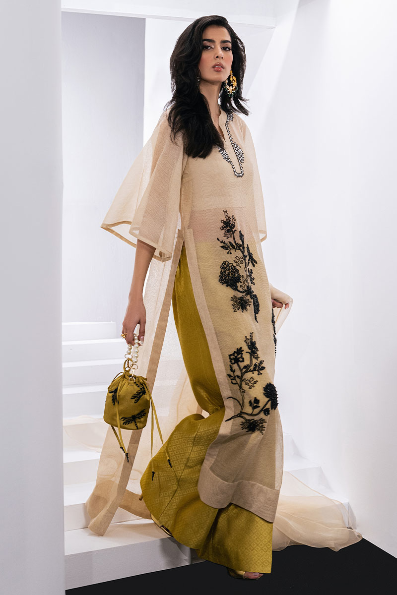 This exquisite beige ensemble boasts intricate embellishments, creating a divine and powerful aura. Effortlessly chic in cotton net and textured tissue silk. Elevate your style with an Overlapped V-neck loose-fit shirt paired with a flared sleeve and a contrast palazzo pant. Complete the look with an embellished organza dupatta for a touch of elegance.