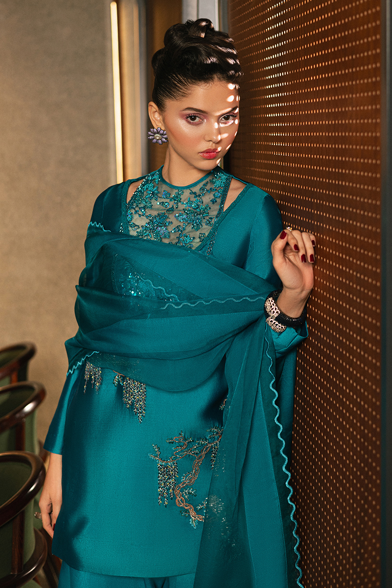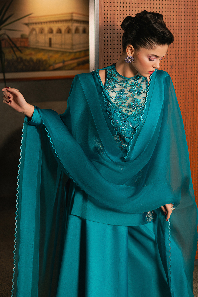 Draped in Blue, a timeless ensemble crafted to exude charm and sophistication. The round-neck short shirt features a delicate cut-out detail and embroidered florals, enriched with intricate monochromatic hand embellishments on the organza neckline. A braided net detail further enhances the design, creating a harmonious blend of texture and artistry. Paired with a flowy panelled sharara, this ensemble offers a refined yet dramatic silhouette. Completing the look is an organza dupatta, beautifully finished with embroidered scalloped edges, adding an ethereal touch to the overall aesthetic. Draped in Blue is a perfect choice for those who seek a balance of tradition and modernity, designed to leave a lasting impression.
