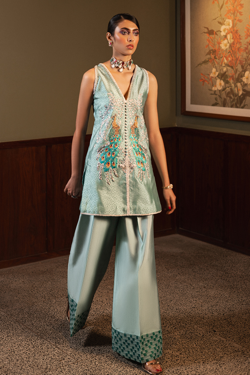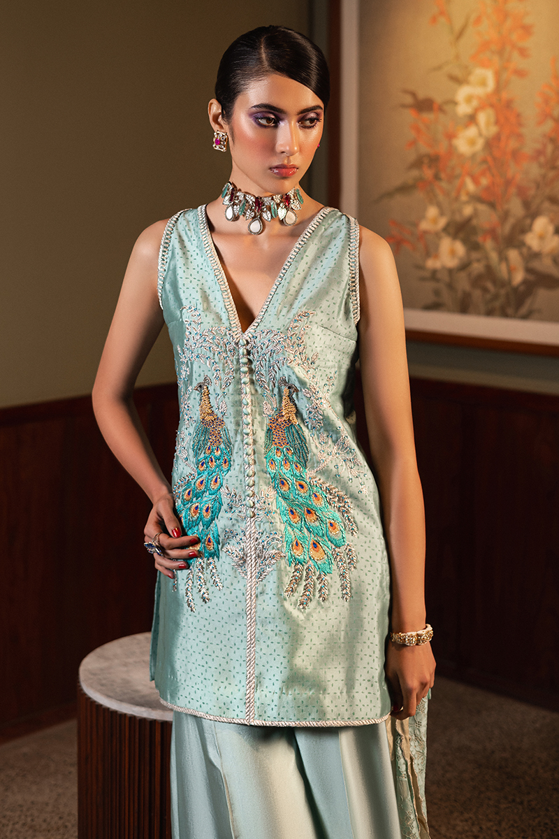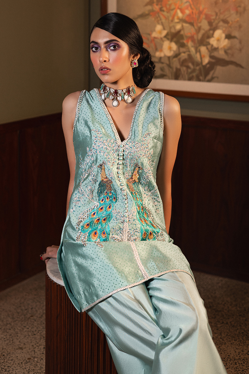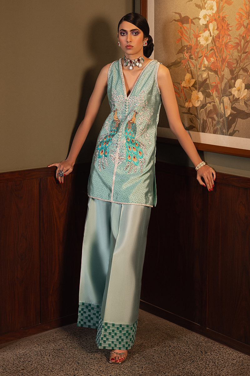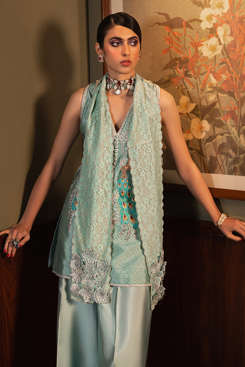 Feather, a refined ensemble that exudes elegance and modernity. This sophisticated outfit includes a halter short shirt paired with a straight-fit trouser and a lace scarf, offering both comfort and style. The shirt is intricately embroidered with delicate embellishments on the front, elevated with a unique loop button detail for added sophistication. The loose-fit trousers feature a beautifully highlighted criss-cross organza border, bringing a touch of contemporary flair to the classic silhouette. The lace scarf, with its three-dimensional floral embroidery, contrast lining, and scalloped border, completes the look with a delicate yet bold finish. Perfect for any occasion, Feather combines timeless craftsmanship with modern design.