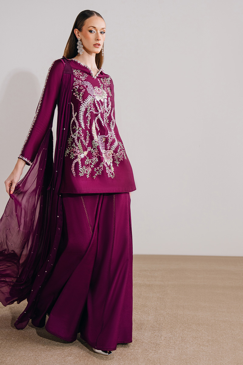 This light plum ensemble features a mid-thigh shirt paired with a sharara and a medium silk dupatta, offering a refined yet graceful silhouette. The shirt is adorned with exquisite hand-embroidered florals, elevated with hand-embellished borders on the neckline and sleeves and enhanced with crystals, sequins, and pearls for a subtle shimmer. A delicate keyhole detail at the back neckline, finished with embellished tassels, adds a thoughtful touch, while the sharara is detailed with lace inserts for added movement. The look is completed with a medium silk dupatta, highlighted with three-dimensional florals and pleat detailing, bringing depth and elegance to the ensemble.