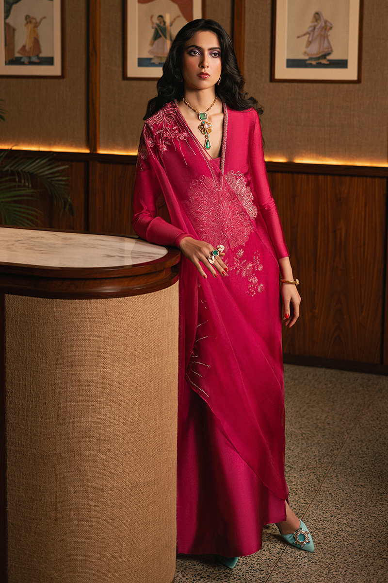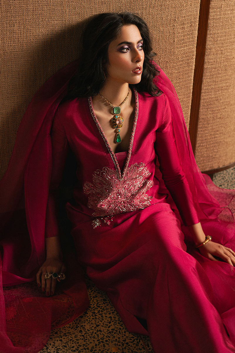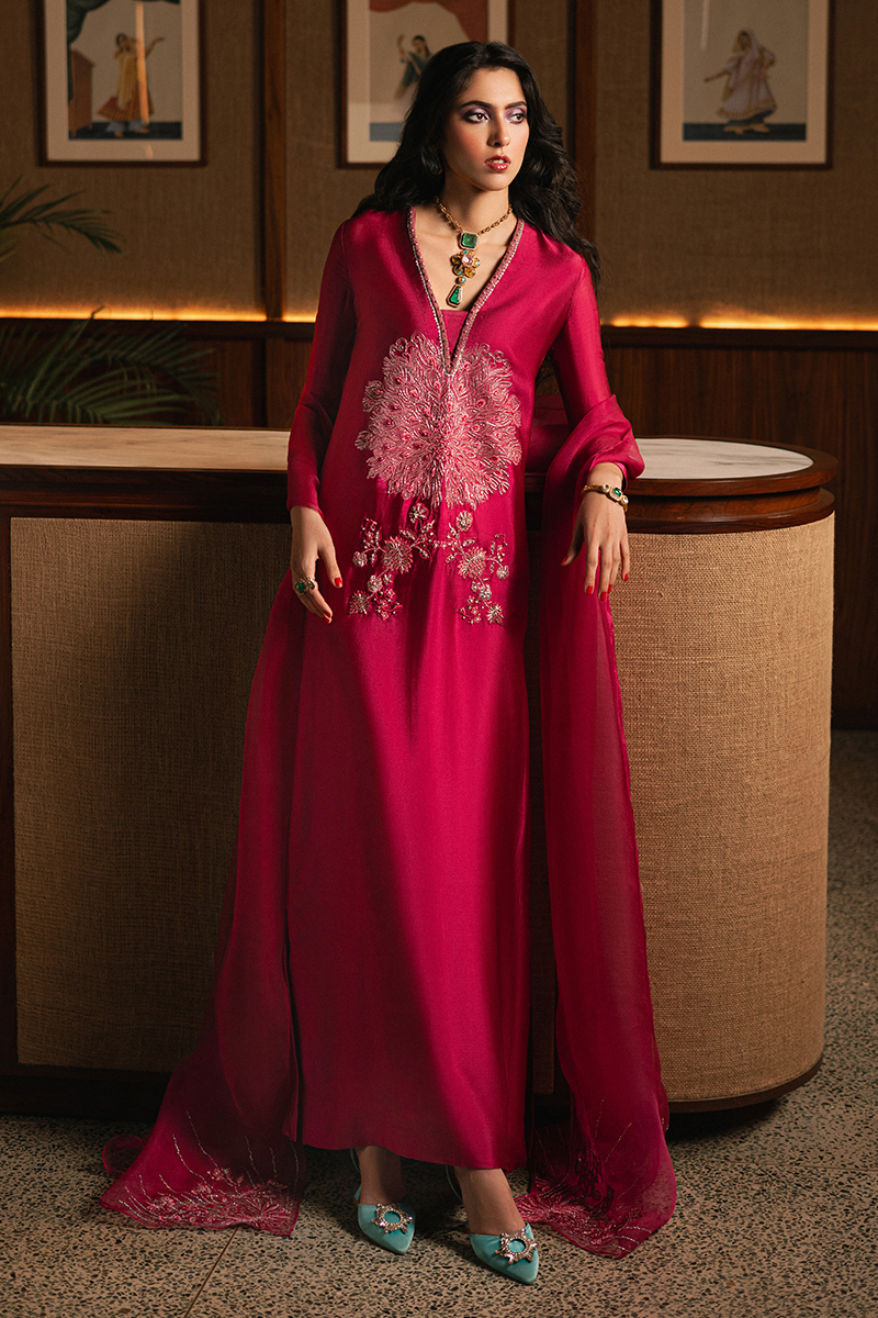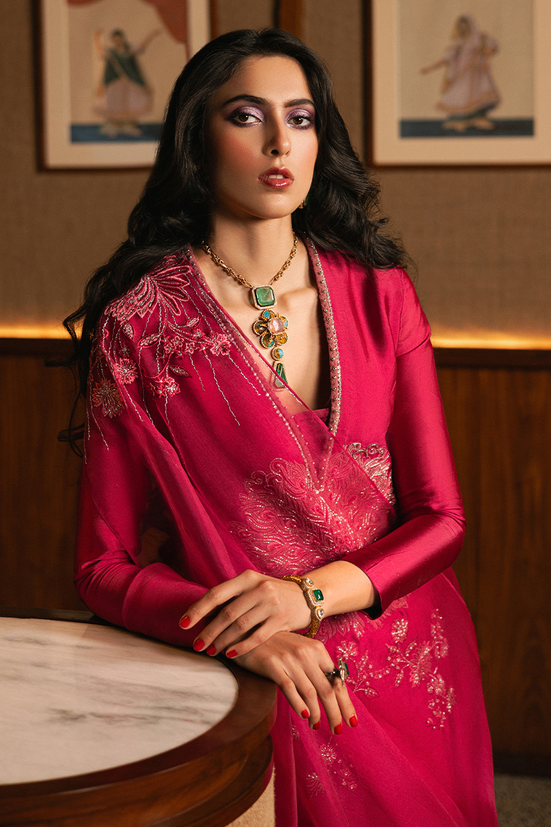 Florescence – A Celebration of Floral Elegance. Radiate timeless charm in Florescence, a stunning V-neck kaftan dress that exudes grace and sophistication. Crafted with delicate net detailing, the front features intricately embroidered and hand-embellished floral designs brought to life with naqshi, cut daana, pipework, and shimmering crystals. Paired with an organza dupatta adorned with embroidered corners on all four sides, this ensemble combines effortless luxury with meticulous craftsmanship. Florescence is the perfect choice for those who desire elegance and artistry in every stitch.