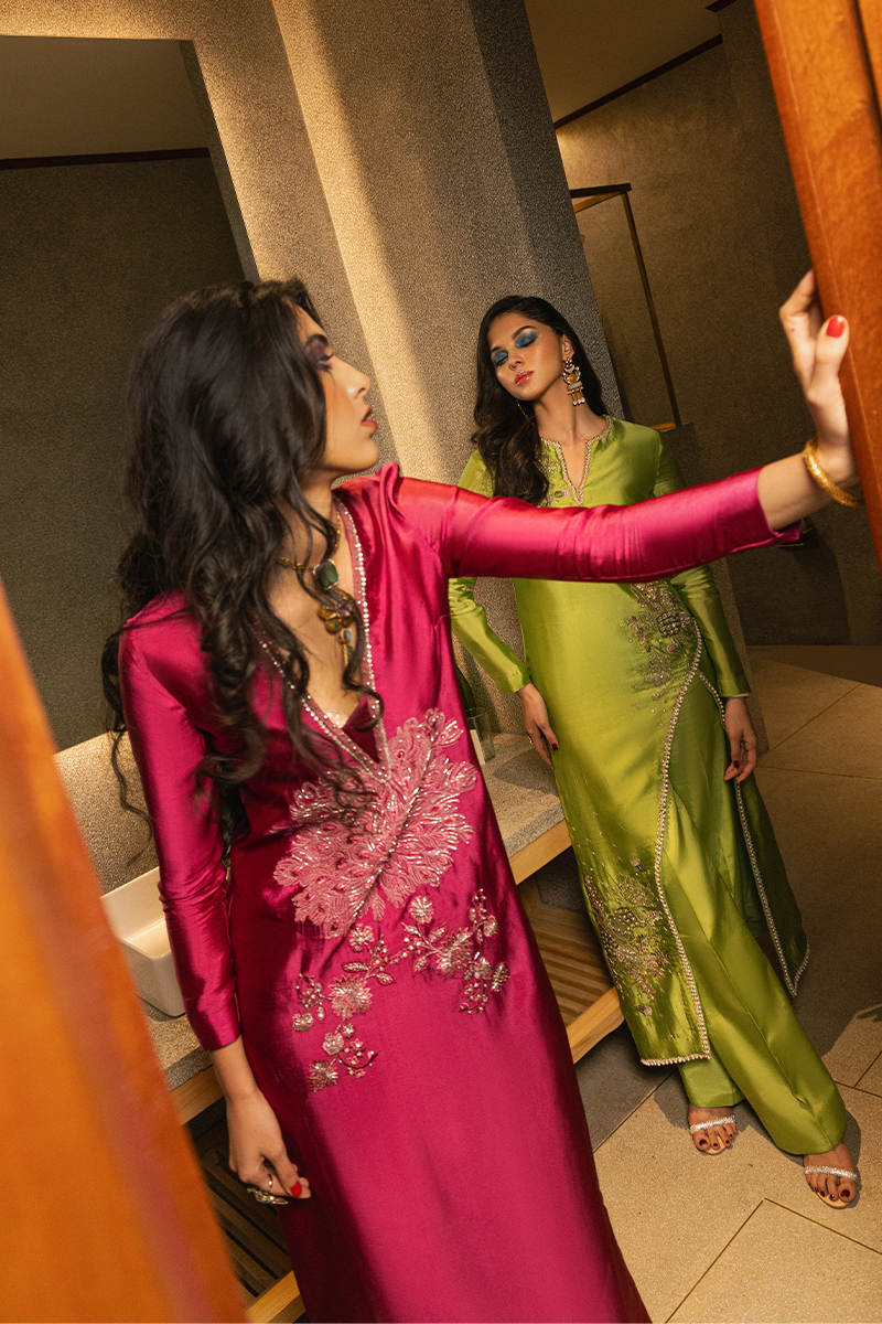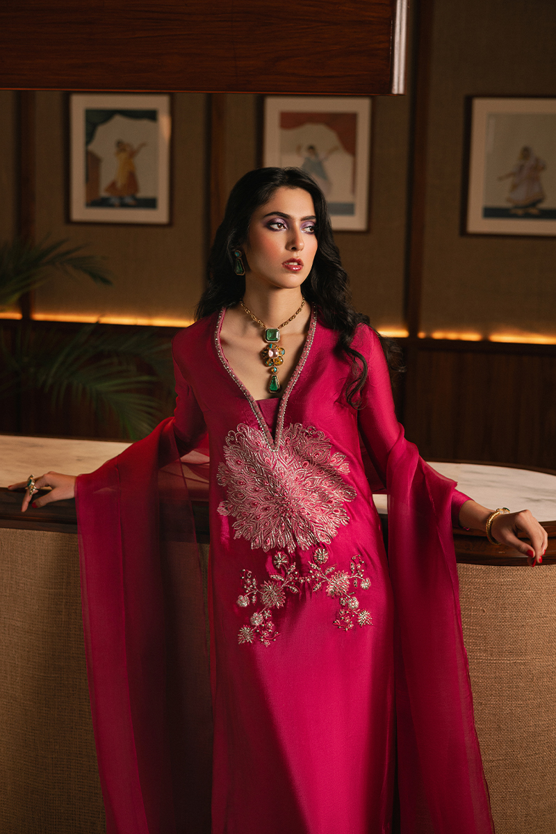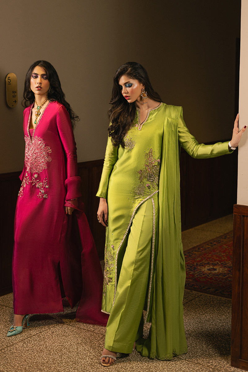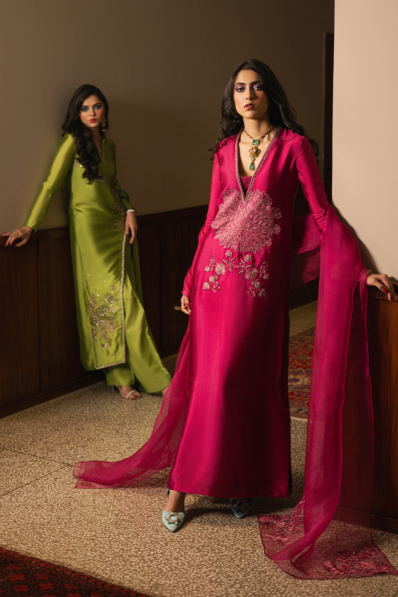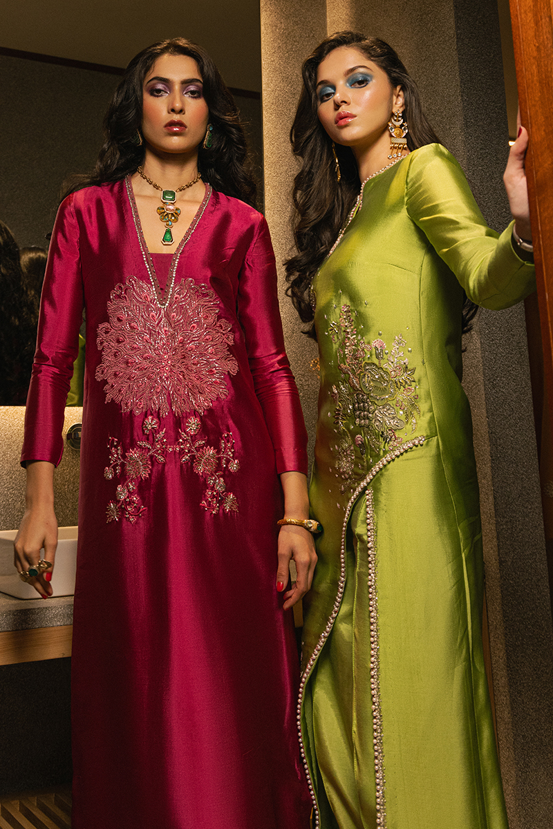 Florescence – A Celebration of Floral Elegance. Radiate timeless charm in Florescence, a stunning V-neck kaftan dress that exudes grace and sophistication. Crafted with delicate net detailing, the front features intricately embroidered and hand-embellished floral designs brought to life with naqshi, cut daana, pipework, and shimmering crystals. Paired with an organza dupatta adorned with embroidered corners on all four sides, this ensemble combines effortless luxury with meticulous craftsmanship. Florescence is the perfect choice for those who desire elegance and artistry in every stitch.