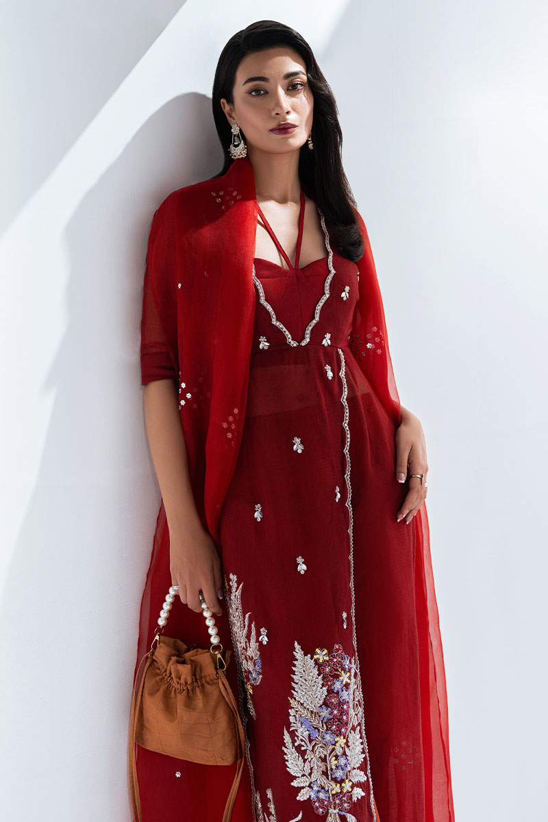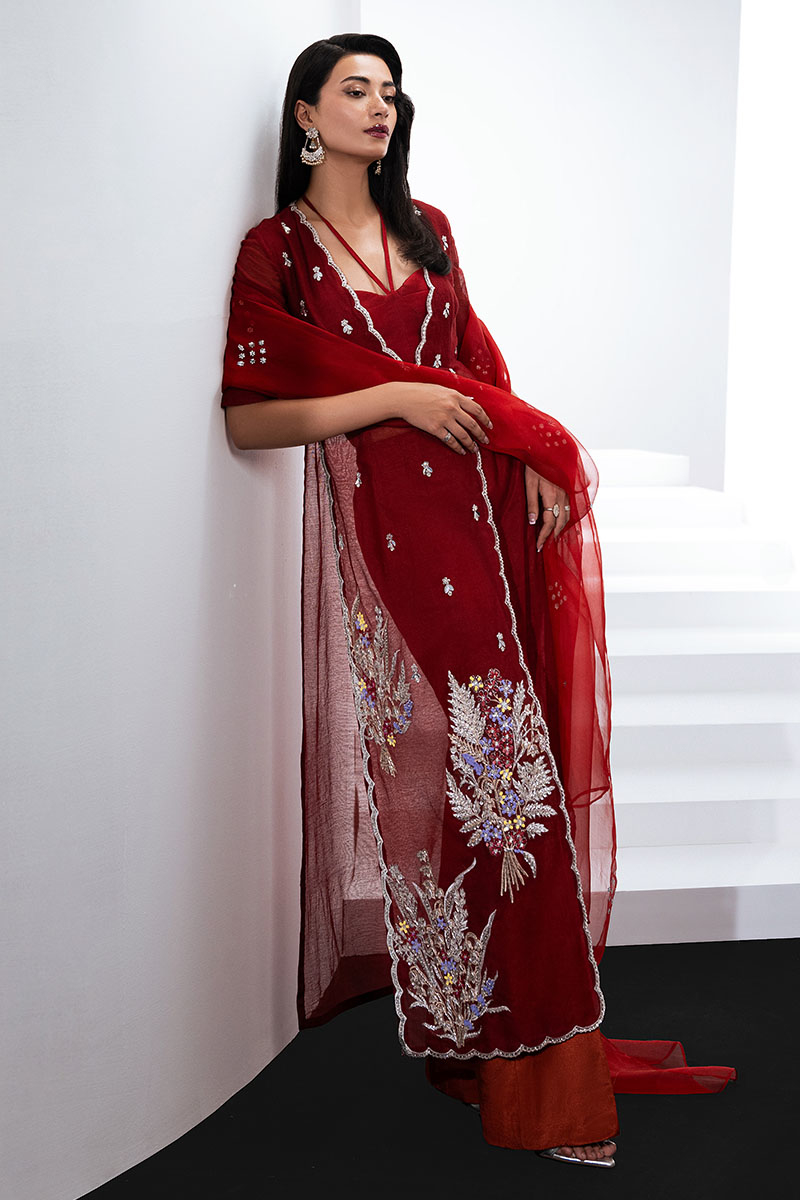 Make an unforgettable entrance in "Flower Bunch". A V-neck panelled dress with scalloped front and side slits, adorned with intricate hand embroidery and paired with a boot cut trouser in luxurious Thai silk. Complete with an embellished organza dupatta, this ensemble epitomizes sophistication and charm in every stitch.