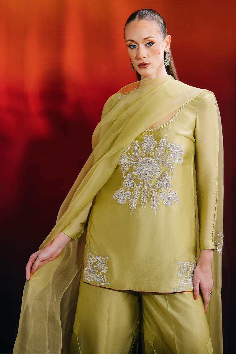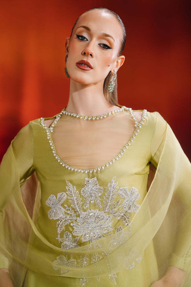 This lemon yellow ensemble features a mid-thigh short shirt paired with an ombré culotte and a sheer organza dupatta, creating a fresh yet refined silhouette. The shirt is adorned with exquisite hand-embroidered florals, delicately embellished with dabka, crystals, sequins, and pearls, and finished with an organza neckline featuring cut-out detailing highlighted by hand-embellished borders. Lace inserts on the sleeves add softness, while the ombré culotte is elevated with intricate embroidered detailing for graceful movement. The look is completed with an organza dupatta, beautifully accented with embellished florals and detailed corners for an elevated finish.