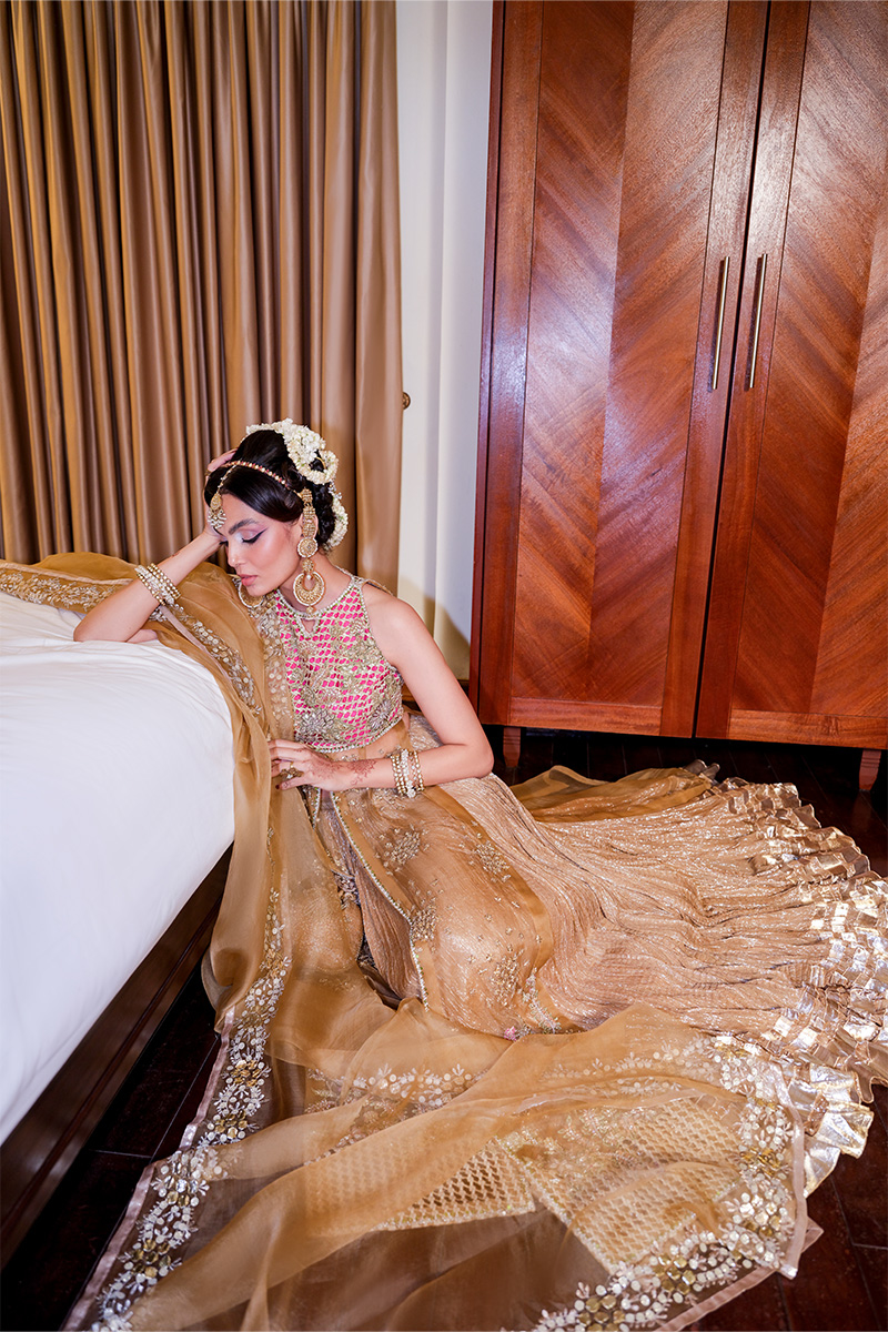 Gold Raani - A soft beige hue with a regal fuchsia accent, Gold Raani is a true masterpiece of craftsmanship. The organza shirt features a front slit with a halter-style bodice, intricately detailed with cutwork and exquisite hand embellishments that radiate luxury. Paired with a voluminous shimmer sharara showcasing a crushed flare and lappa pati accents, the ensemble flows with grandeur and grace. An optional organza dupatta, finished with gota-embellished borders, adds a touch of festive finesse, while a matching embellished pouch can be added for the perfect finishing detail.
