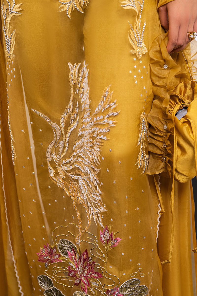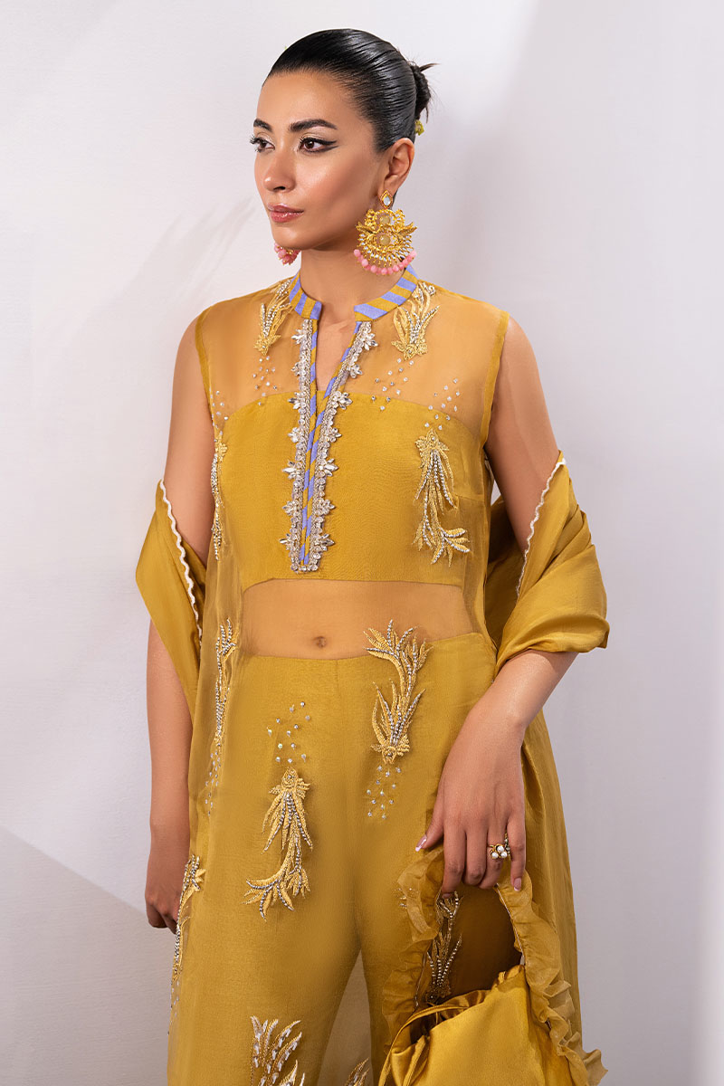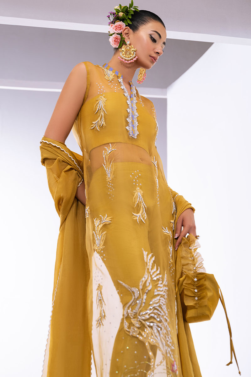 An elegant Mustard dress. The Organza V-neck shirt is adorned with a beautifully embellished neckline, accentuated by a contrasting neckband and edging. Paired gracefully with luxurious Thai Silk trousers, it epitomizes modern elegance. And to add a touch of sophistication, a silk dupatta with scalloped edging and intricate patchwork detail on each corner completes the ensemble.