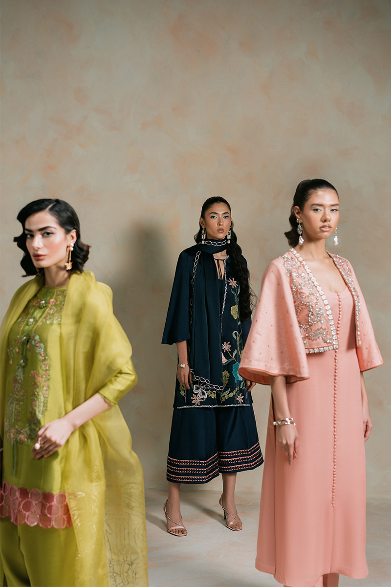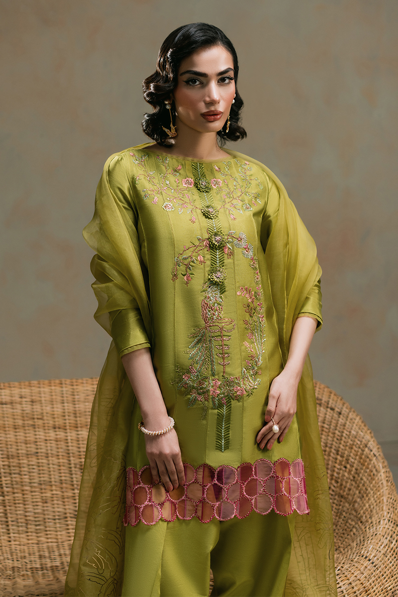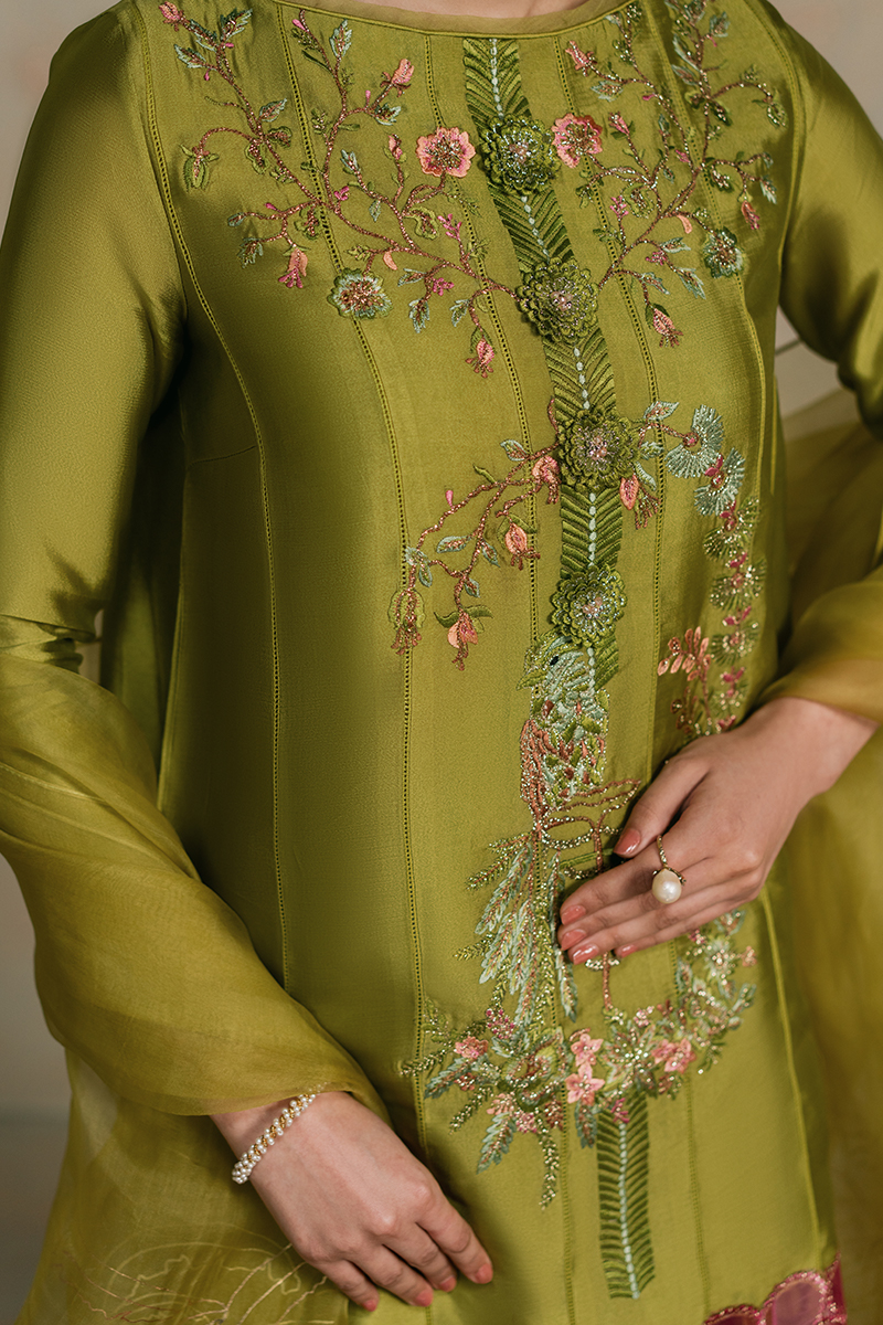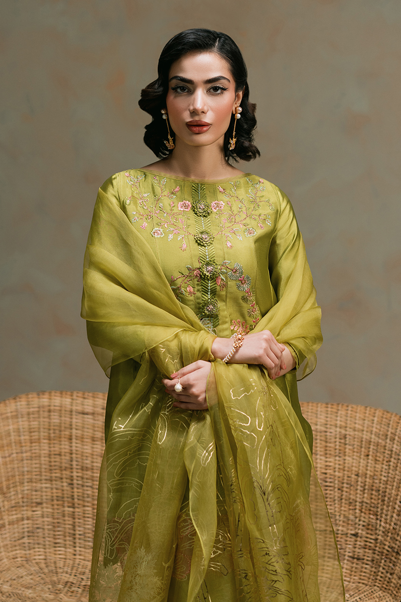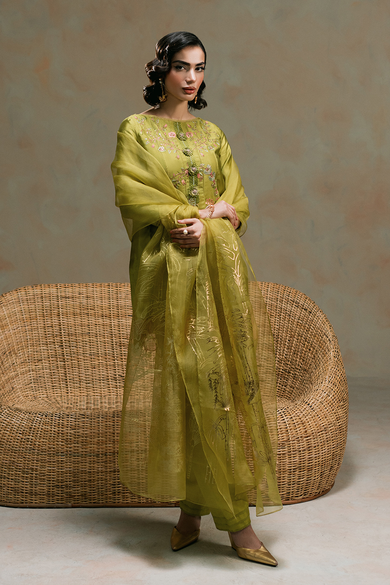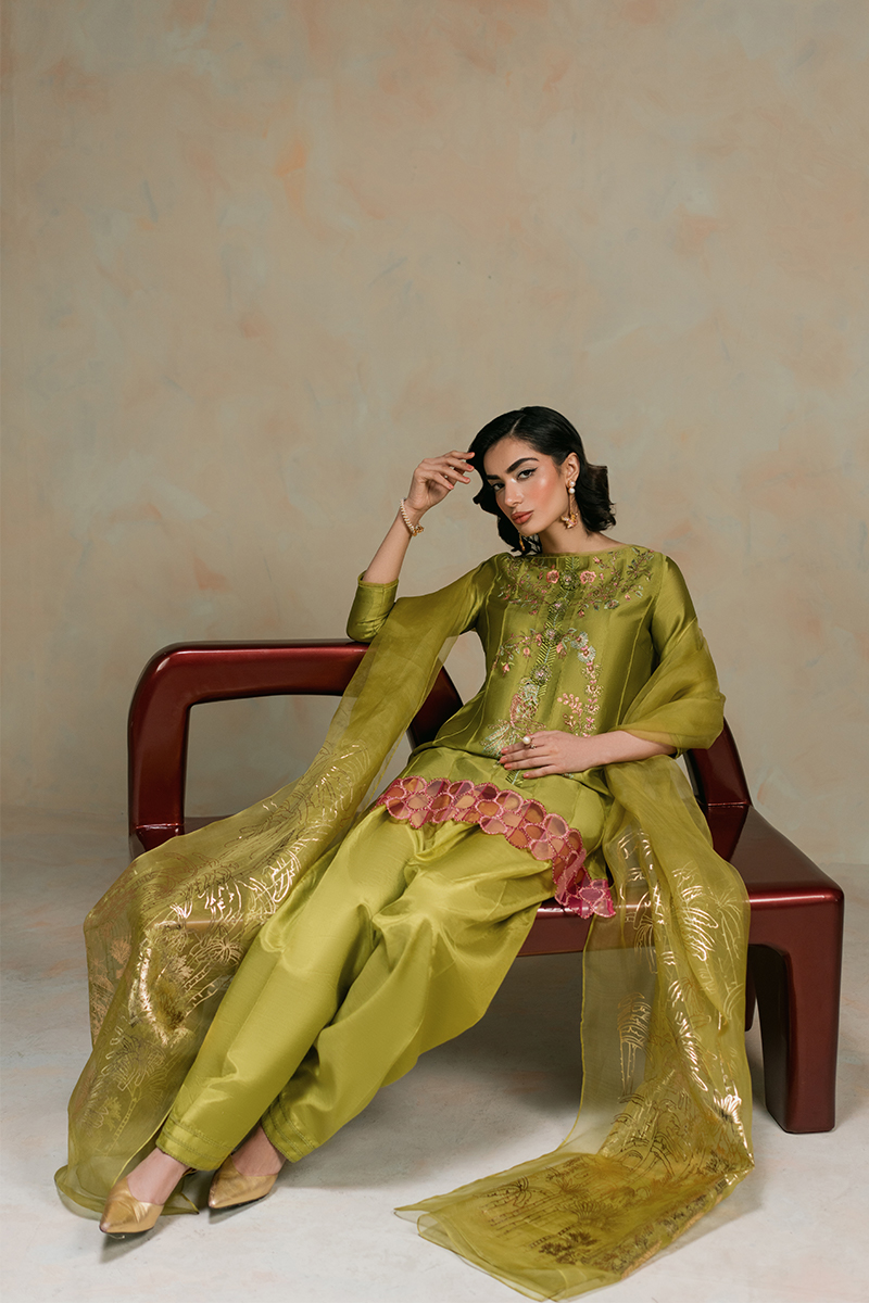 Goldie - a breath-taking ensemble in a delicate dull lemon green hue, crafted to embody effortless sophistication. Featuring a relaxed mid-thigh tissue silk shirt with a graceful boat neckline, adorned with exquisite floral embroidery and a chatta patti embroidered border, further enhanced with 3D floral motifs for a timeless touch. Paired with a desi-cut Thai silk shalwar, delicately finished with lace detailing, and a foil-printed organza dupatta, Goldie is the perfect blend of tradition and contemporary charm.