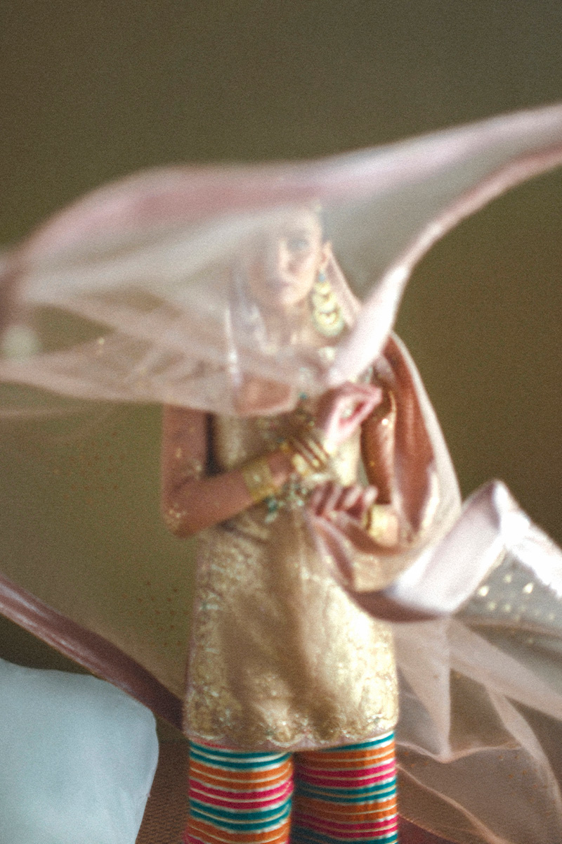 Hari Bhari - Rooted in tradition and refined with intricate craftsmanship, Hari Bhari features a boat neck short shirt beautifully hand embellished with intricate dabka, nakshi, sequins, pearls, crystals, and delicate French knots. The look is paired with flared chatta patti pants that bring a bold and festive edge to the ensemble. A net dupatta, softly adorned with a sequin spray and bordered with refined detailing, adds a graceful finish. Tassel accents at the back, along with lace and lappa inserts, complete this vibrant outfit designed for celebratory flair.