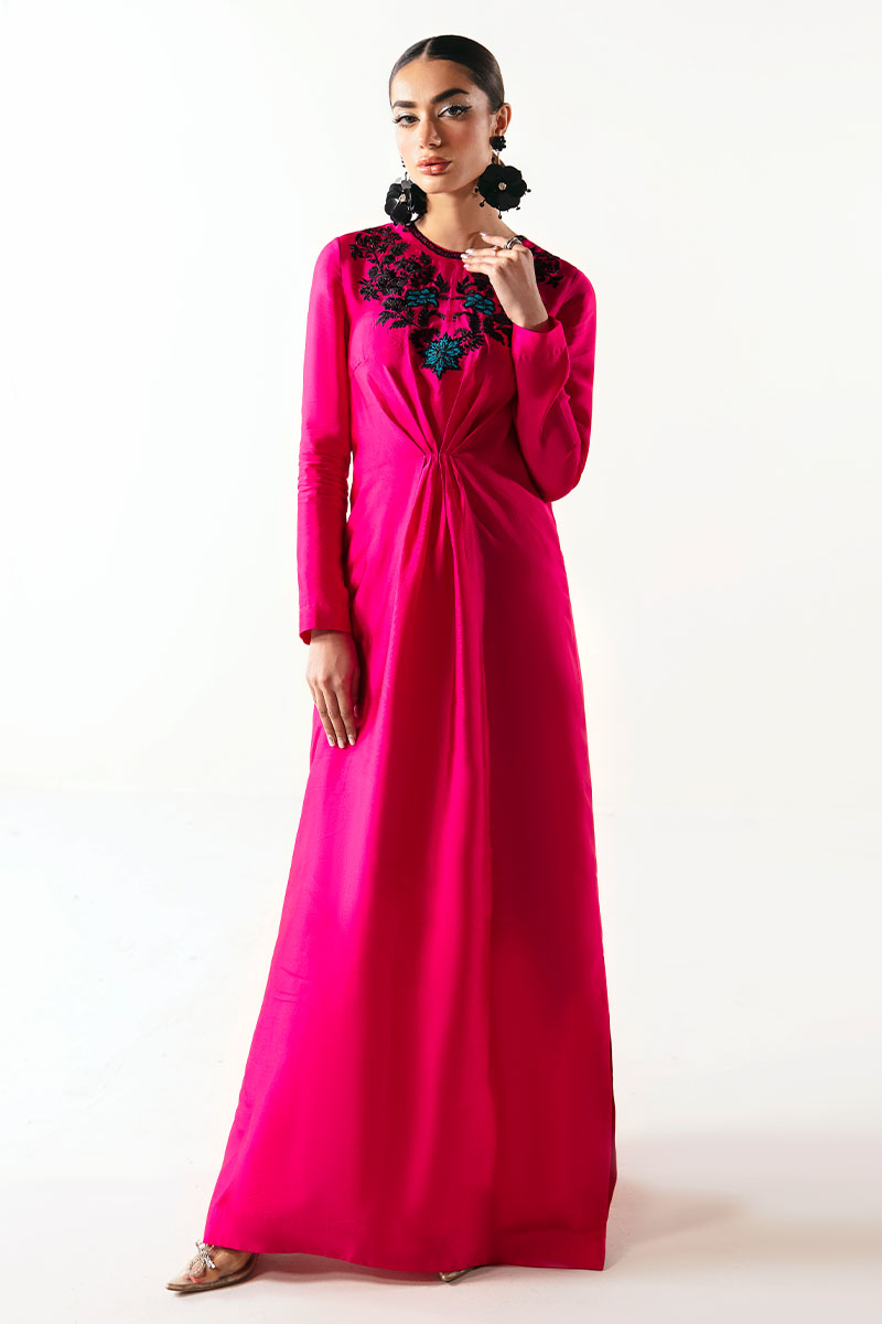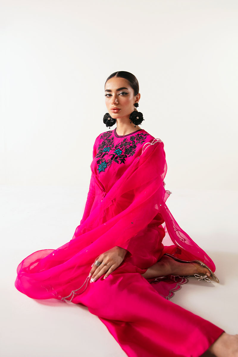 Dive into elegance with 'Hotfish' – a Fuchsia Pink Tissue Silk ensemble featuring an embroidered pleated kaftan dress, Thai Silk Cigarette pants, and a scalloped organza dupatta. This statement piece seamlessly blends craftsmanship with contemporary design, offering modern women a bold celebration of confidence and grace.