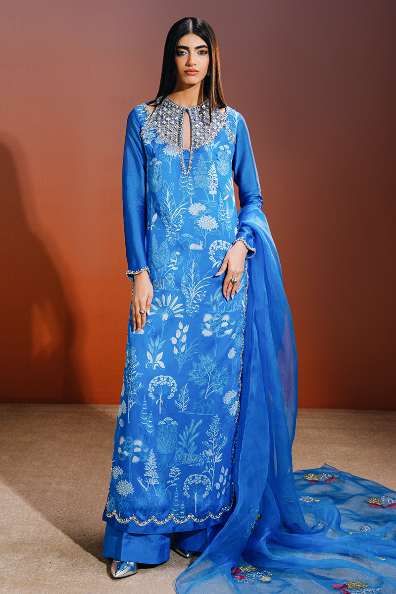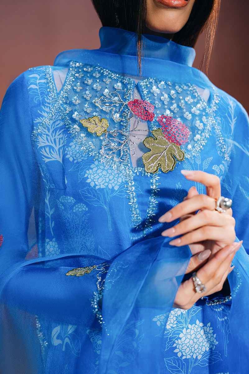 This “IT Girl” cobalt blue ensemble features a printed shirt paired with flared pants and a sheer organza dupatta for a striking, contemporary silhouette. The shirt is elevated with an exquisite hand-embellished neckline, adorned with crystals, sequins, and pearls, while solid scalloped borders with embellished edging grace the sides and hem. The sleeves are finished with a hand-embellished scalloped border, and the organza dupatta is beautifully highlighted with colorful embroidered motifs enhanced with delicate patchwork, completing a look that’s modern, chic, and effortlessly statement-making.