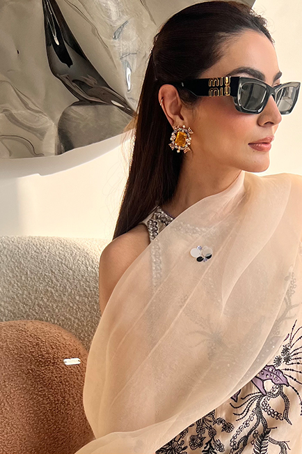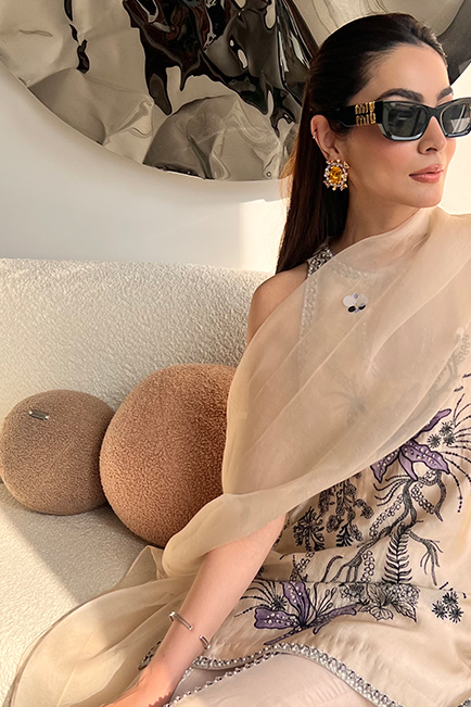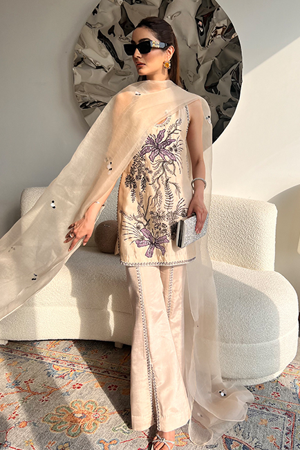 Boujee Me – A bold expression of luxury and style. This halter short shirt features waist-high slits and a keyhole neckline elevated with contrasting piping details, creating an effortlessly chic silhouette. The front is adorned with exquisitely hand-embellished borders, intricate embroidered florals, and patchwork details. Paired with boot-cut trousers, styled with a front slit and embellished borders running from waist to hemline, this ensemble redefines contemporary elegance. The look is completed with an organza dupatta, enhanced by asymmetrical embellished motifs, adding a unique flair. Boujee Me is designed for the unapologetic fashionista, embodying glamour and sophistication in every stitch.