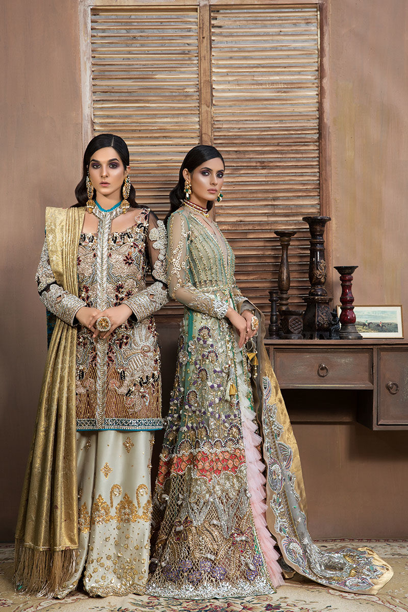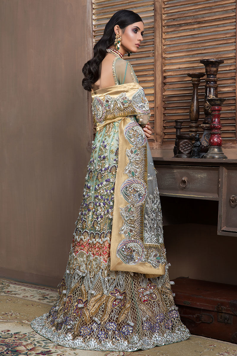 Chic long net gown in jade green color with high quality of pure hand embellishment. Materials used in embellishment are, mukesh, Swarovski stones, pearls, dabka, nakshi, thread of various colors, gota & patch work. All well crafted by hand. Shiny chunky borders are made in all pure Swarovski stones and skirt is finely stitched in ombre frills. It has a wide four sides dupatta border.