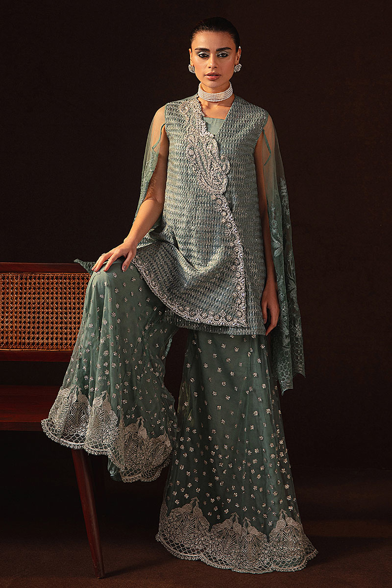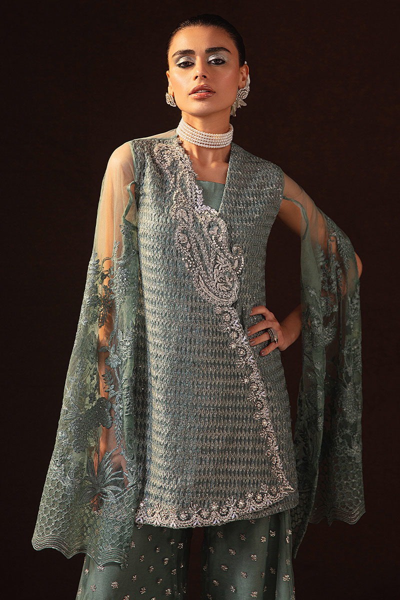 Embrace the enchantment of this gray-green beauty crafted in delicate net fabric. Adorned with intricate embroidery and sequin details, the JalPari ensemble features a mesmerizing overlapped shirt, flared trousers, and a separate inner blouse with spaghetti straps for a flawless fit.