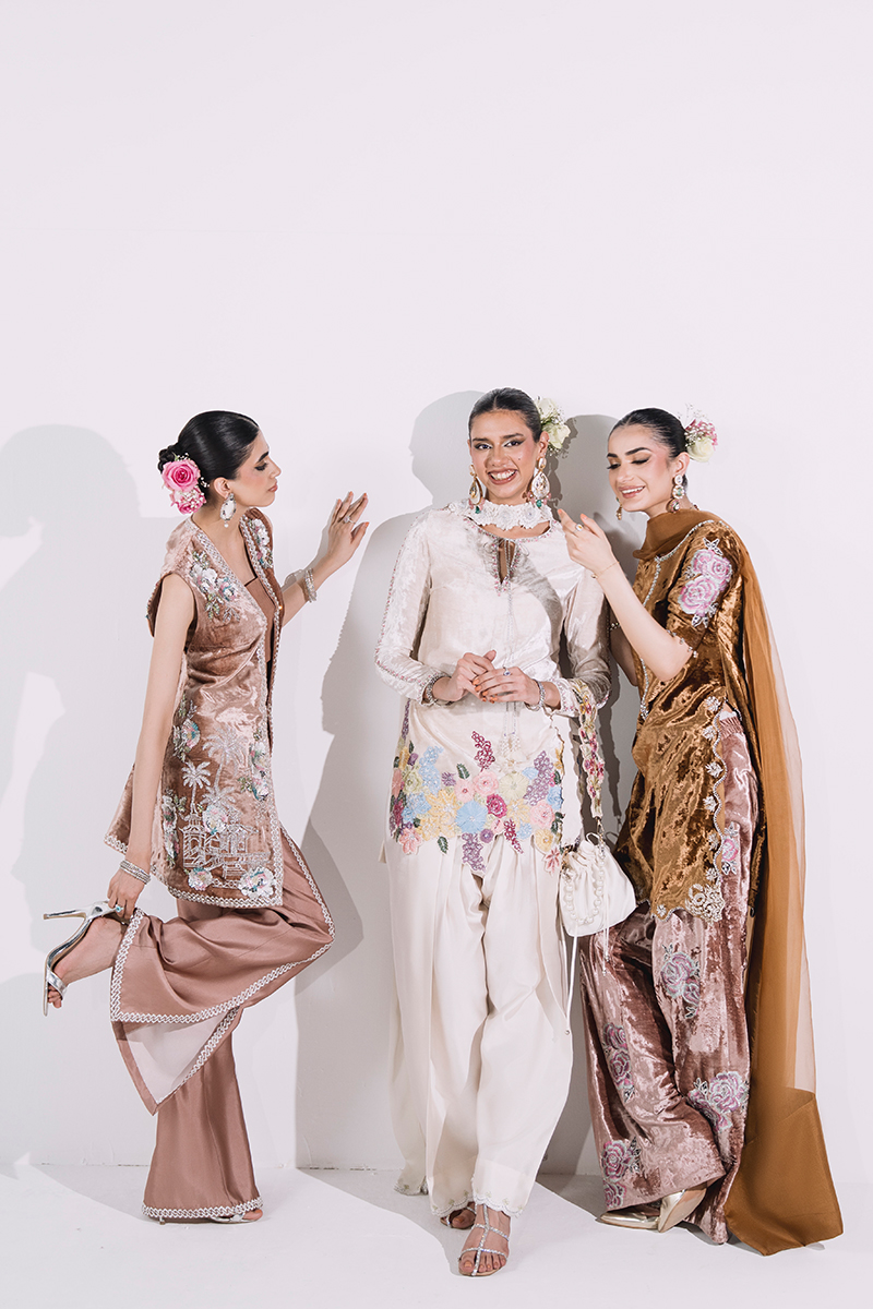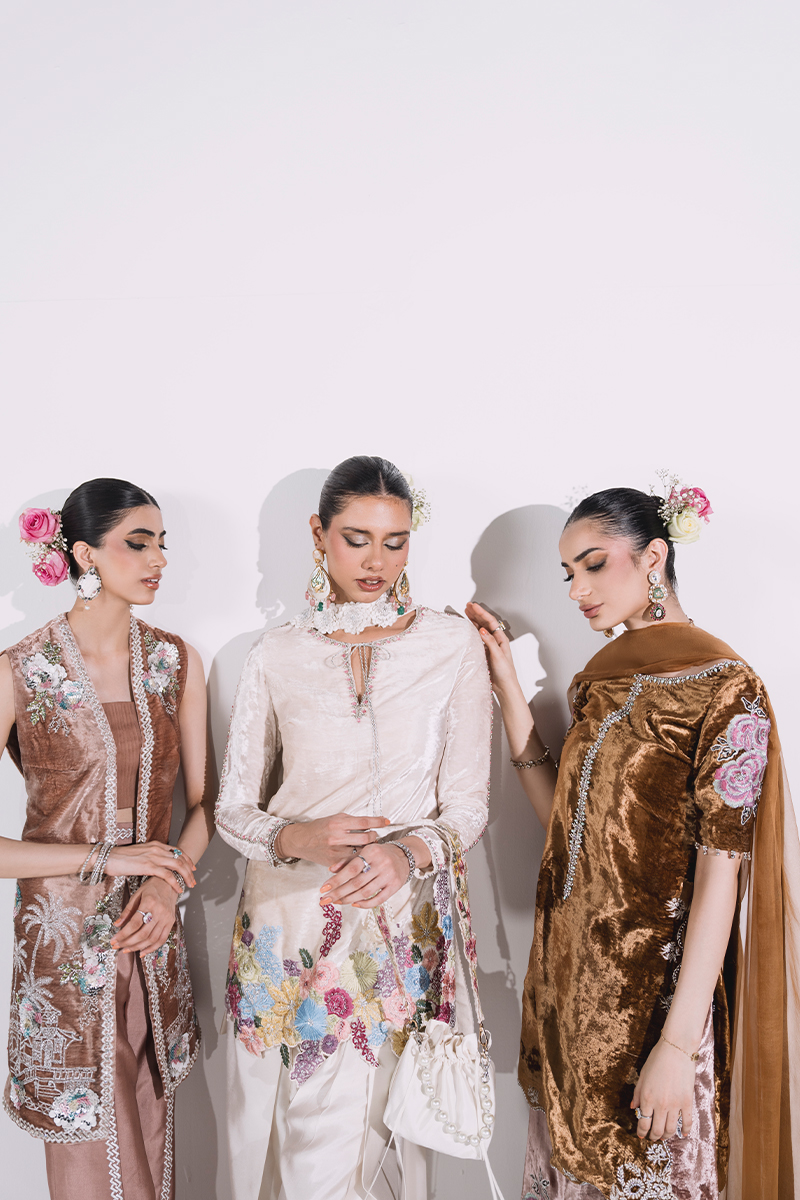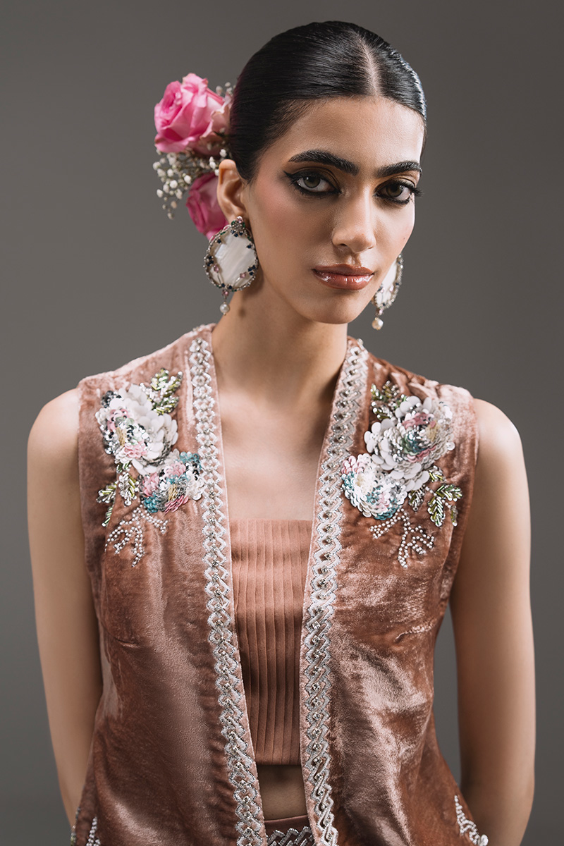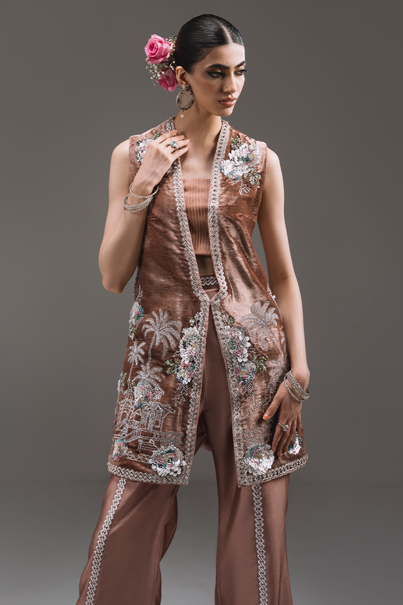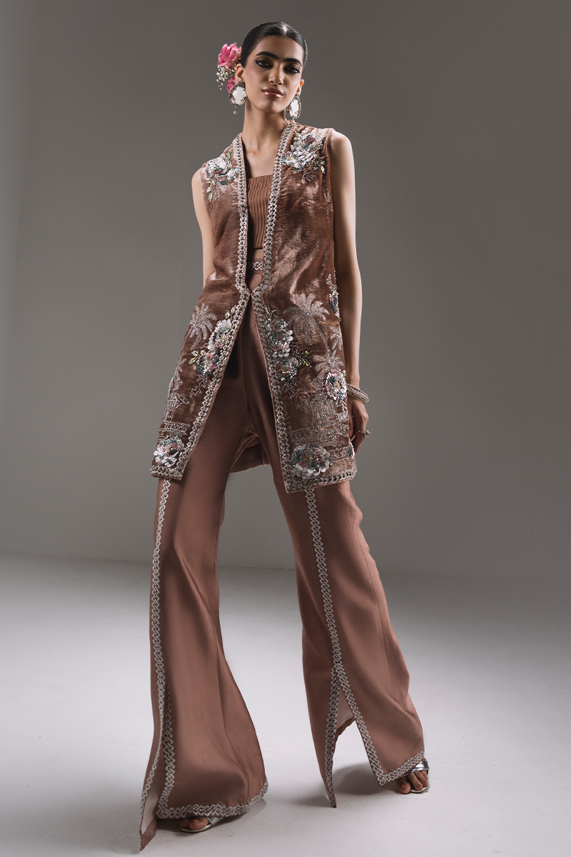 A contemporary front-open, mid-thigh sleeveless jacket intricately embroidered and embellished, featuring ornate border detailing on both front and back. Styled over a chic bustier and pleated organza under-body for added dimension and movement. Paired with tailored trousers finished with an embroidered border and front-slit detail, creating a sleek and modern festive look.