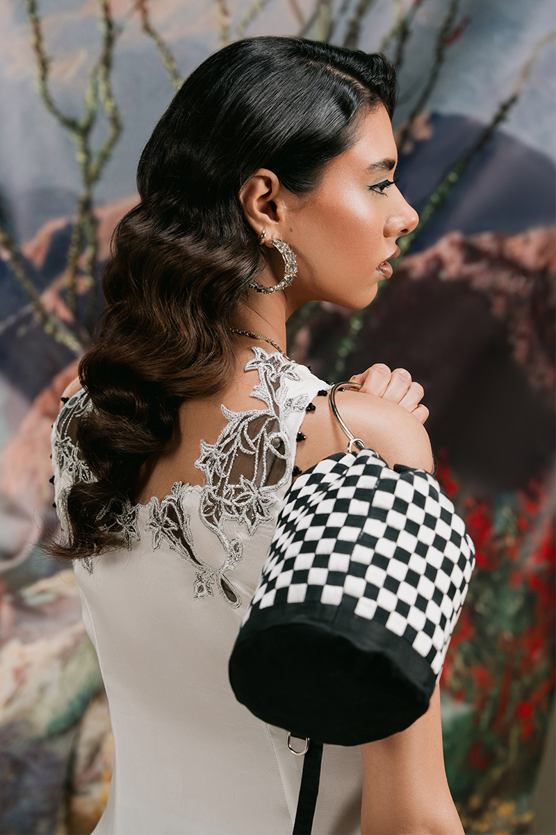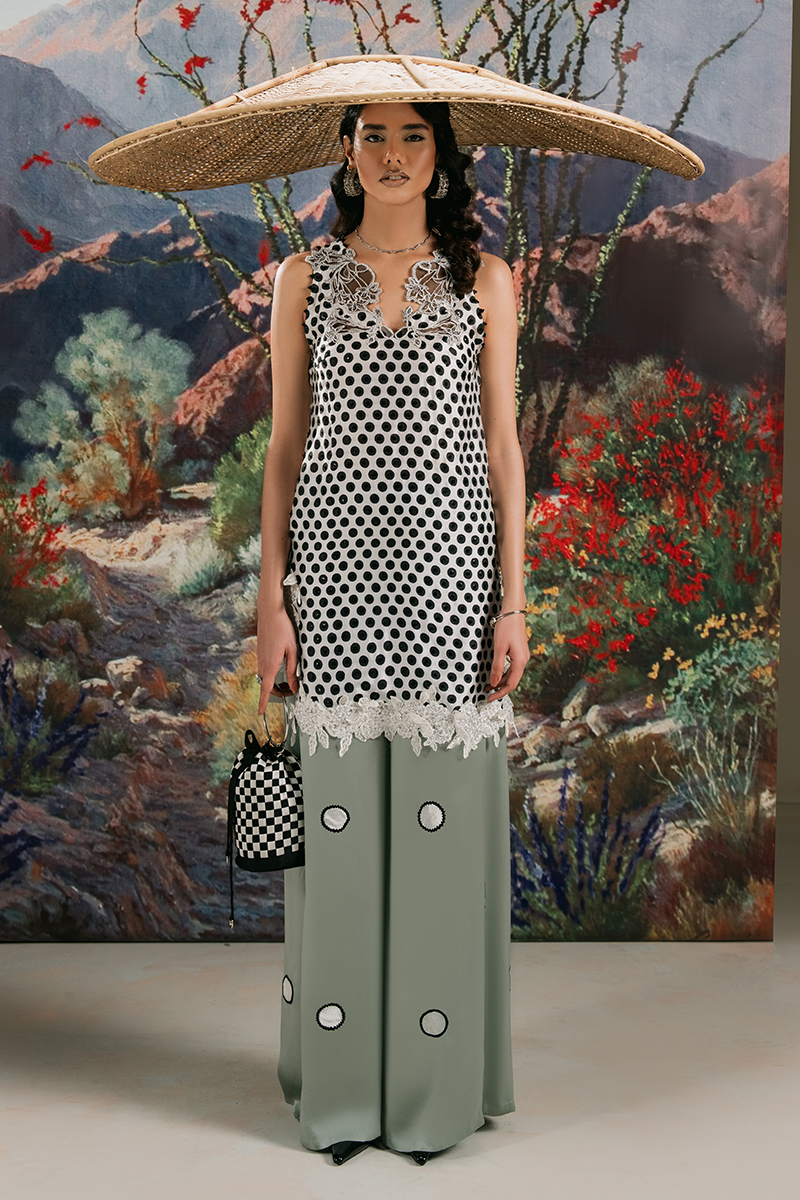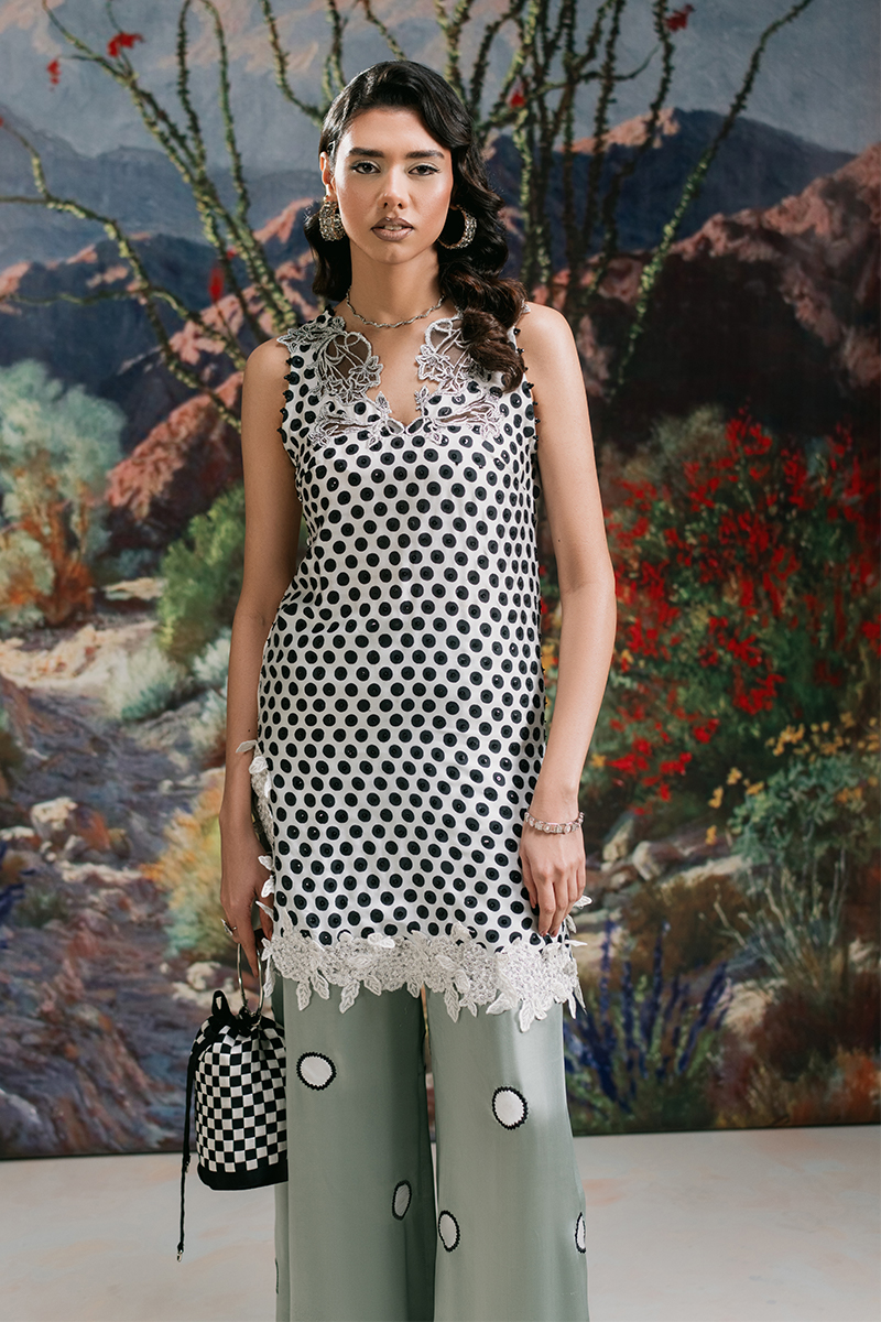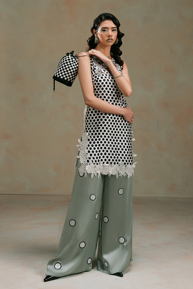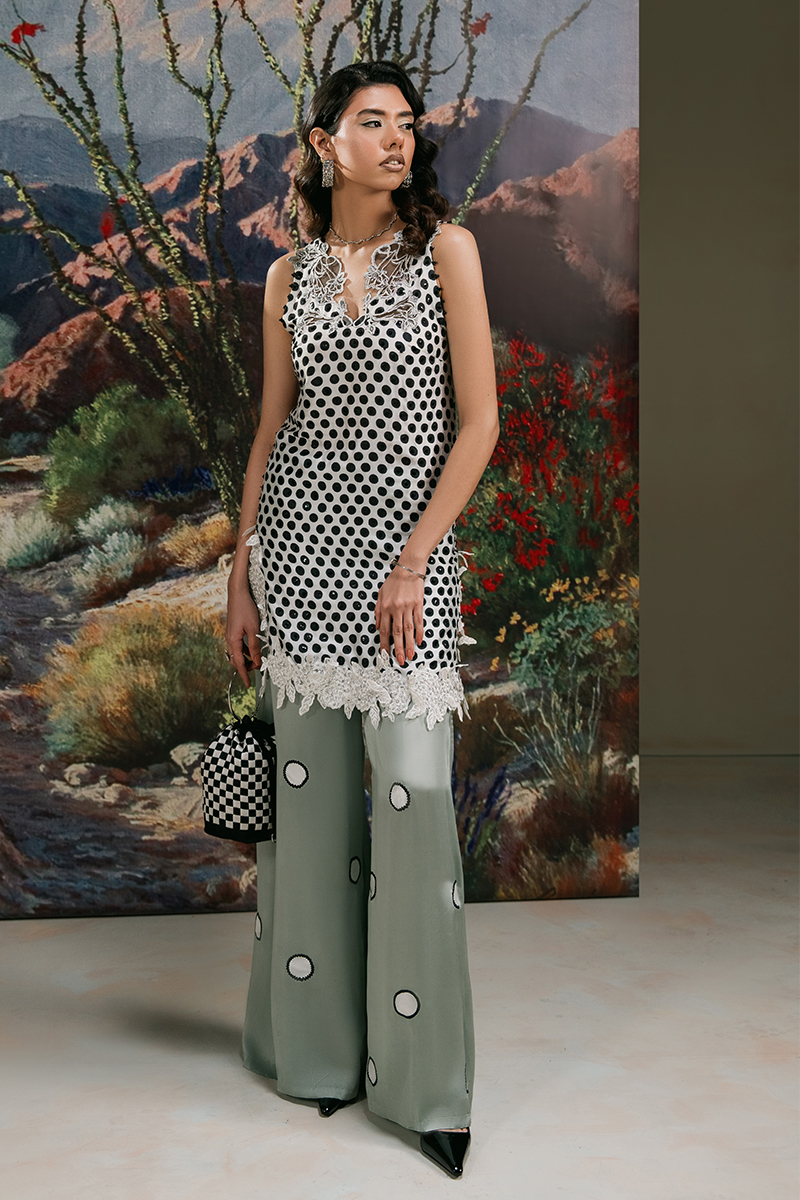 Jasmine - a vision of grace in pristine white, crafted from luxurious Chimose silk. The mid-thigh halter shirt features an exquisitely embroidered scalloped neckline, delicately adorned with sequined polka dots and a finely embroidered hemline for a timeless touch. Paired with loose-fit trousers, meticulously detailed with embroidered and patched polka dots, and complemented by a flowing medium silk dupatta, Jasmine is the epitome of effortless sophistication.