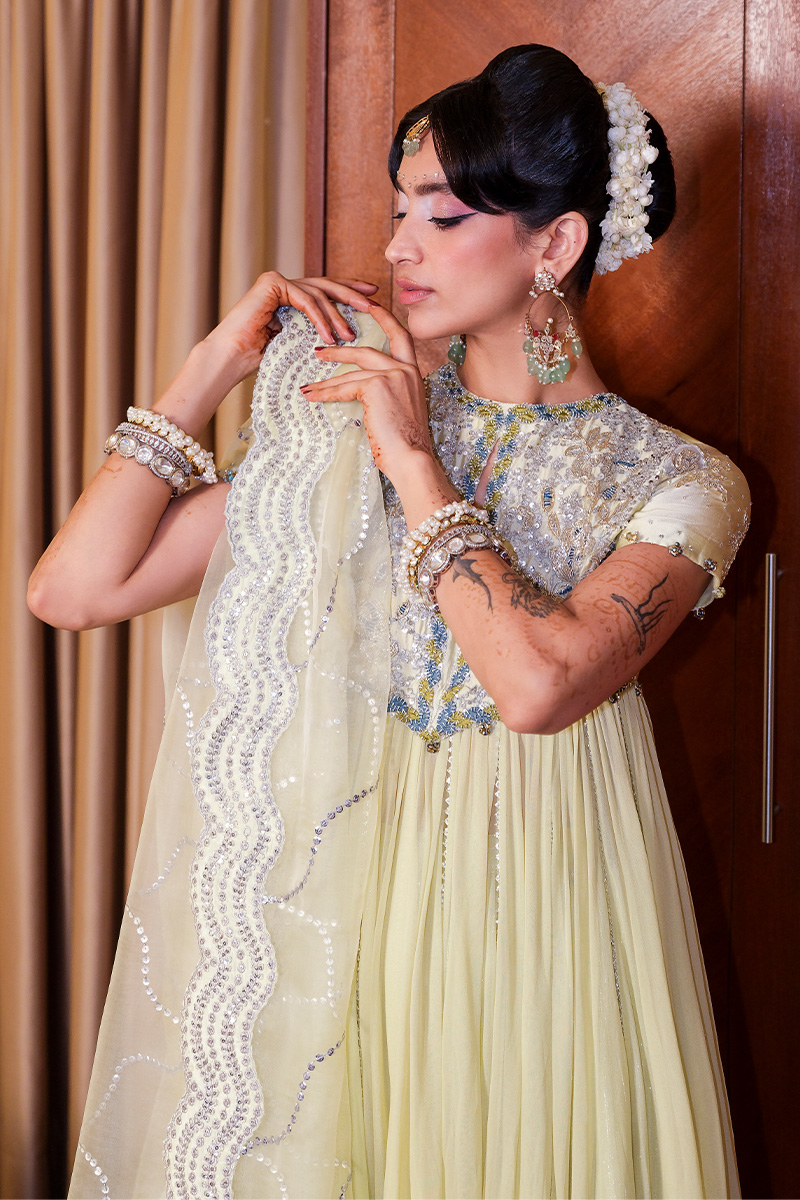 Jugnu Pari - In a radiant butter yellow hue, Jugnu Pari captures the essence of festive grandeur with a floor-length pishwas crafted in chiffon and tissue silk. Boasting an impressive fourteen yards of flare, the silhouette is enhanced with gathered detailing, a block-printed border, and hand-embellished sequins. The bodice is richly adorned with intricate embellishments and features a graceful front keyhole, paired with delicate embellished cap sleeves. A shimmer lehnga adds depth and glamour to the ensemble, while the organza dupatta, finished with scalloped sequin lines, borders, lappa, and gleaming accents, completes this luminous look made to dazzle.