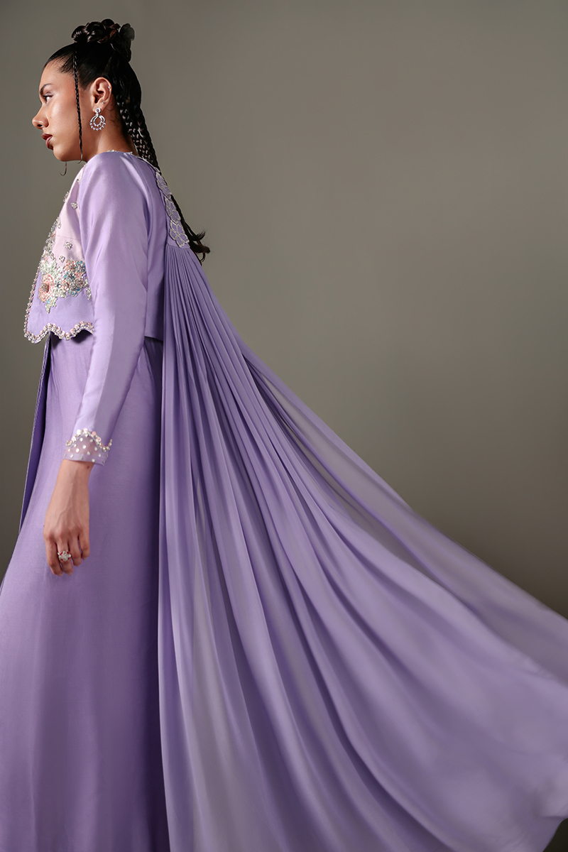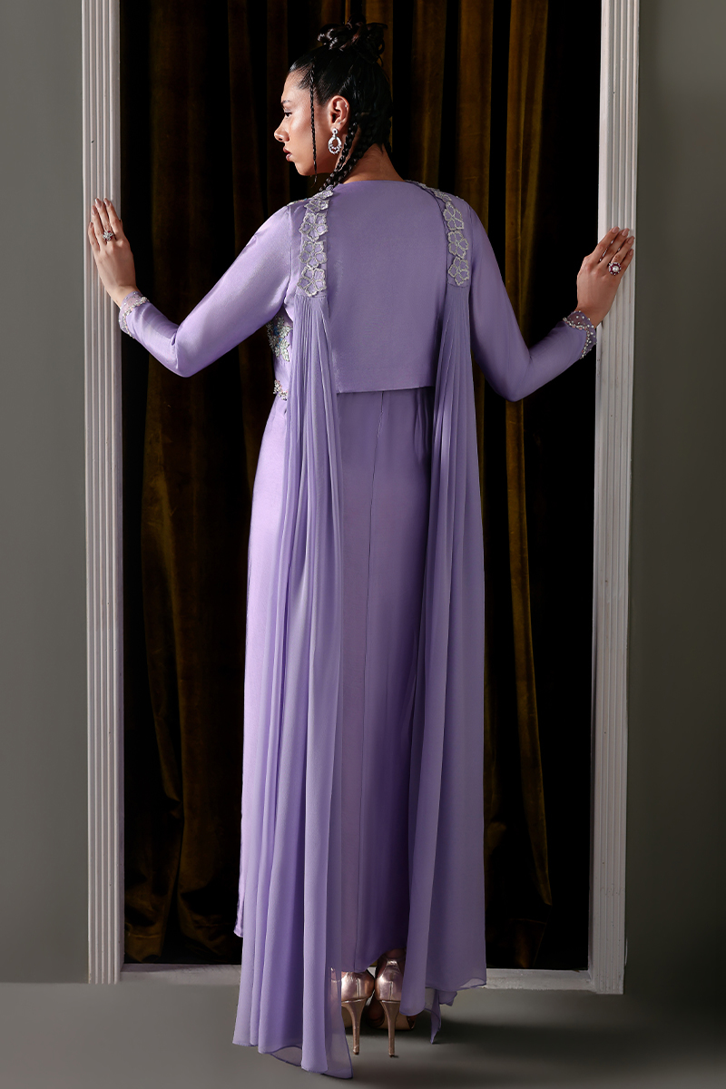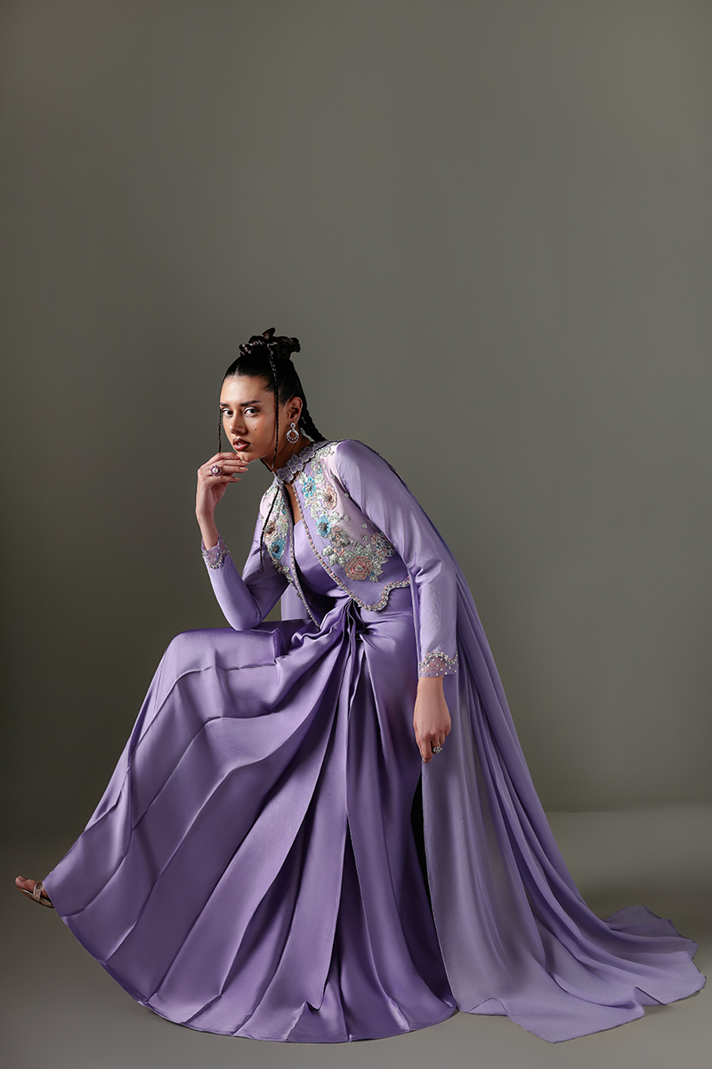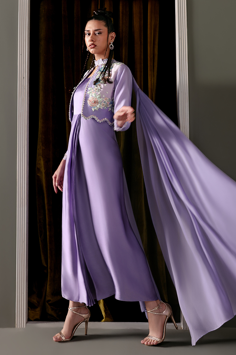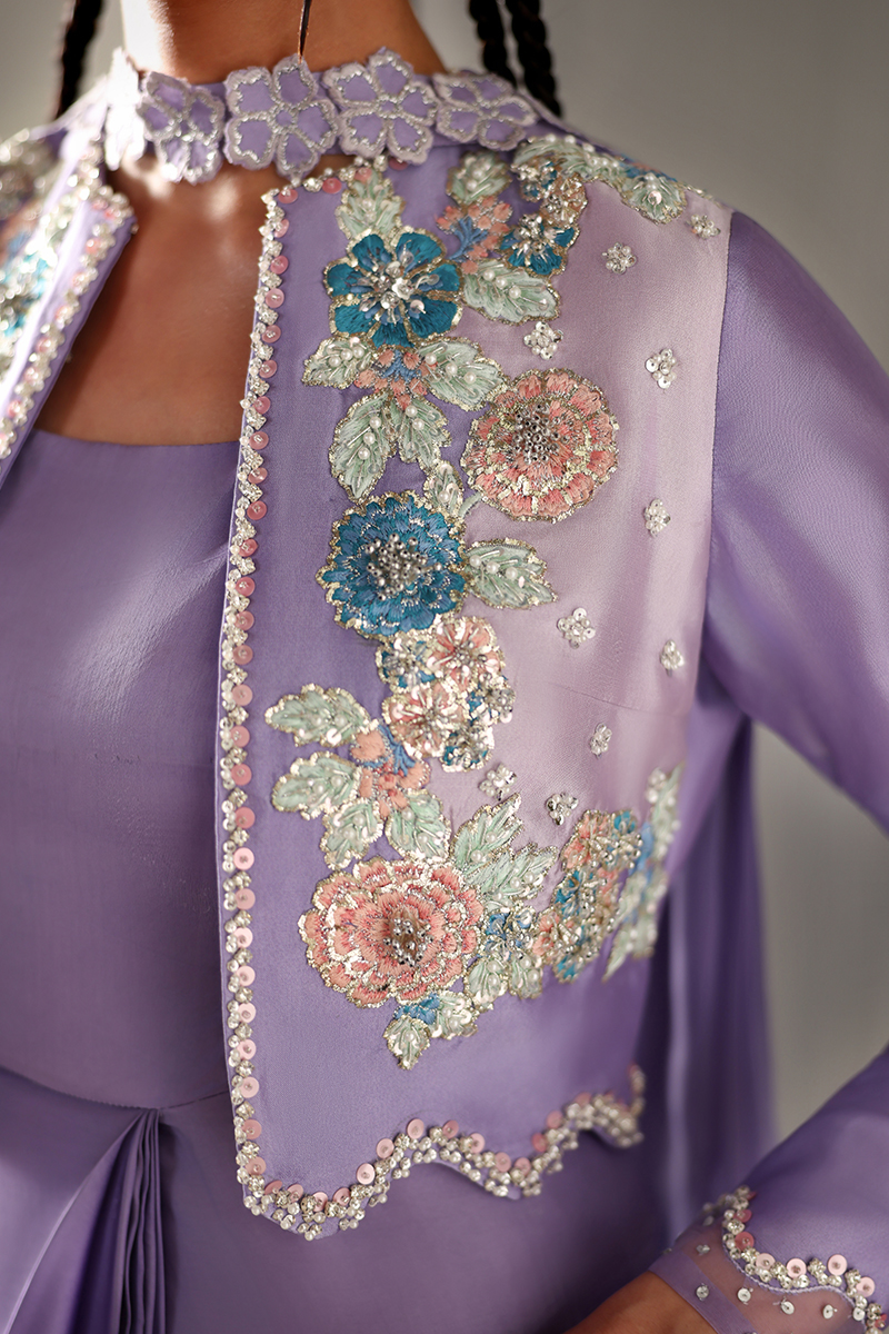 It includes jacket and silk dress. A front-open jacket layered over a pleated, flared one-piece silk dress, adorned with intricately hand-embroidered floral borders.Embellished with crystals, sequins, and beads, featuring leatherwork sleeves and scalloped edges with delicate crystal hangings.Paired with a pleated chiffon dupatta, beautifully finished with embroidered floral detailing.