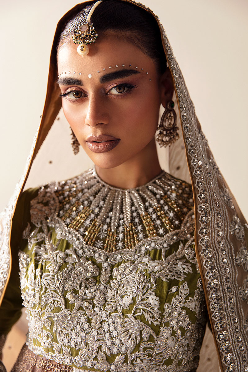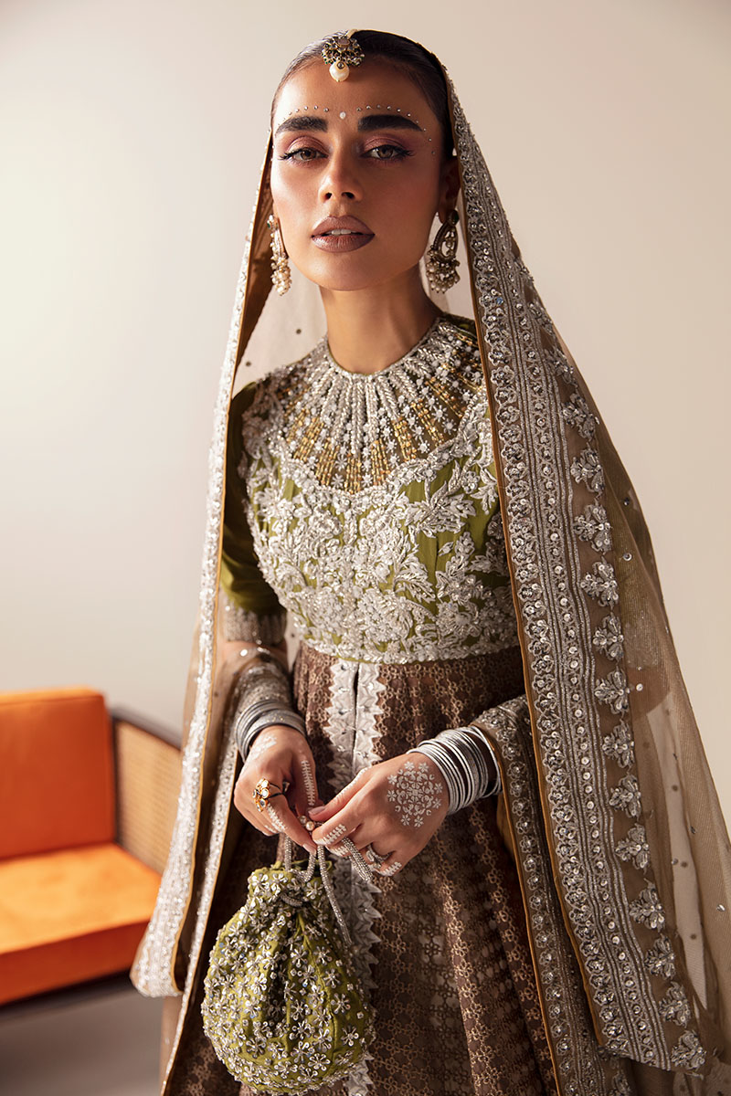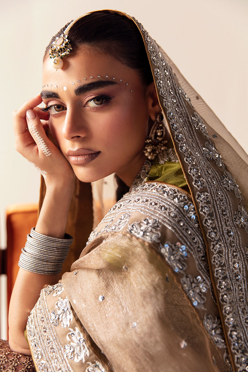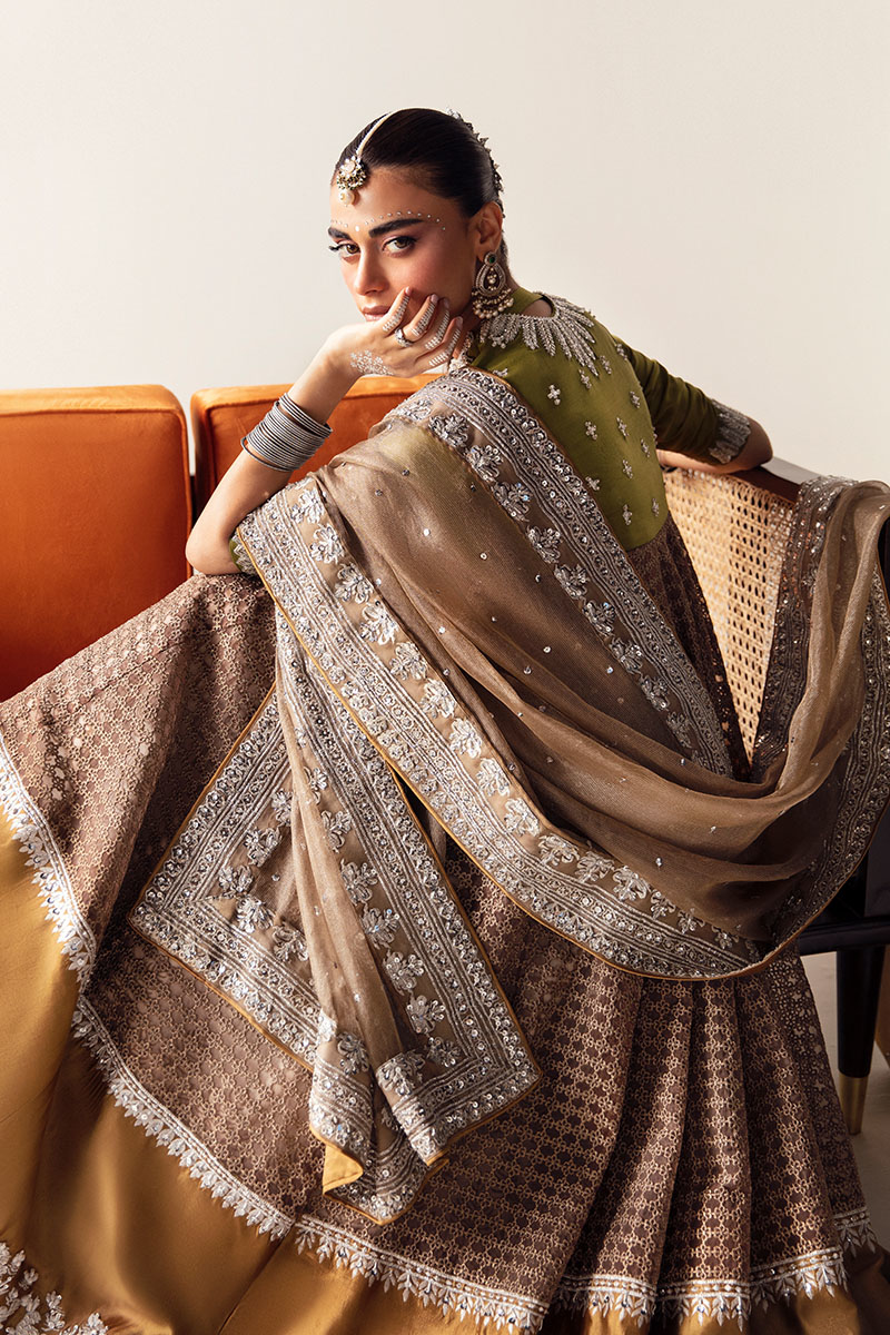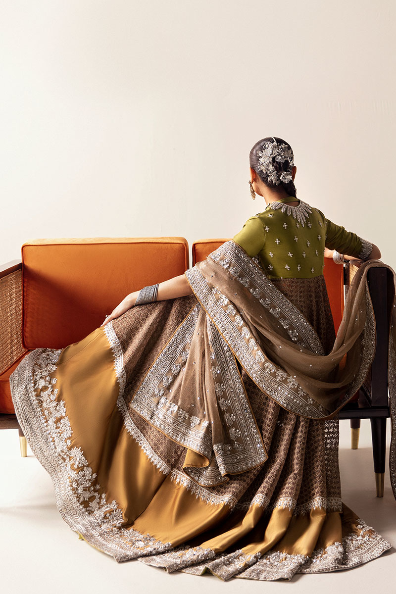 Discover the charm of the Kanwal, where a charming symphony of colours is created by the alluring combination of copper, mustard, pea green, and off-white. This beautiful ensemble features a long, flared Peshwas made of pure raw silk that has been painstakingly embellished with delicate details. The Peshwas is paired with an exquisitely embroidered raw silk blouse in a stunning shade of green. An off-white flared trouser adorned with an elegant block print and an air of grace completes the ensemble. The zari organza dupatta gives an intriguing shine and enhances the whole look of the set with its rich four-sided border and delicate spray. The Kanwal set impresses for its exquisite craftsmanship and attractive mixing of fabrics and colours.