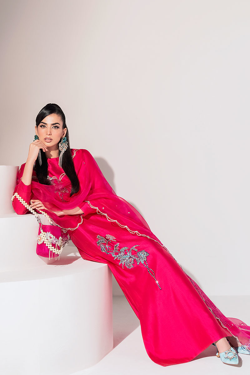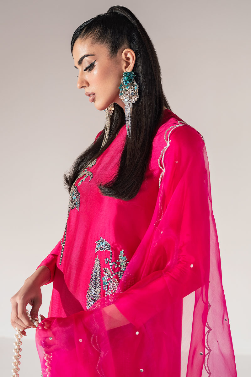 The bold and vibrant hawt pink long Kaftaan dress in tissue silk fabric is a true statement piece. Crafted with intricate silver embellishment on black thread, this ensemble is designed to make you look feminine and glamorous. The hawt pink matching organza scalloped dupatta perfectly complements the outfit.