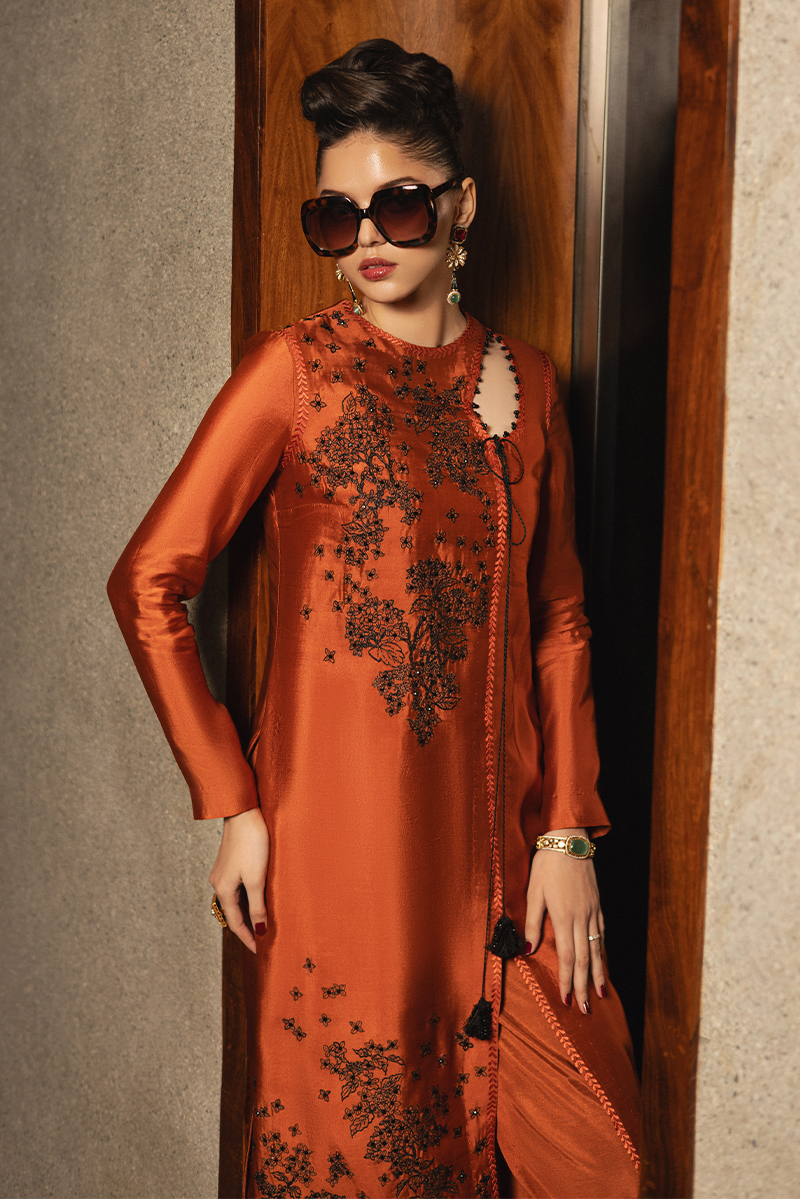 Lady Garden – A celebration of refined elegance and modern charm. This exquisite ensemble features a long, round-neck shirt adorned with intricately embroidered floral bunches, elevated by a delicate keyhole detail and playful dori tassels for added flair. The straight-fit culotte boasts a contrasting floral-embellished border, creating a perfect balance of subtle and striking details. Completing the look is a sheer organza dupatta, adorned with a sparkling sequin spray, adding just the right touch of luxury. Lady Garden is designed to exude sophistication and grace, making it the ideal choice for your statement-worthy moments.