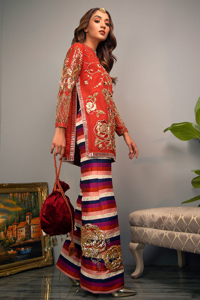 Boxy fit shirt with side long slits. Fitted sleeves with crew neck. Paired with bootcut pants. (Plain dupatta can be added on demand) hand embellishment with pita work and 3D sequence work in gold