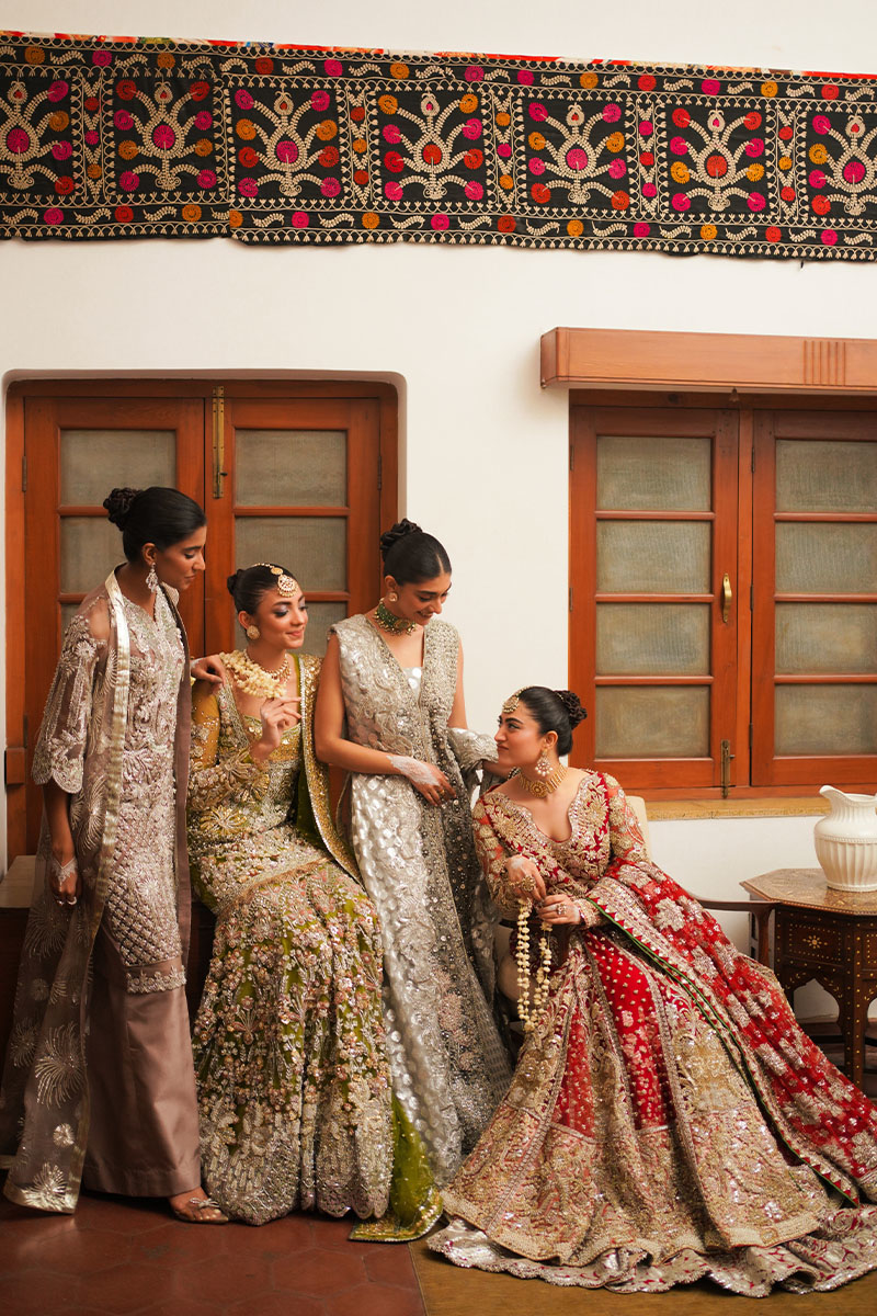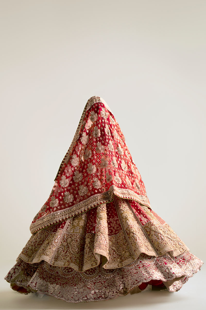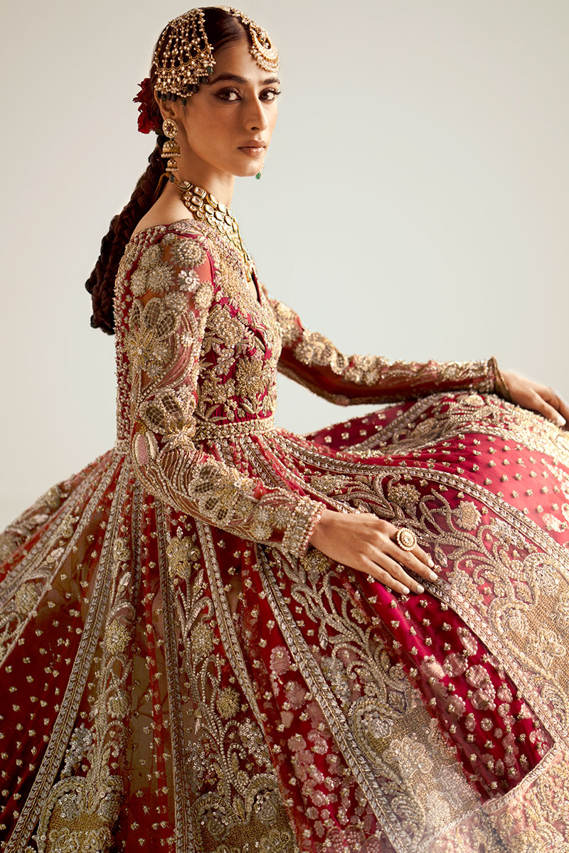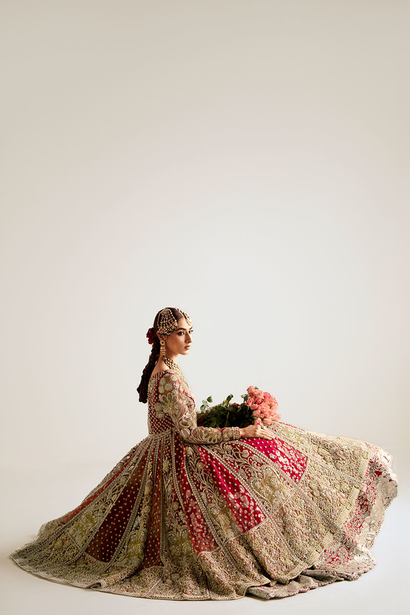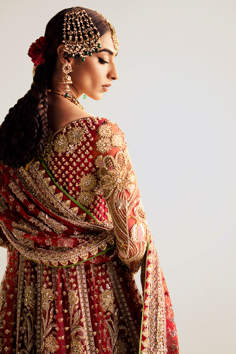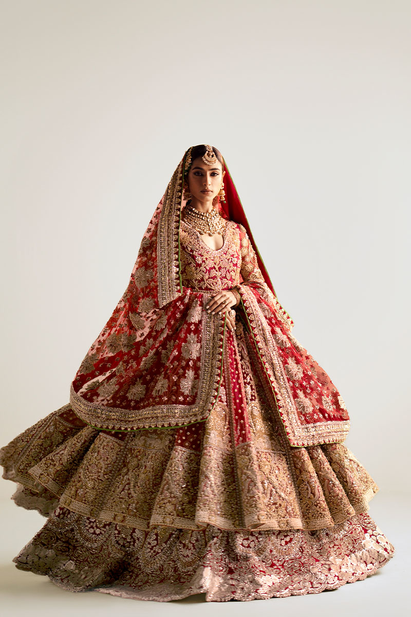 This exquisite bridal outfit is rendered in a beautiful shade of classic red. It comprises a 21-paneled classic red pishwas, hand-embellished with gold and silver embroidery, traditional nakshi, dabka, sequins, and shiny stones. The pishwas is crafted from net, while the bodice and lehnga are made from pure raw silk, creating a harmonious blend of textures. The lehnga boasts a captivating flare, making a bold statement at any event. To complete this regal look, the dupatta features heavy hand embellishments and a four-sided border with intricate boti chan detailing. "Lalpati" is a celebration of classic red, tradition, and artistry, embracing a timeless style that embodies the grandeur of the ages.