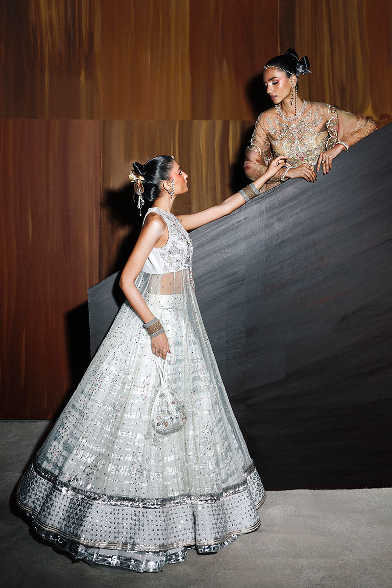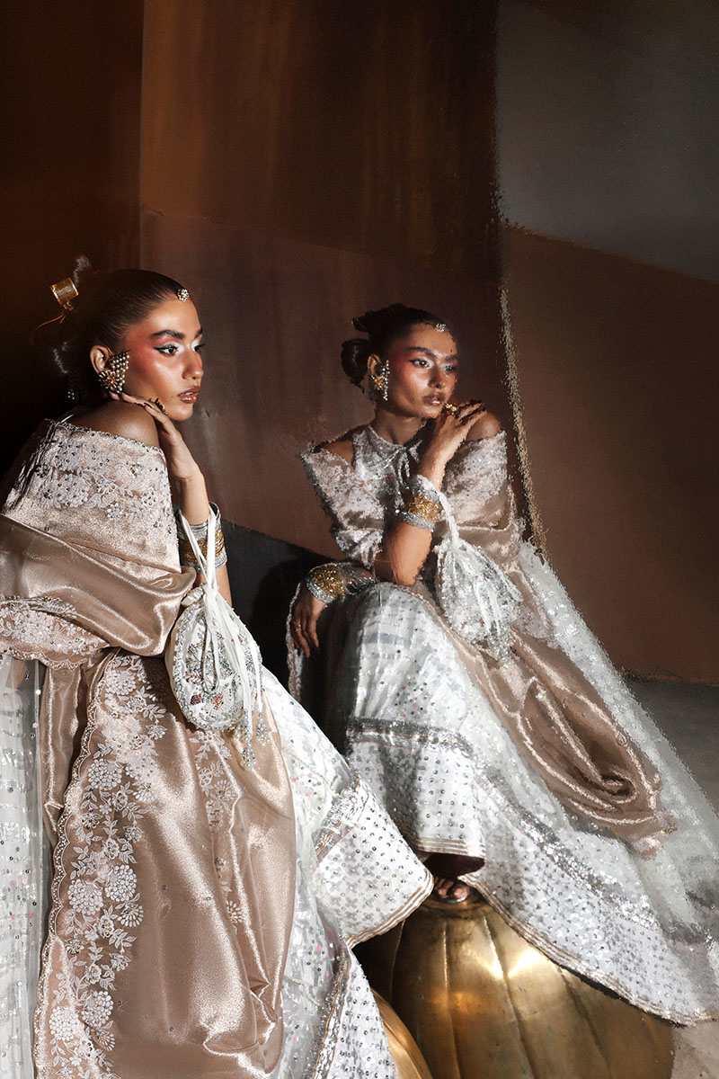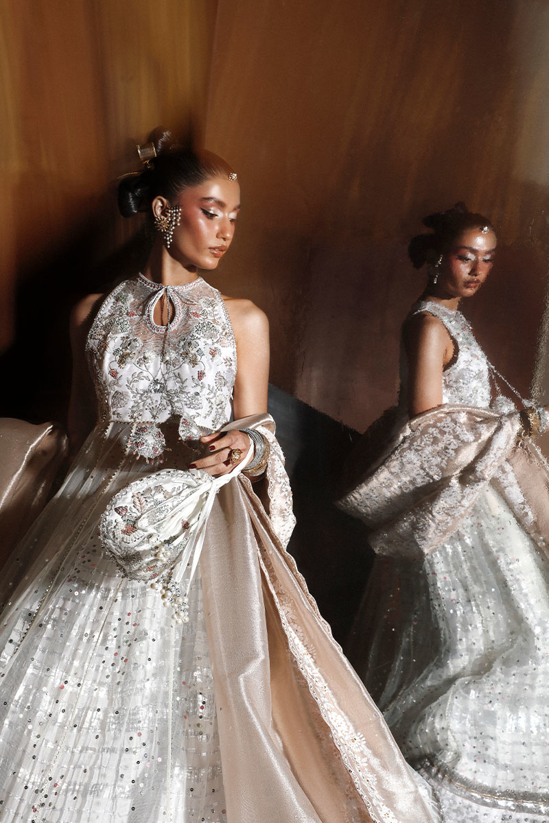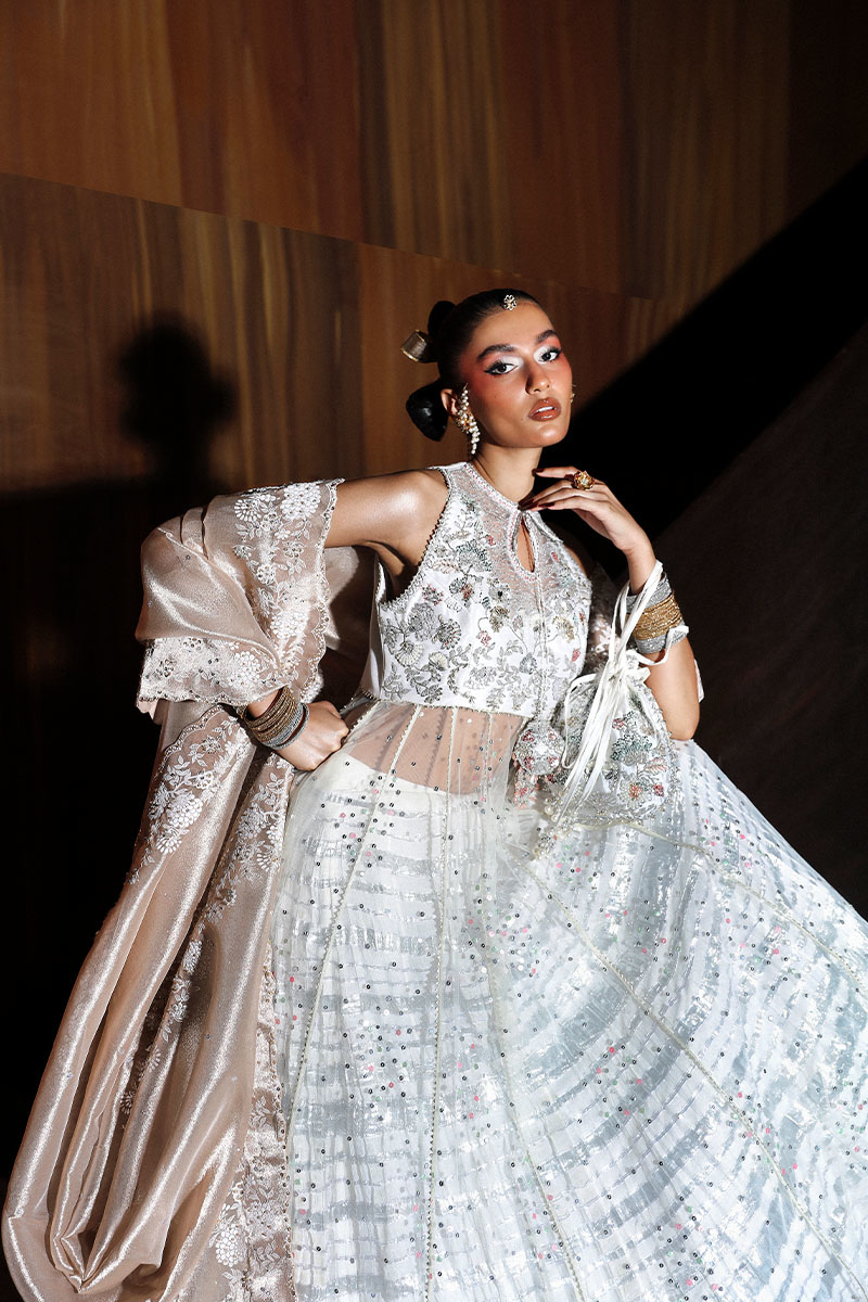 An exquisite ensemble featuring a halter neck embellished peshwas paired with a crushed white lehnga and a rose gold tissue dupatta. The peshwas is adorned with delicate floral motifs and a sequin-sprayed flare, while the lehnga boasts subtle lappa detailing. The tissue dupatta, with its emboss print and hand embellishments, adds the perfect touch of elegance, making Layla a timeless choice for the modern bride.