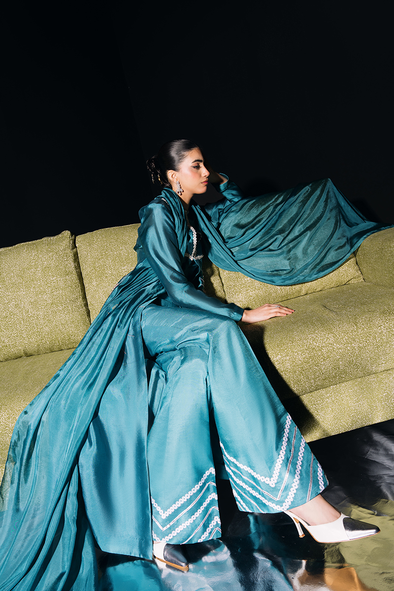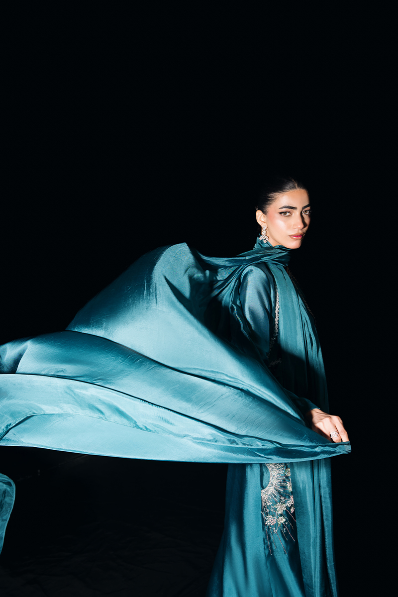 Fabric: Jacket (Tissue Silk), Trouser Bustier (Thai silk), Dupatta (Silk) Color: Peacock Blue Work Details: Embroidered and Embellished